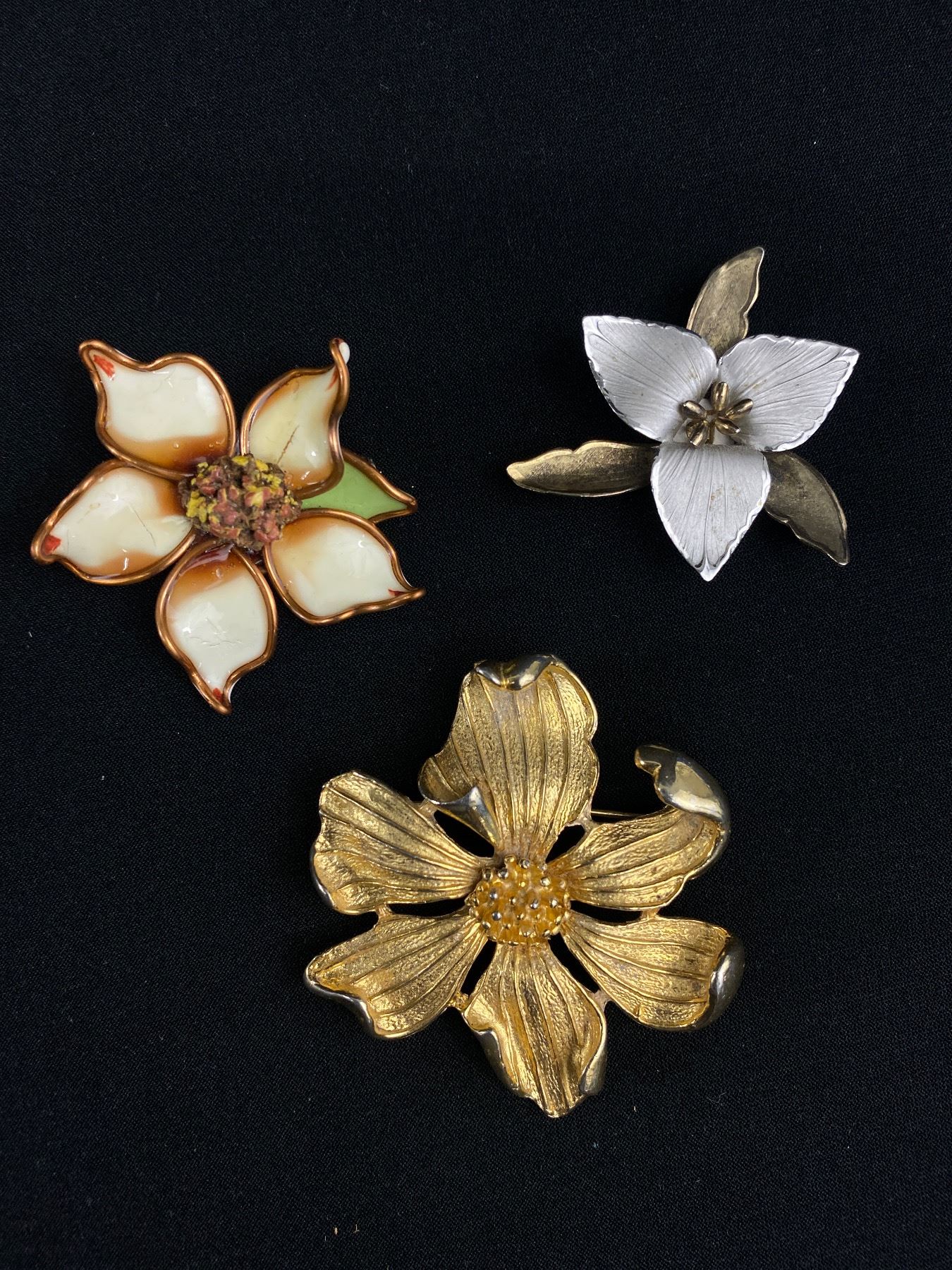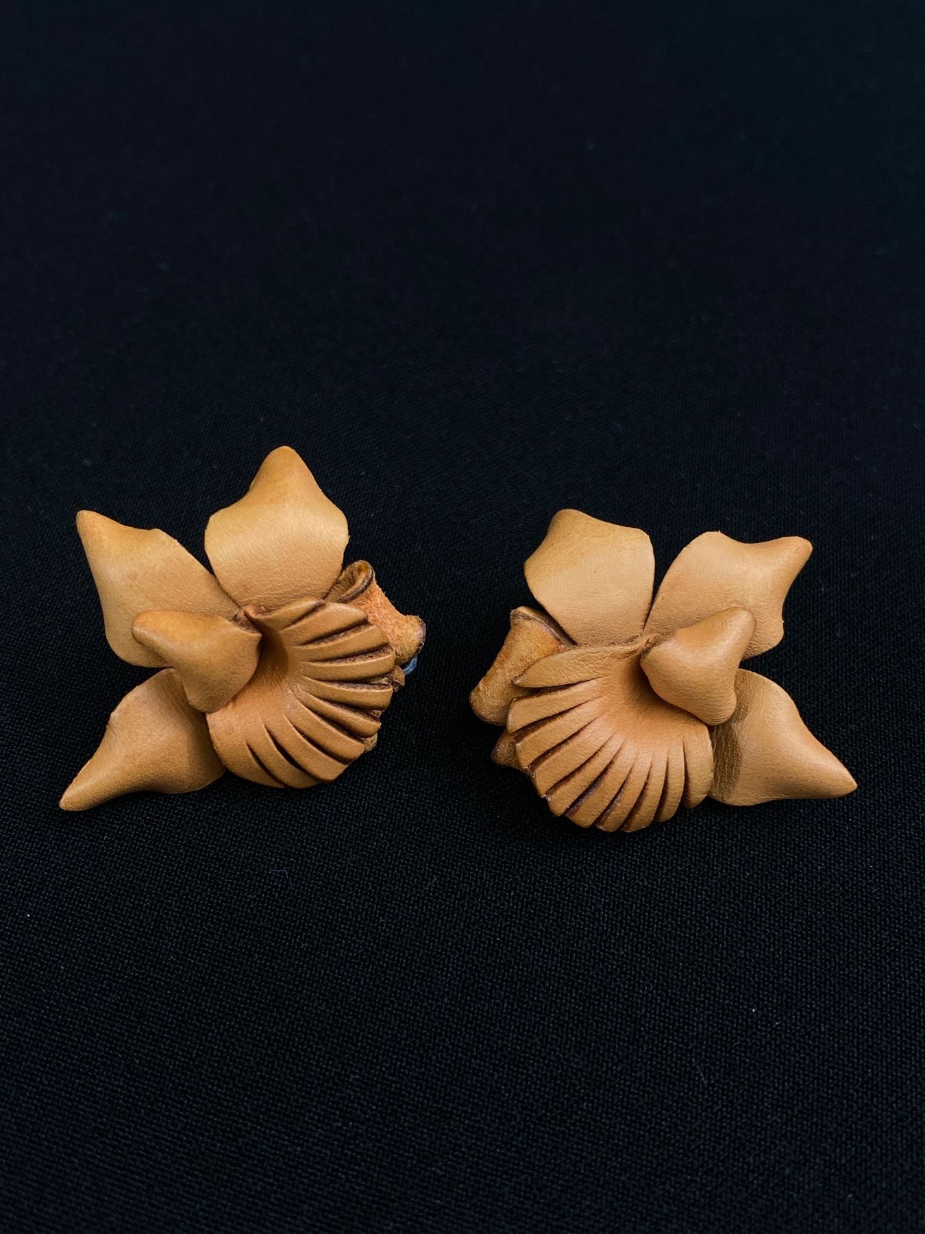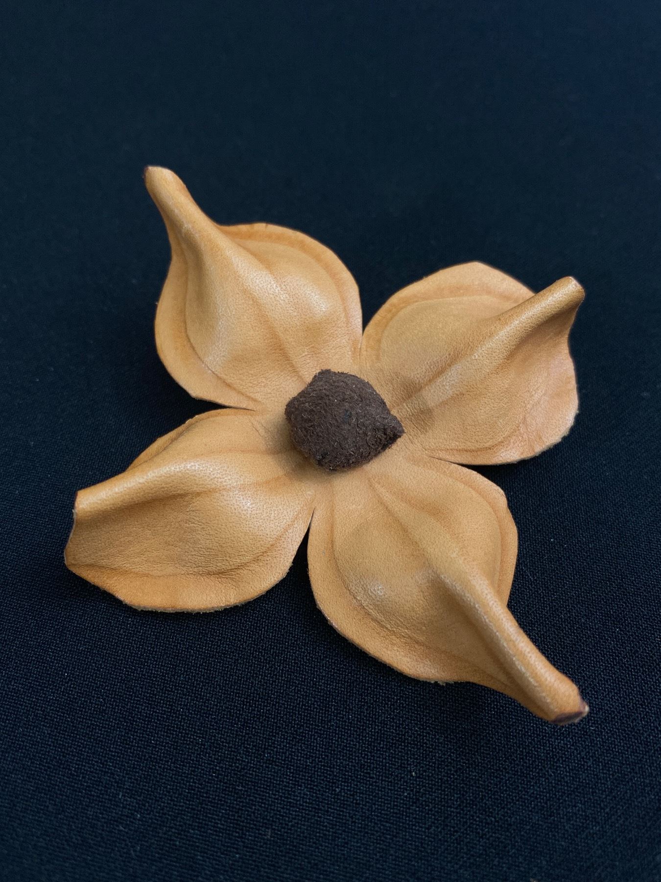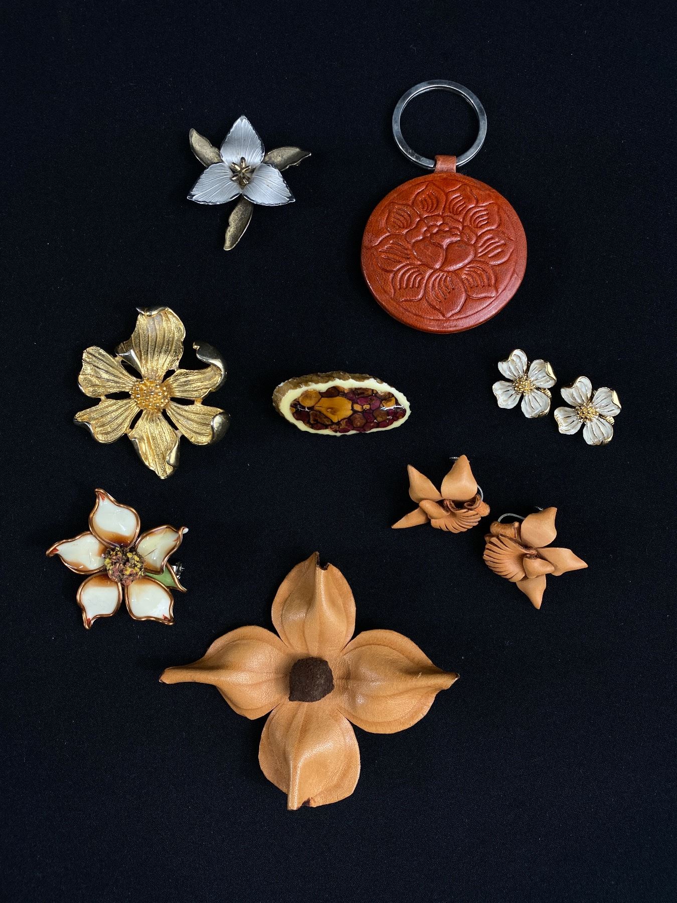 Leather Dogwood and Other Vintage Brooches. Leather Keyring Plus 1 Other Brooch Plus Leather Orchid Screw Back Earrings, and Leather Dogwood Clip Ons
