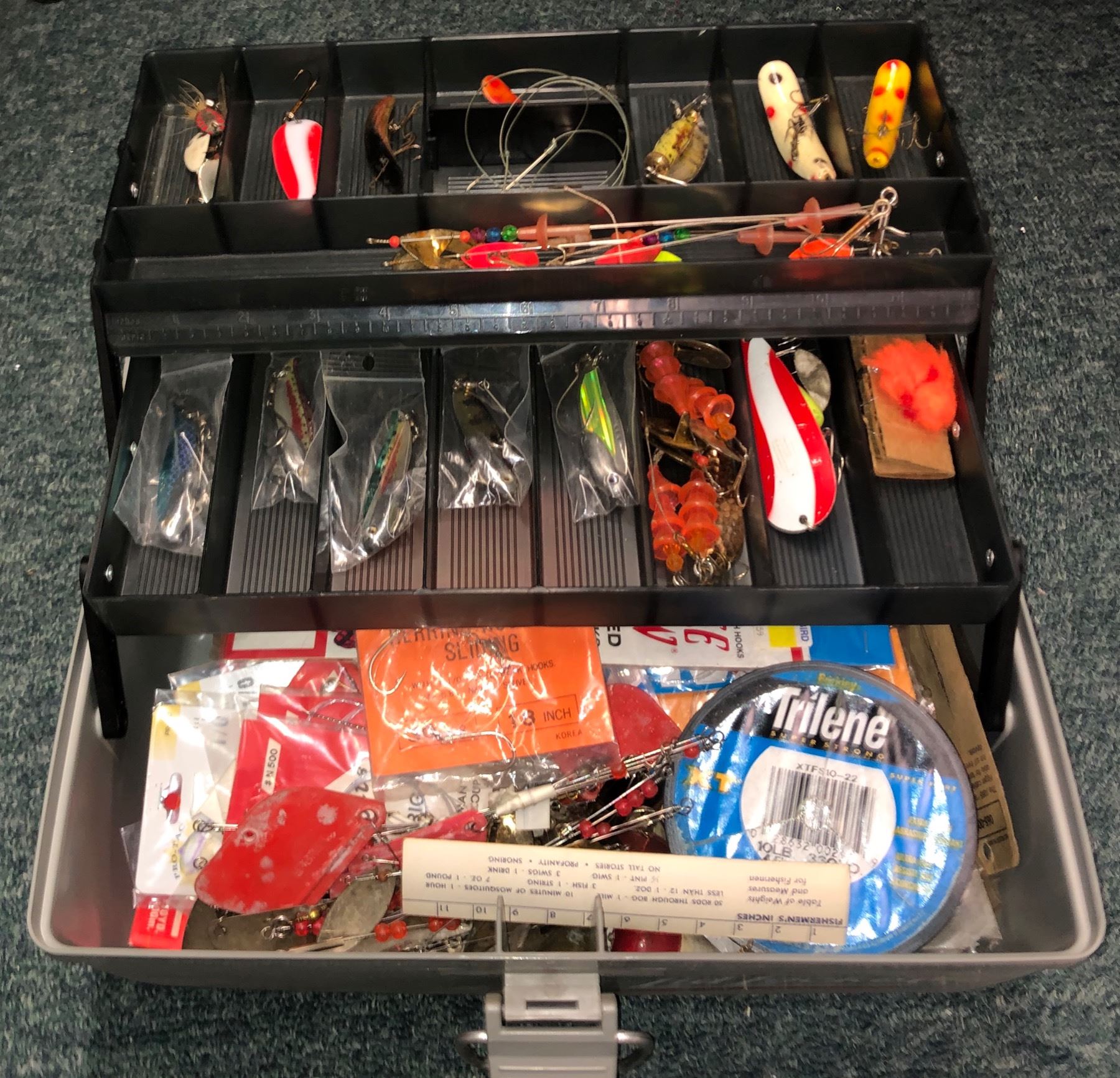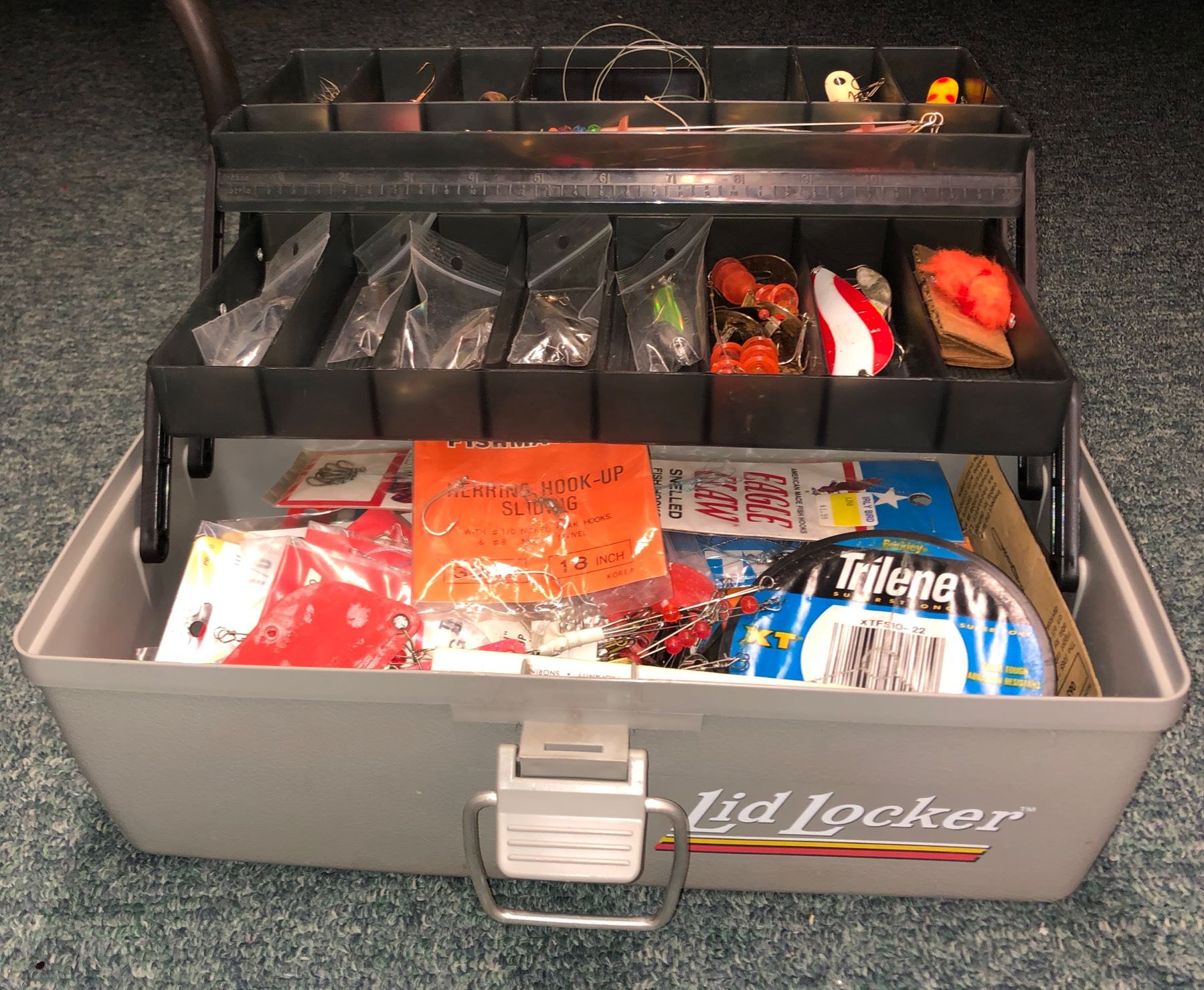 Lid Locker tackle box & contents (mostly fresh water tackle)