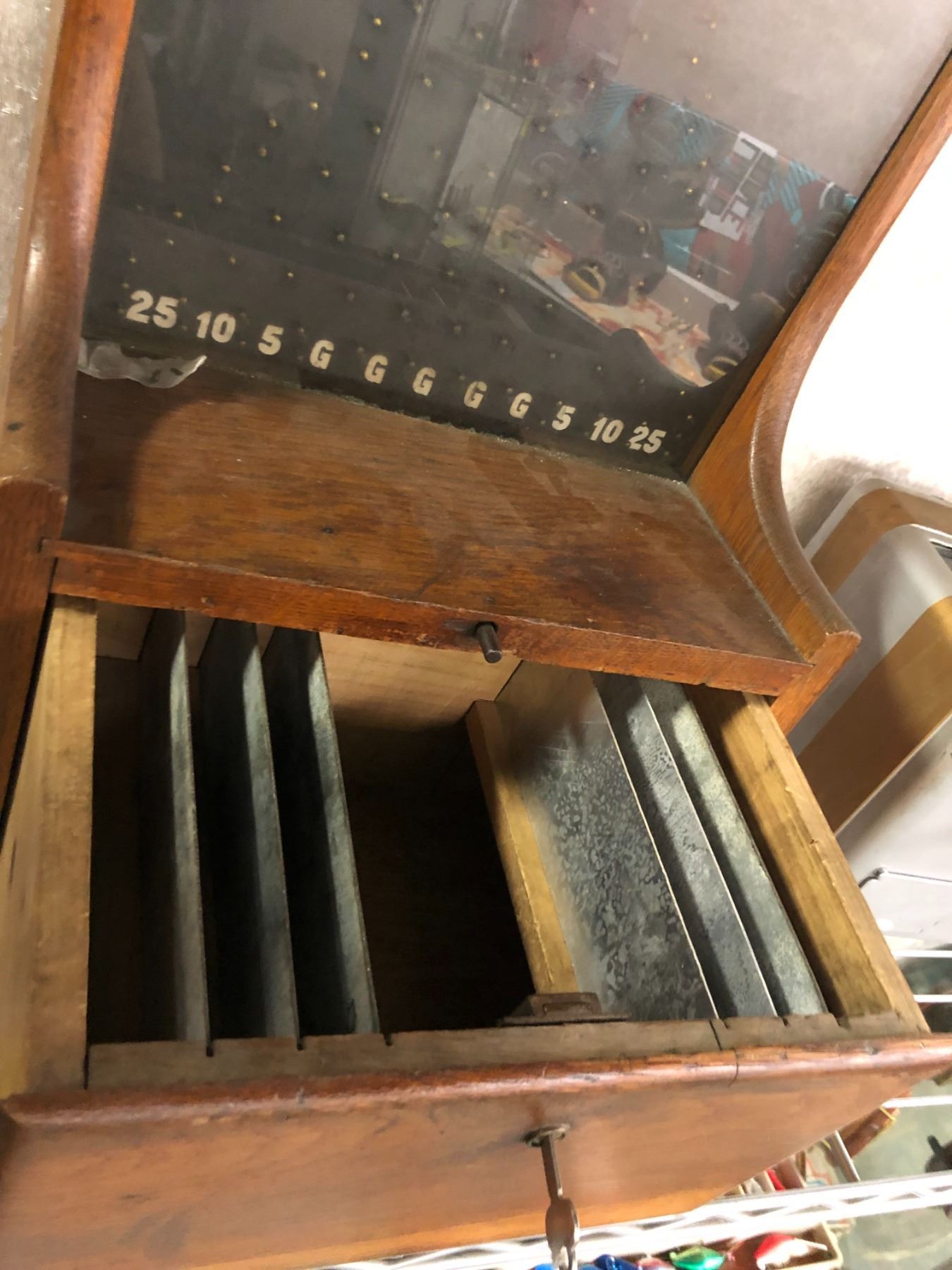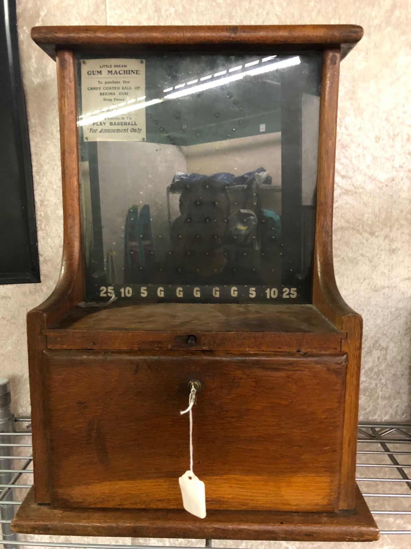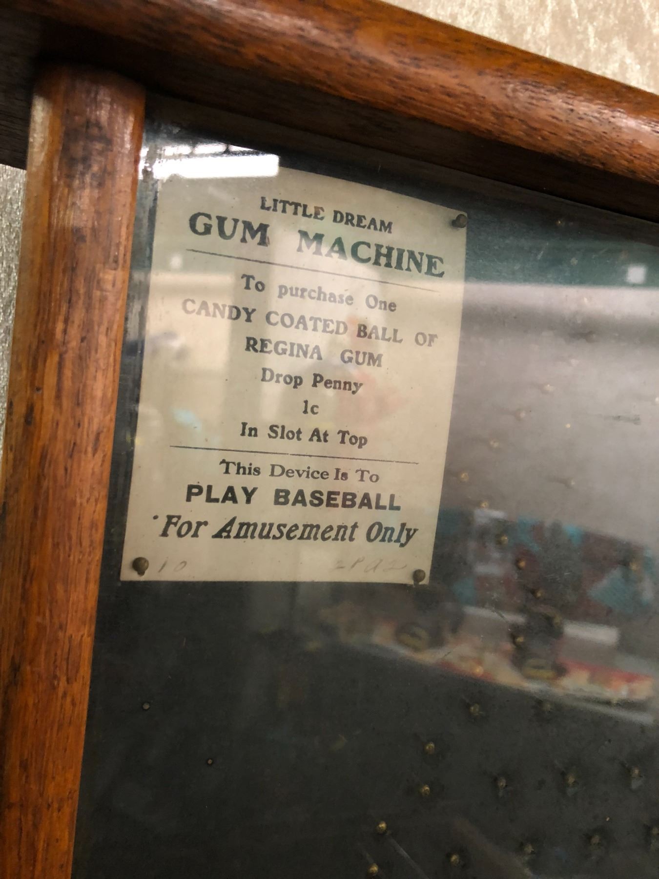 Little Dream Gum wooden penny drop trade stimulator machine circa. 1890's - 1920's (approx. 20in tall x 9in wide x 13in across) - these were gaming devices used on bar counters. You would put a penny in and win a nickel, a cigar or a pack of gum