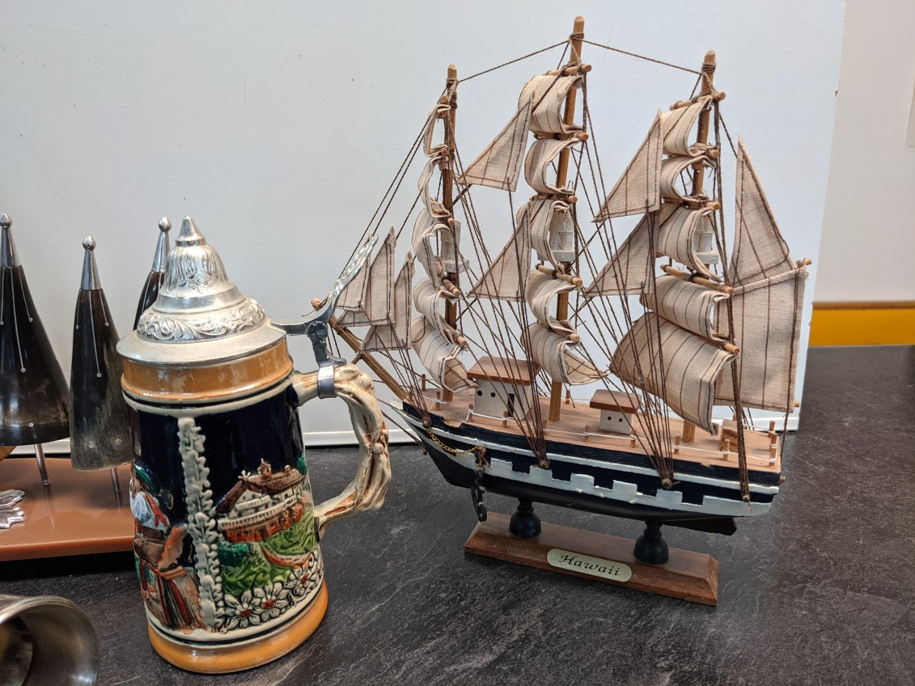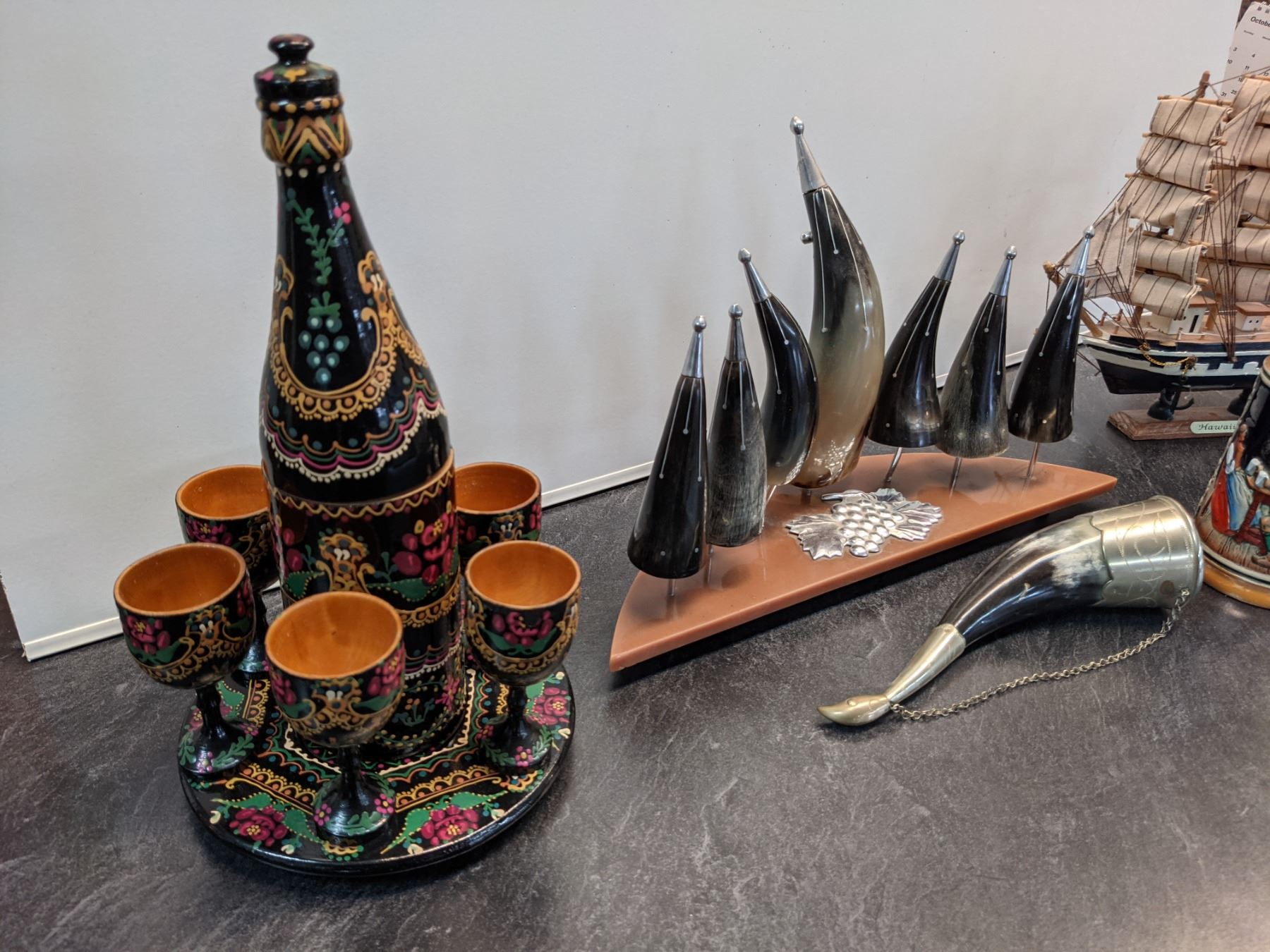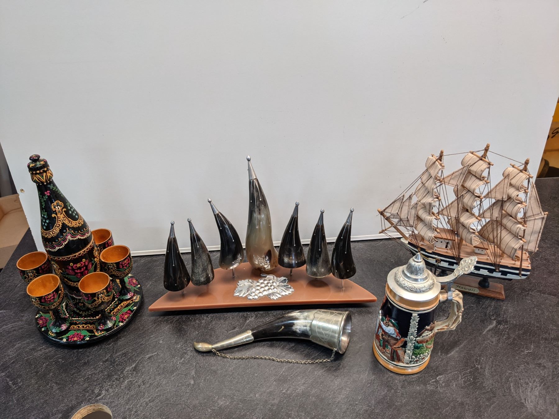 Lot Display Items inc Stien, Bottle with Shot Glasses, Horn Display & Sailboat Model - 17% Buyer Fee. Payment Processed through Live Auction World ( Visa or Master Card ) pick up Saturday, or Tuesday