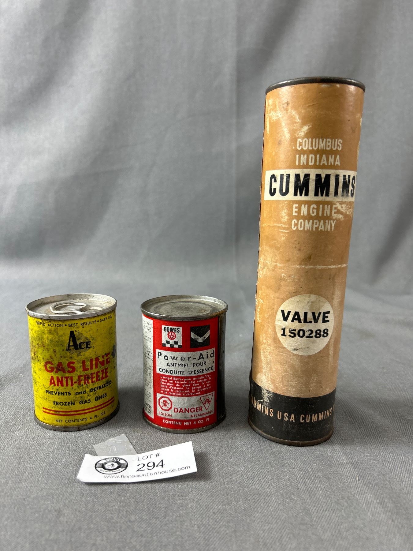 Lot Of 3 Vintage Garage Can Finds - Cummins Valve (Composite), Bowes Fuel Anti-Freeze (Tin) & Ace Gas Line Anti-Freeze (Tin)