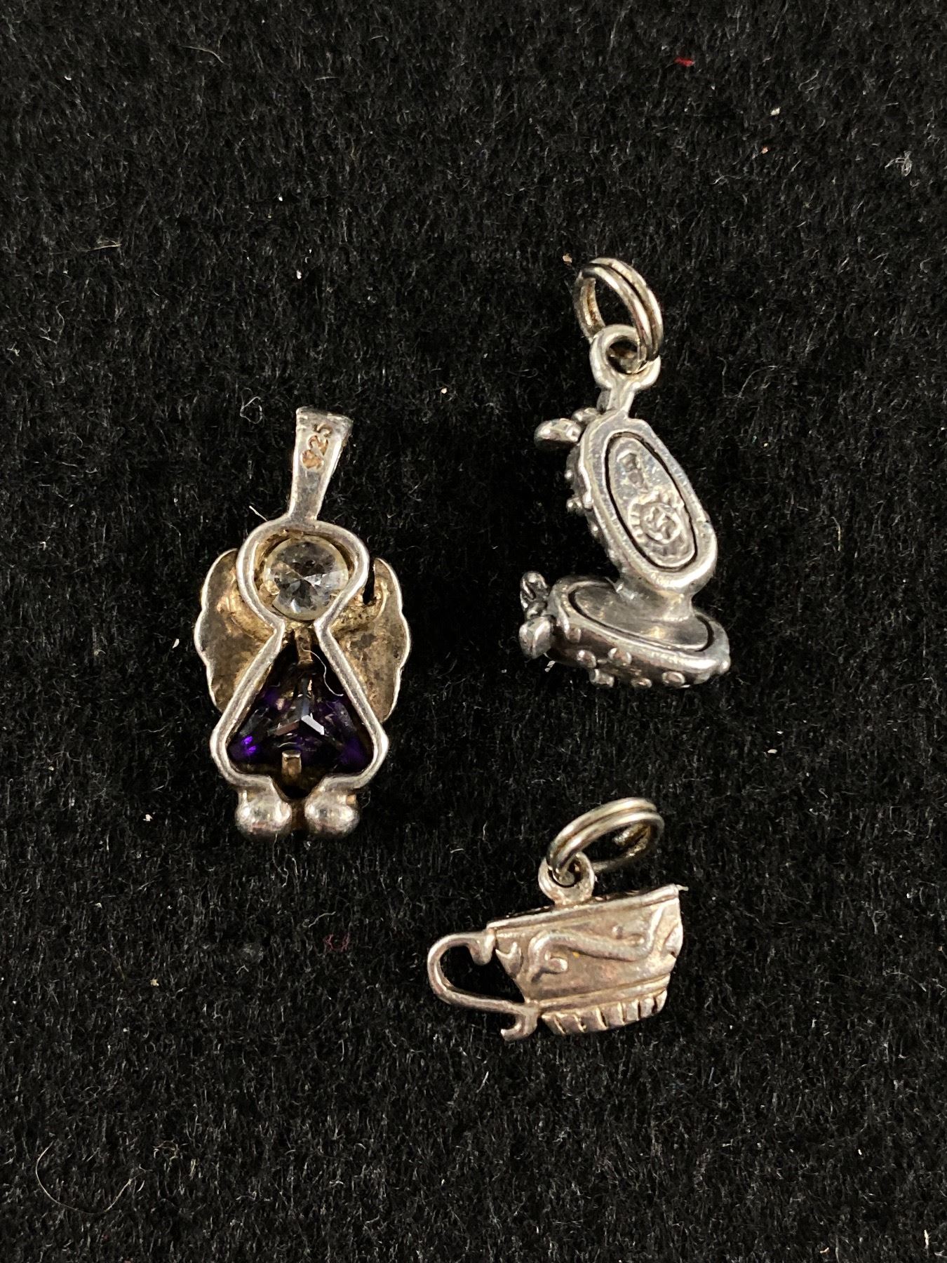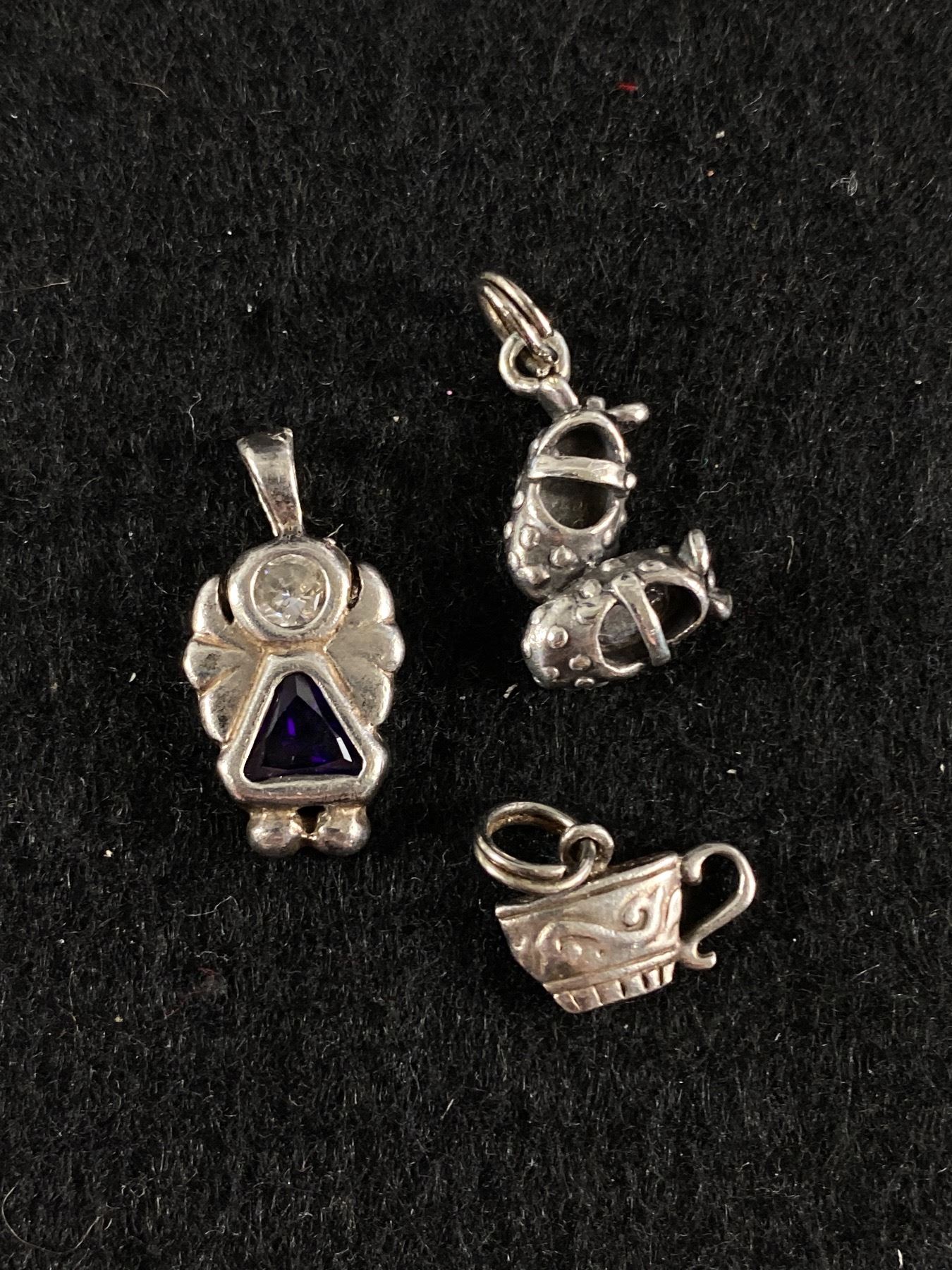 Lot Of 3 Vintage Sterling Silver Charms/Pendants - Reversable Tea Cup. Baby Shoes, Angel Triangle Birthstone - Tested