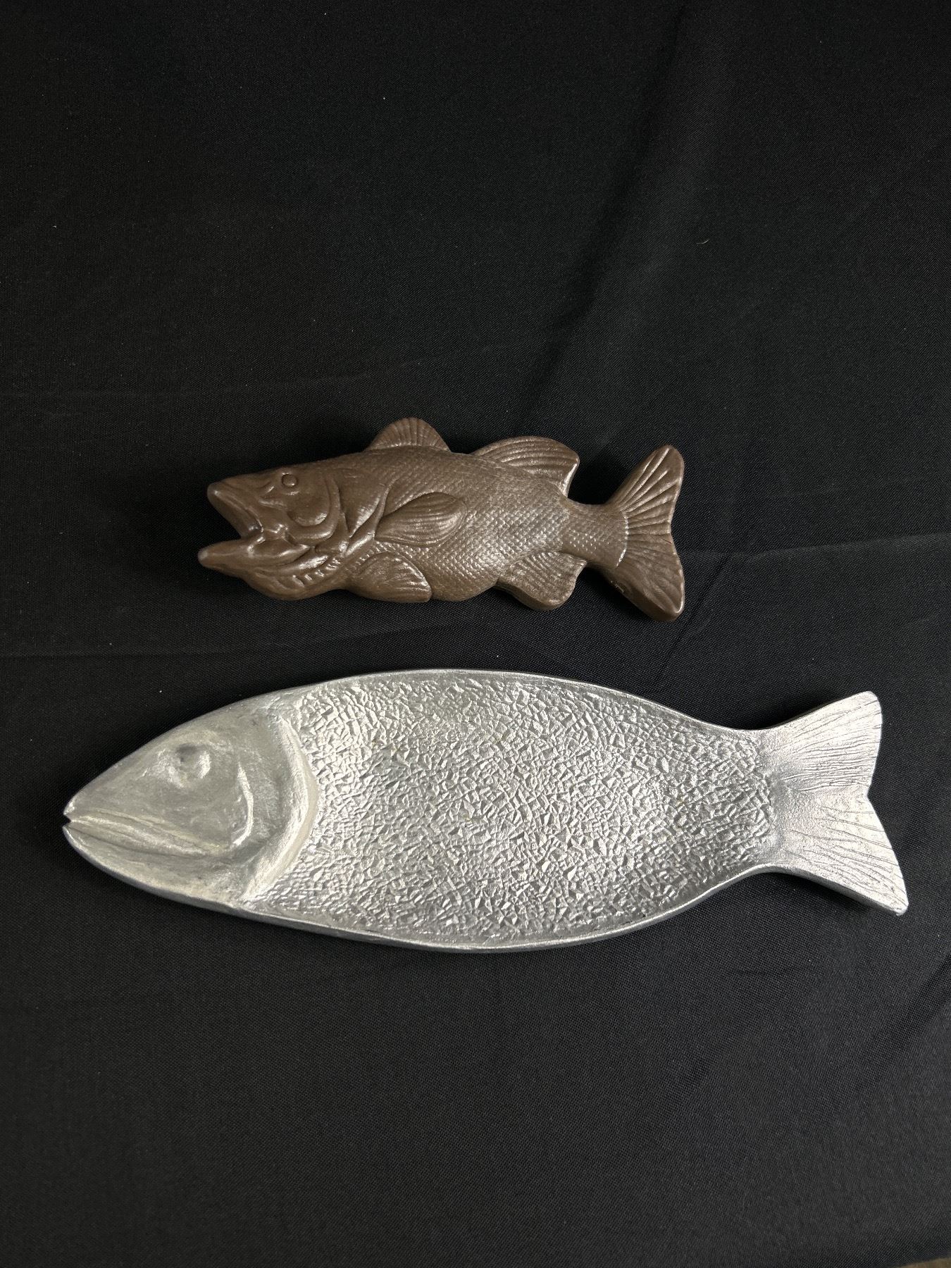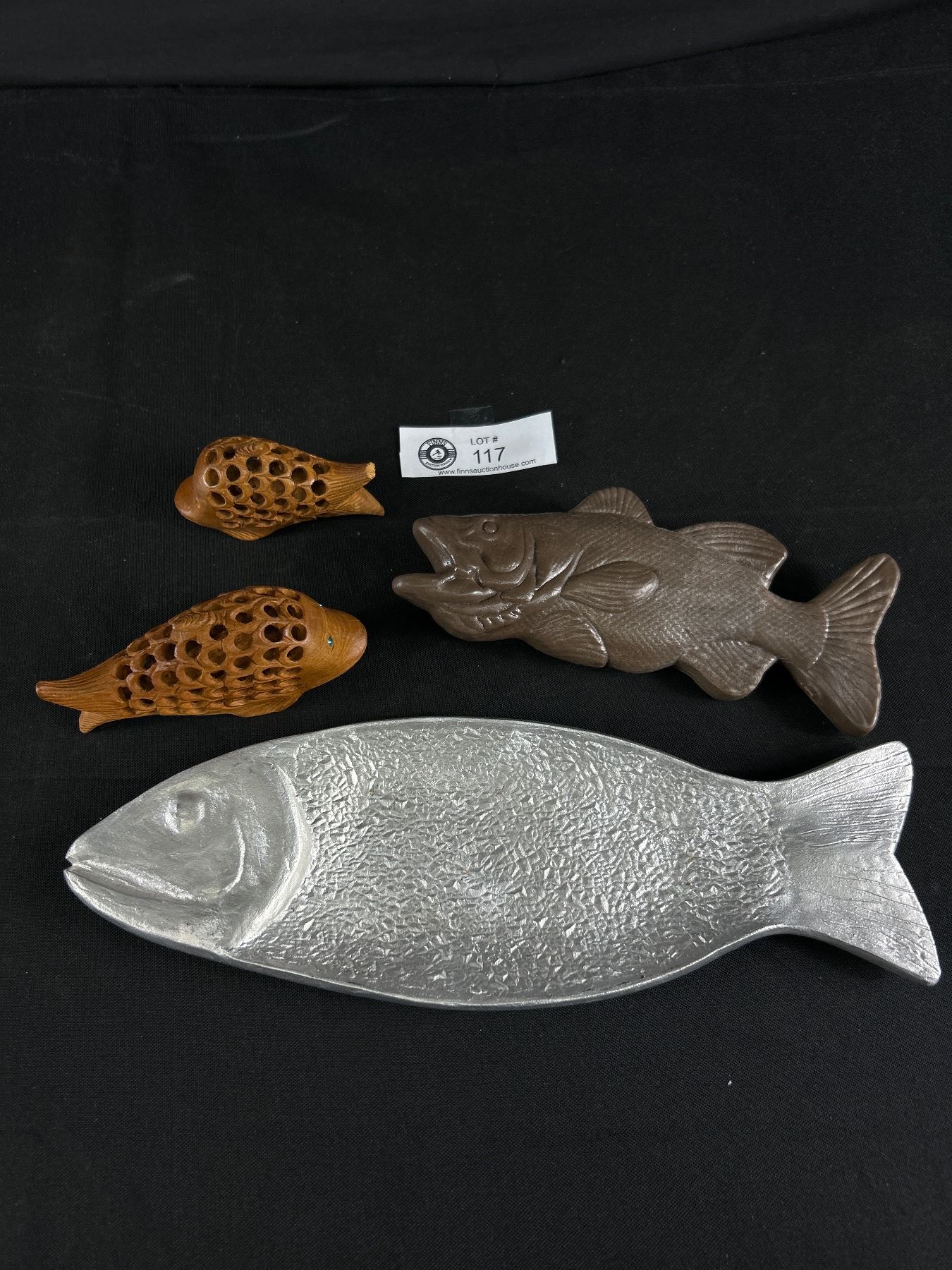 Lot Of Assorted Fish Figures - 12" Vancouver Artist Metal Salmon, 2 Wood Carved & Polyresin