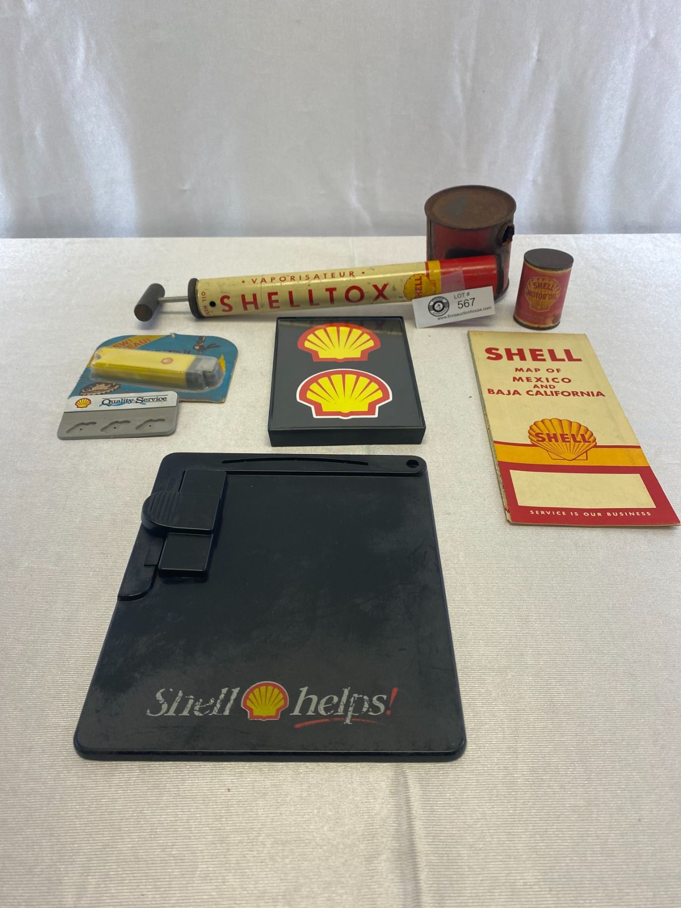 Lot Of Assorted Shell Items, Stickers, Lighter, Map, Etc.