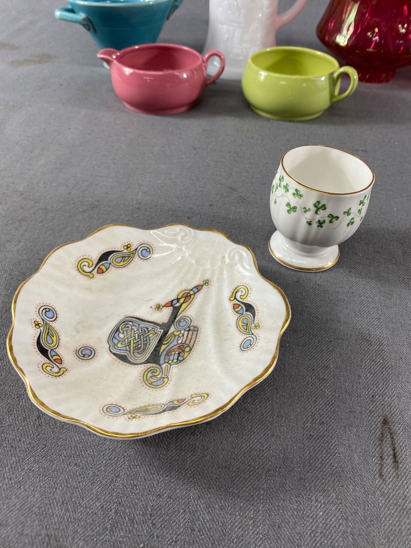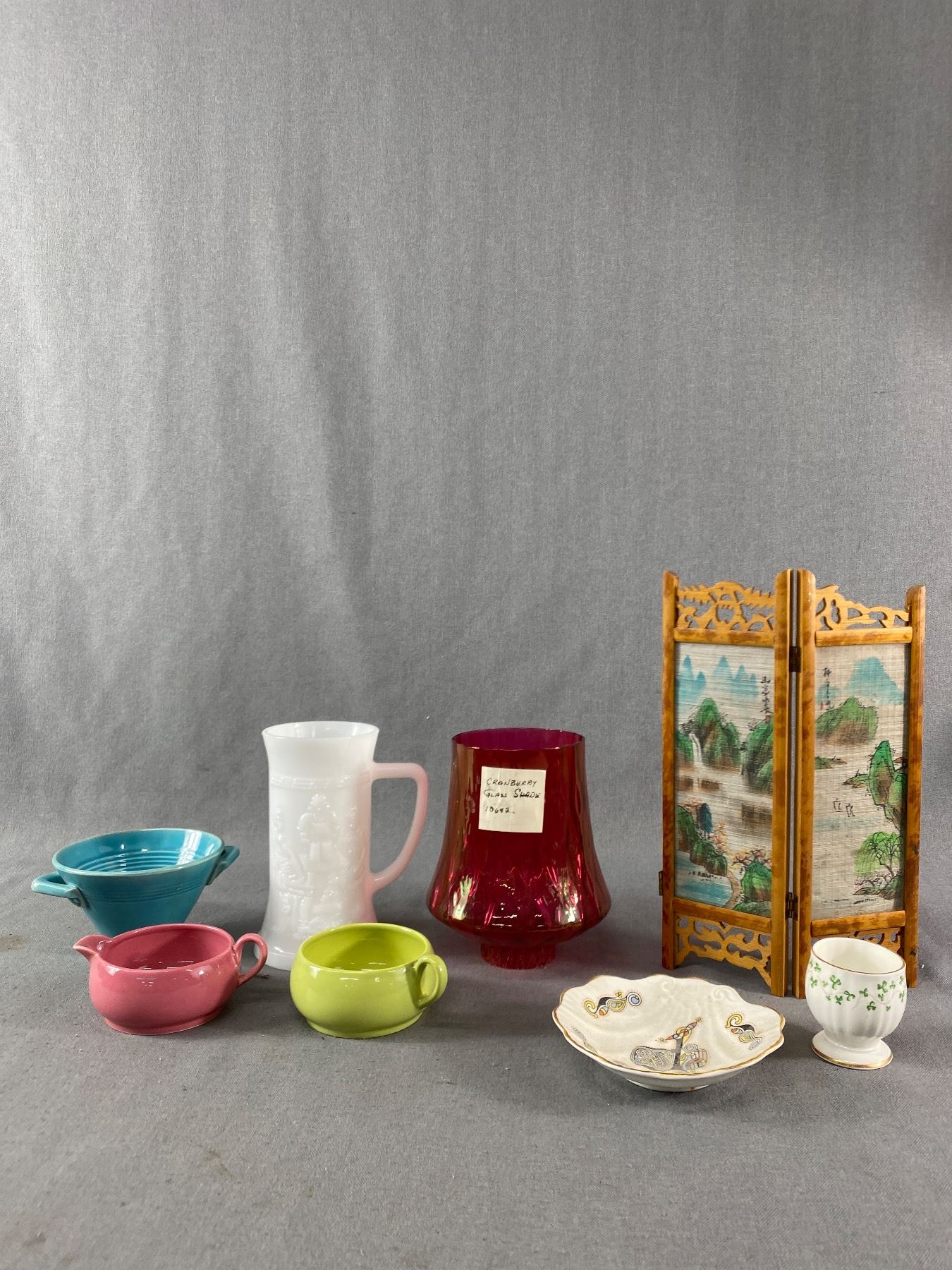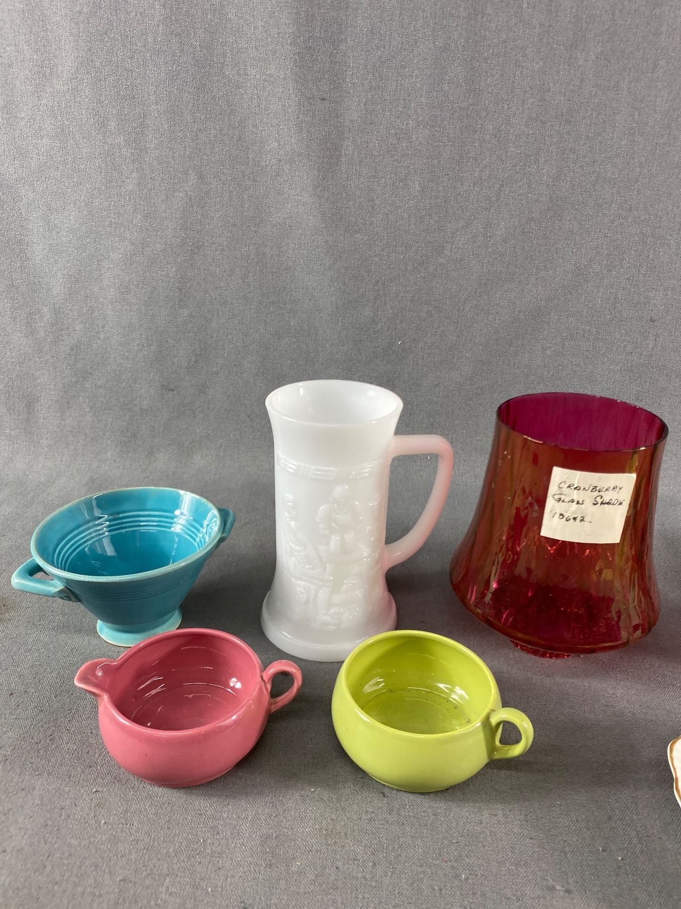 Lot Of Collectible -Cranberry Glass Shade, Old Foley Cream & Sugar Bowls, Royal Tara China Pieces & More