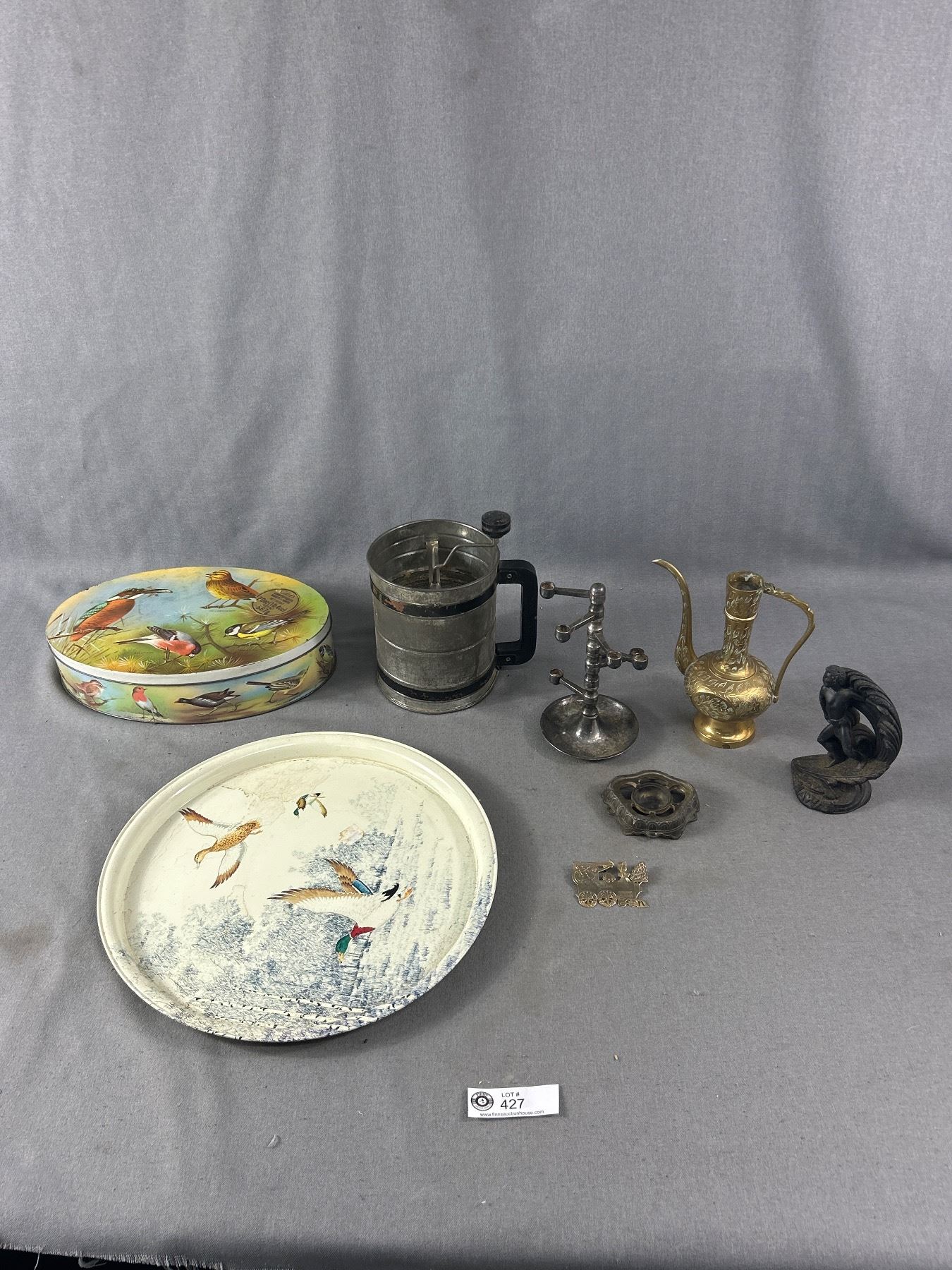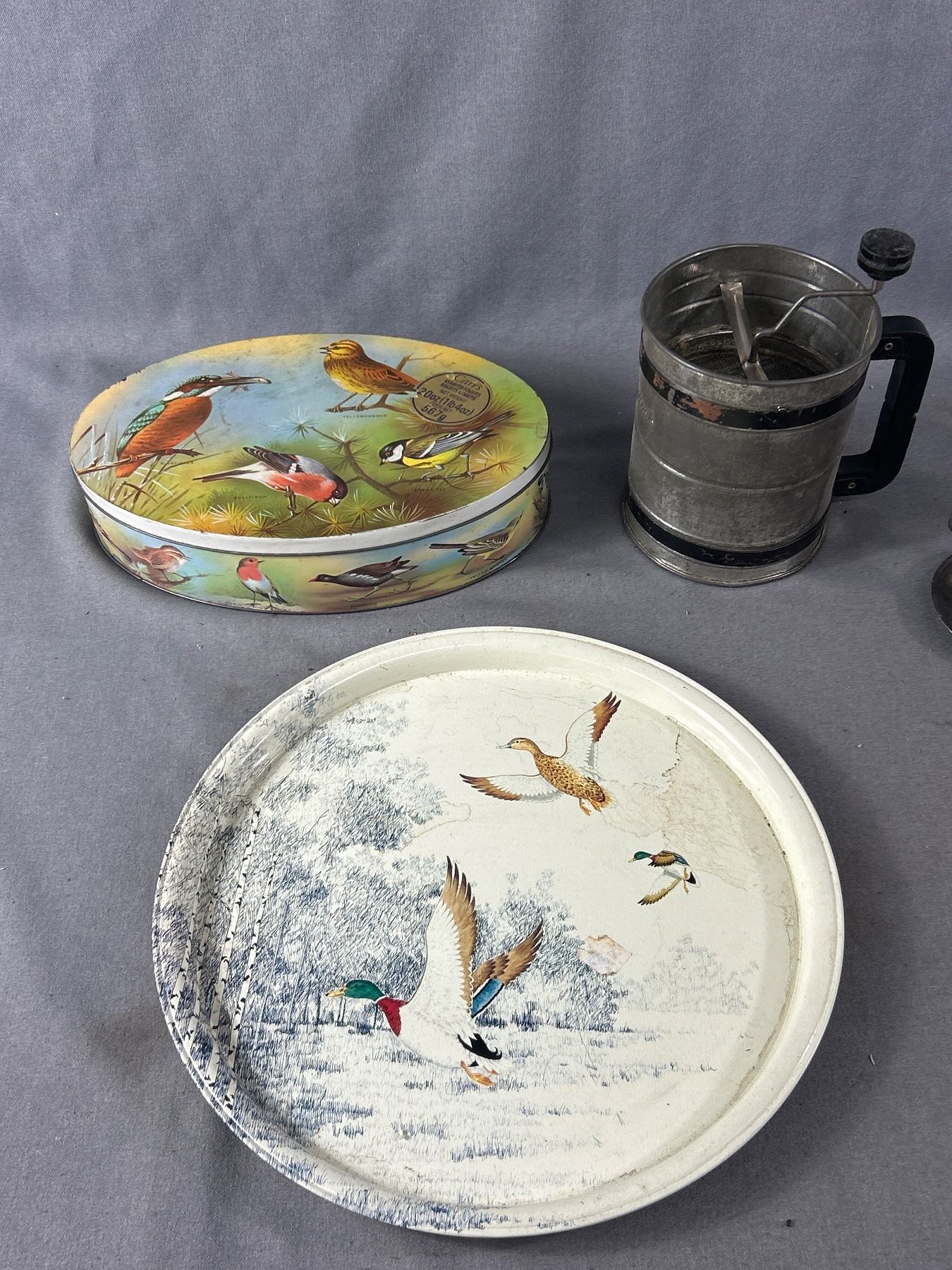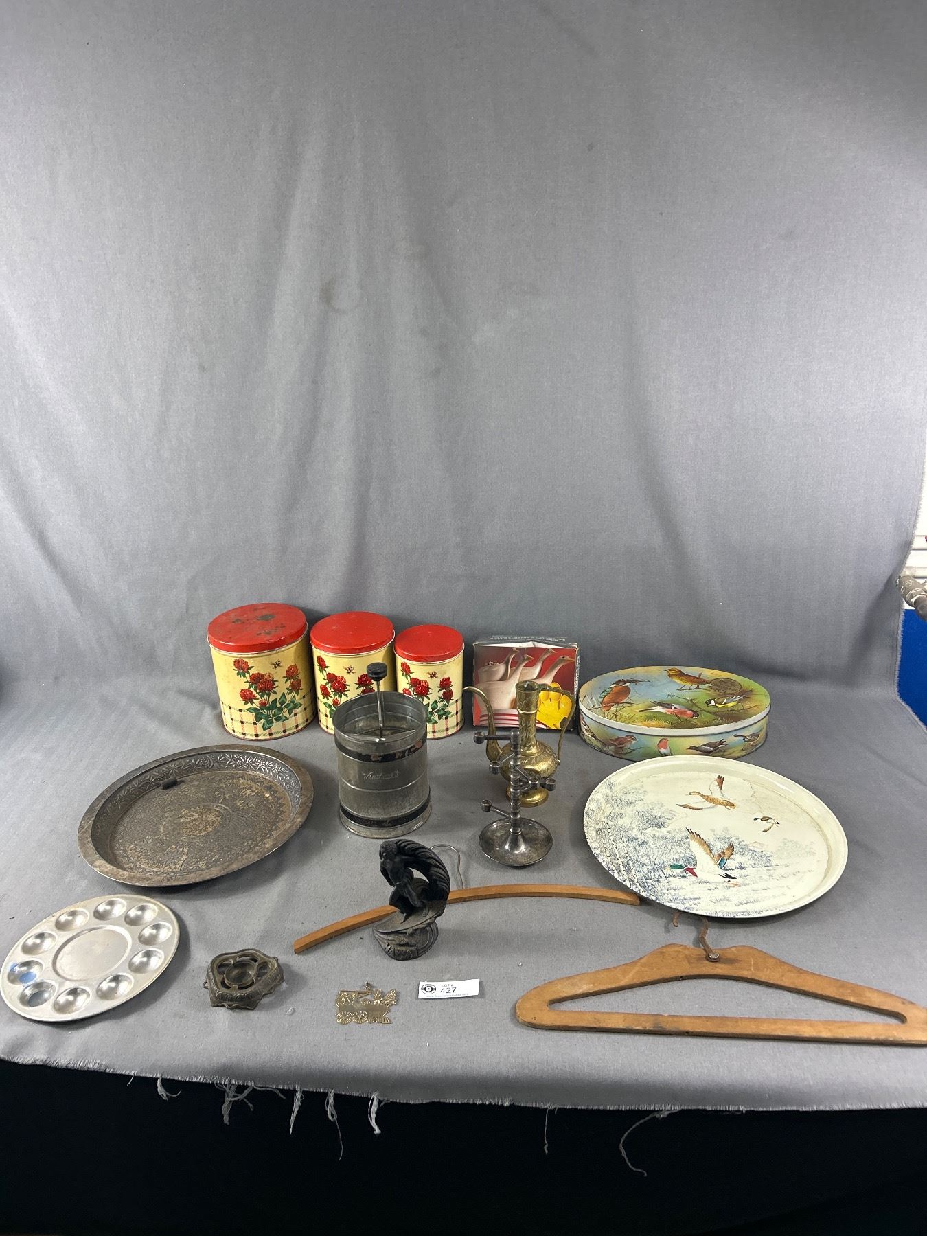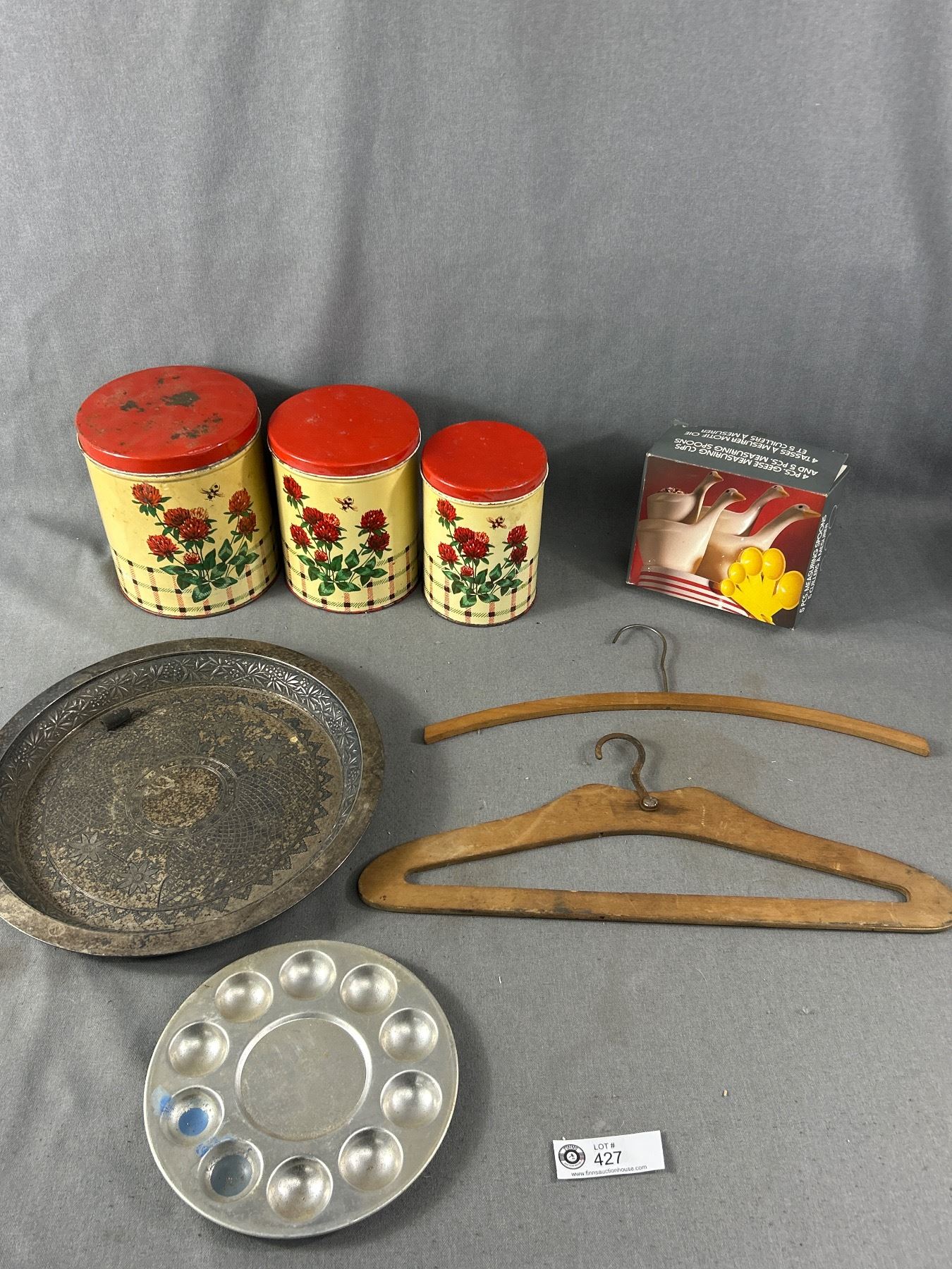 Lot Of Vintage Finds - Flour Sifter, Tin Kitchen Canister, Wood Hangers, Tins & More
