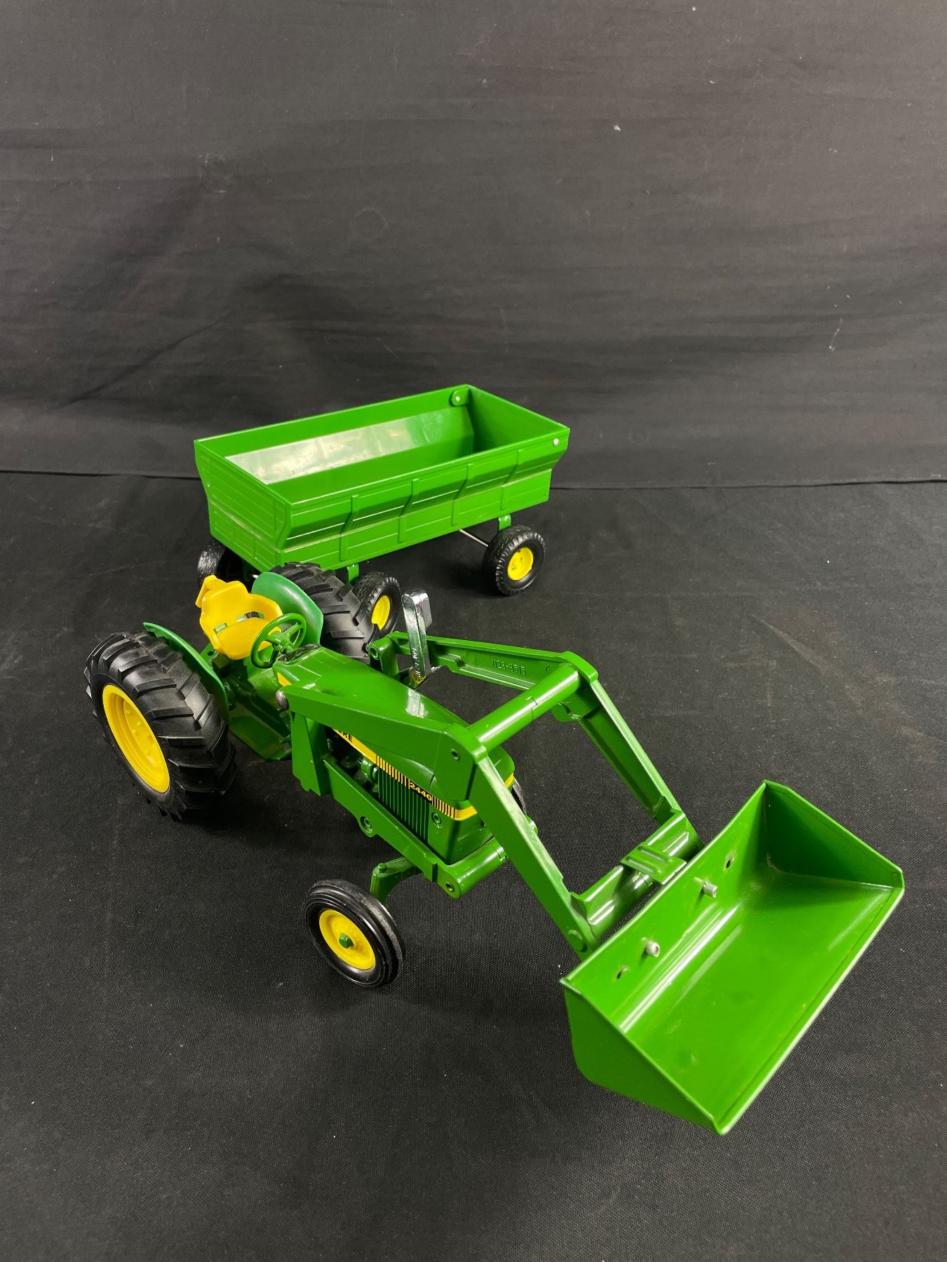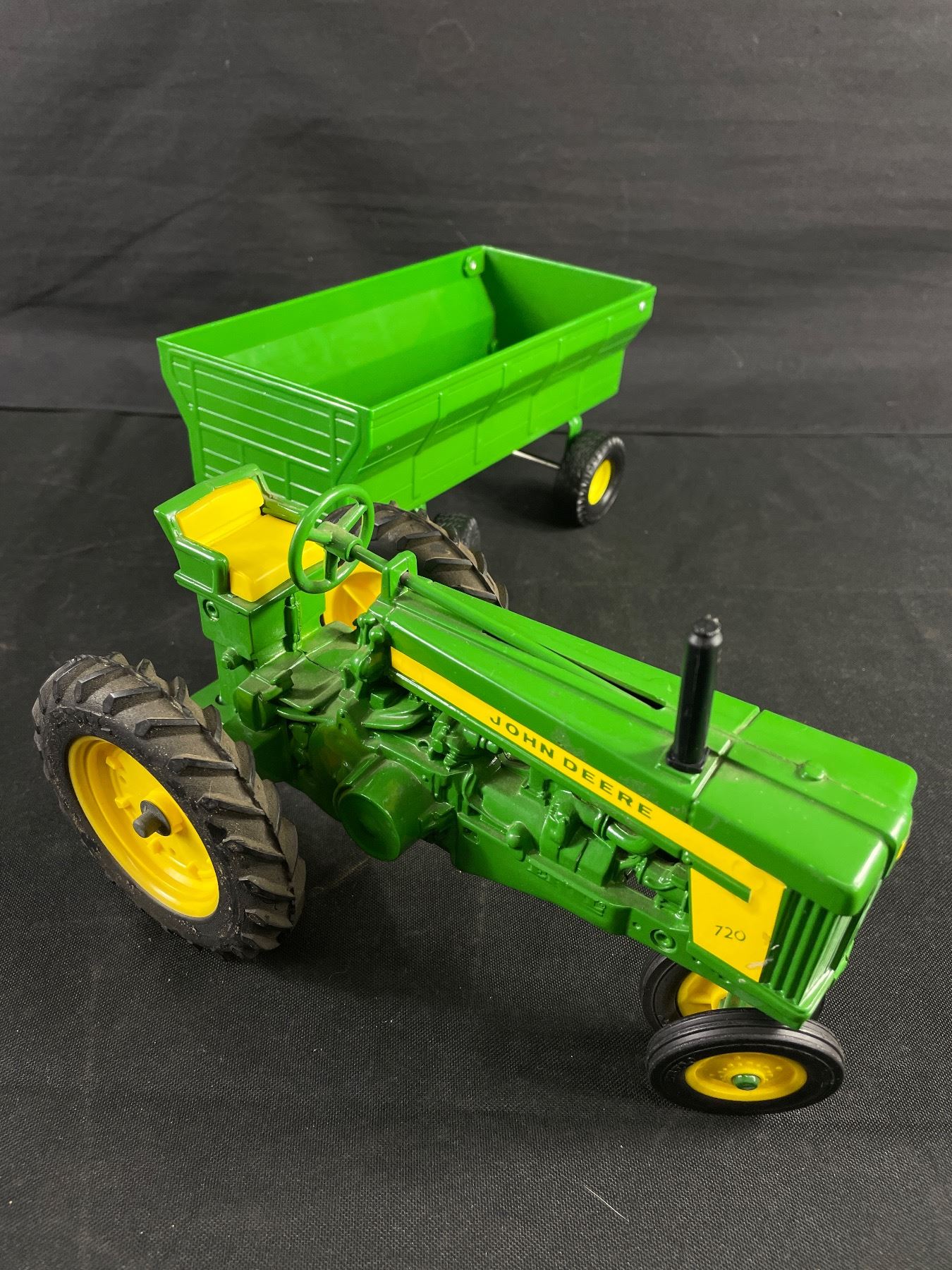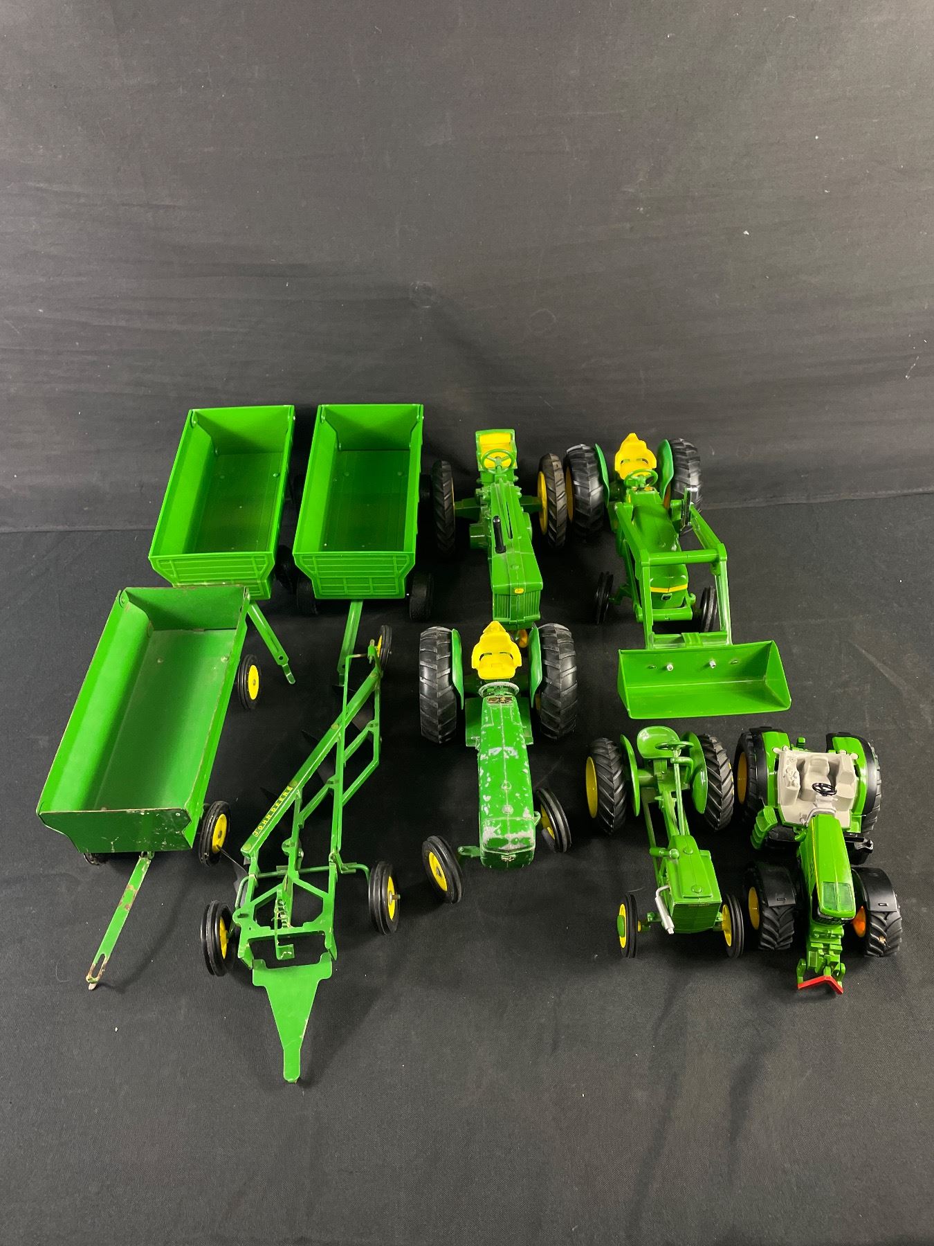 Lot Of Vintage & Newer John Deere Die Cast Metal Tractors & Trailers. Largest ERTL Tractor Is 12"L. 2 ERTL Trailers Are Plastic