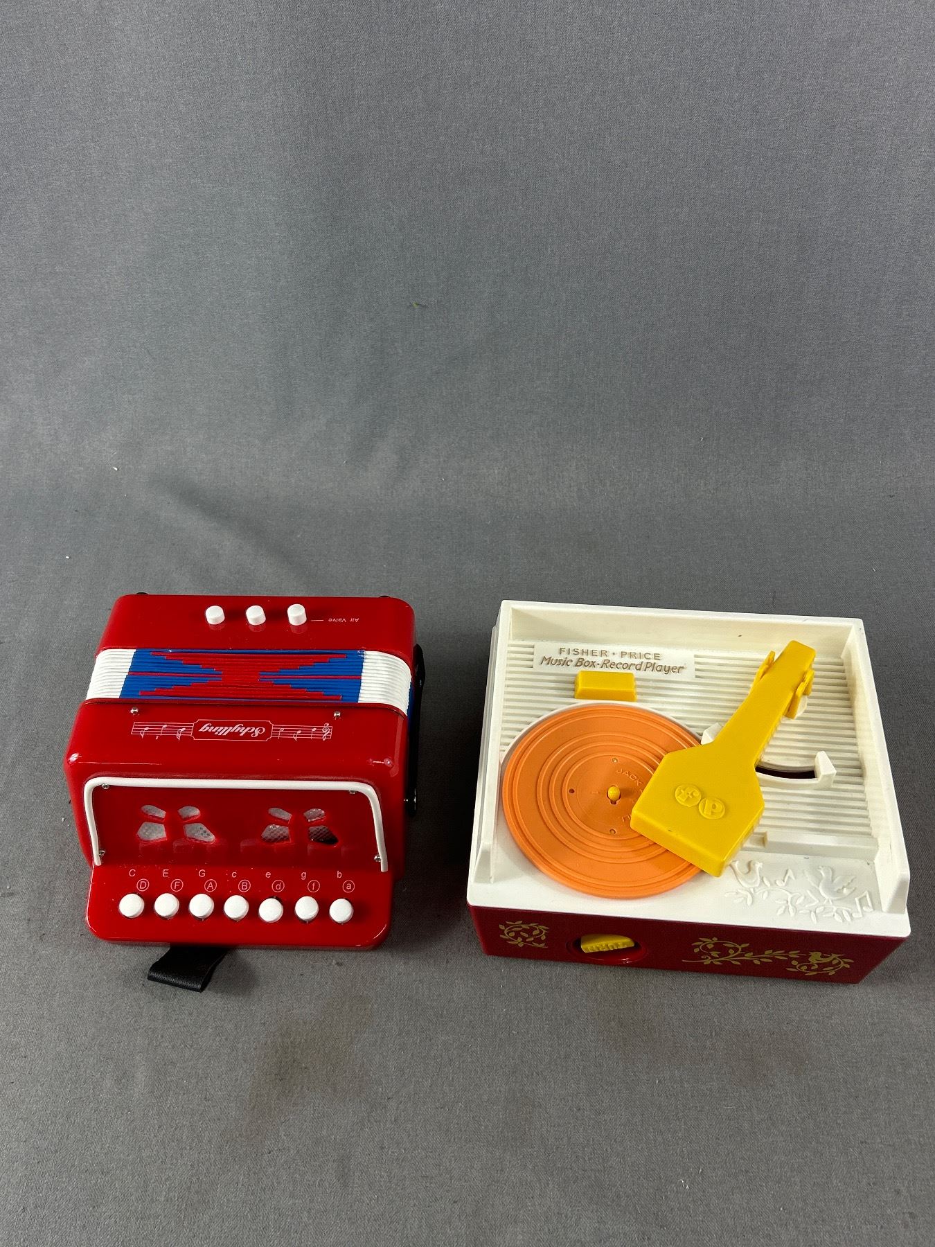 Lot Of Vintage Toys - FP Music Box Record Player, Accordian, Double Sided Tin Checkers Game (No Pieces) & More
