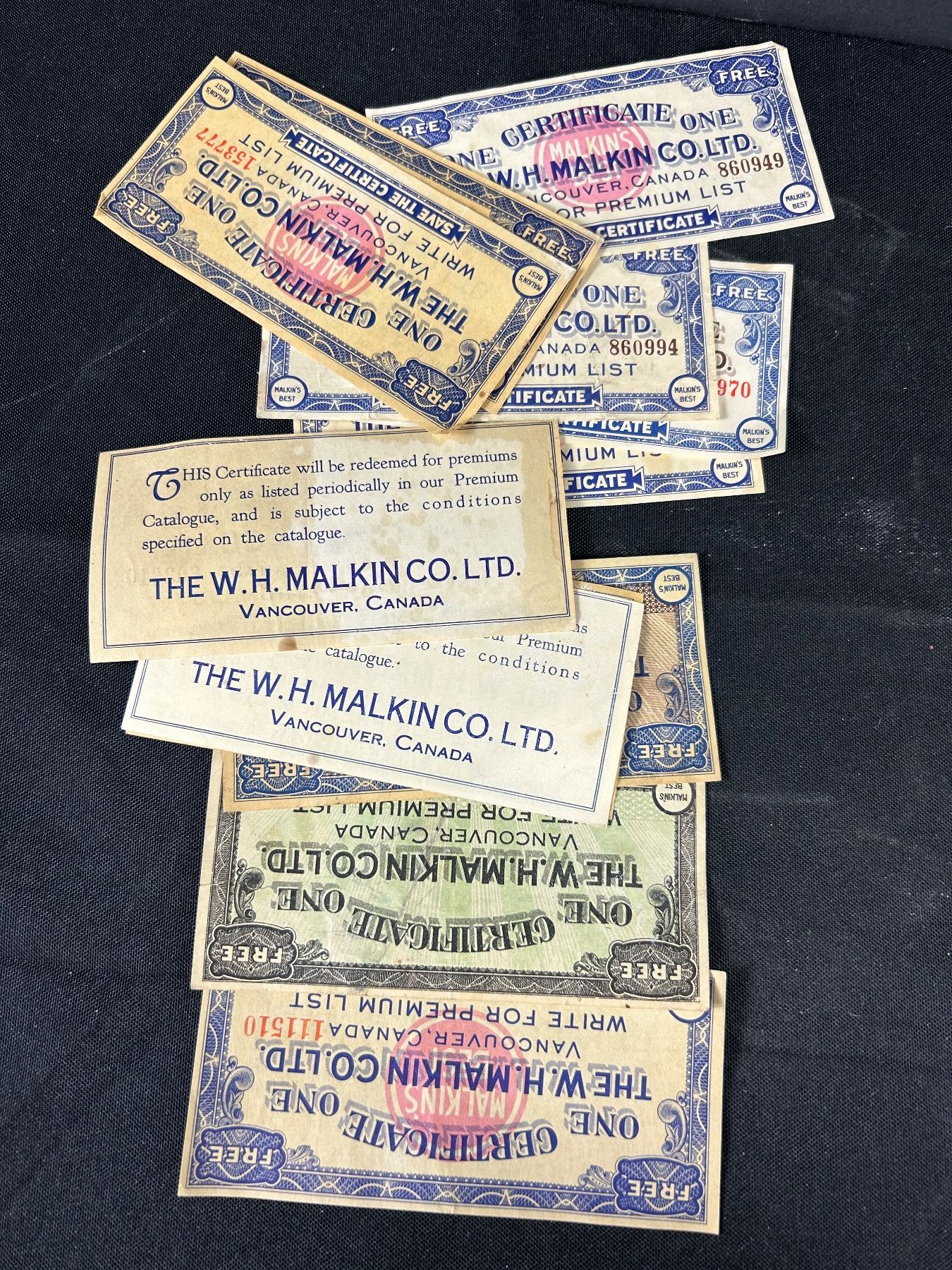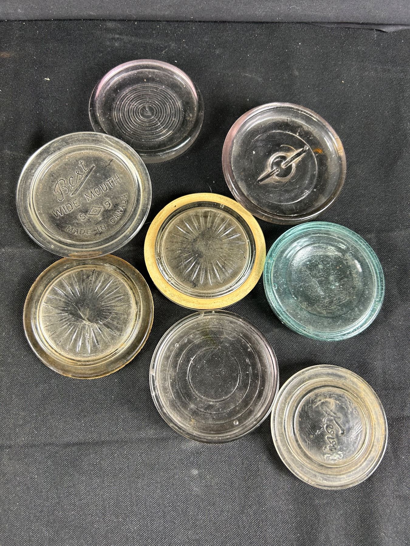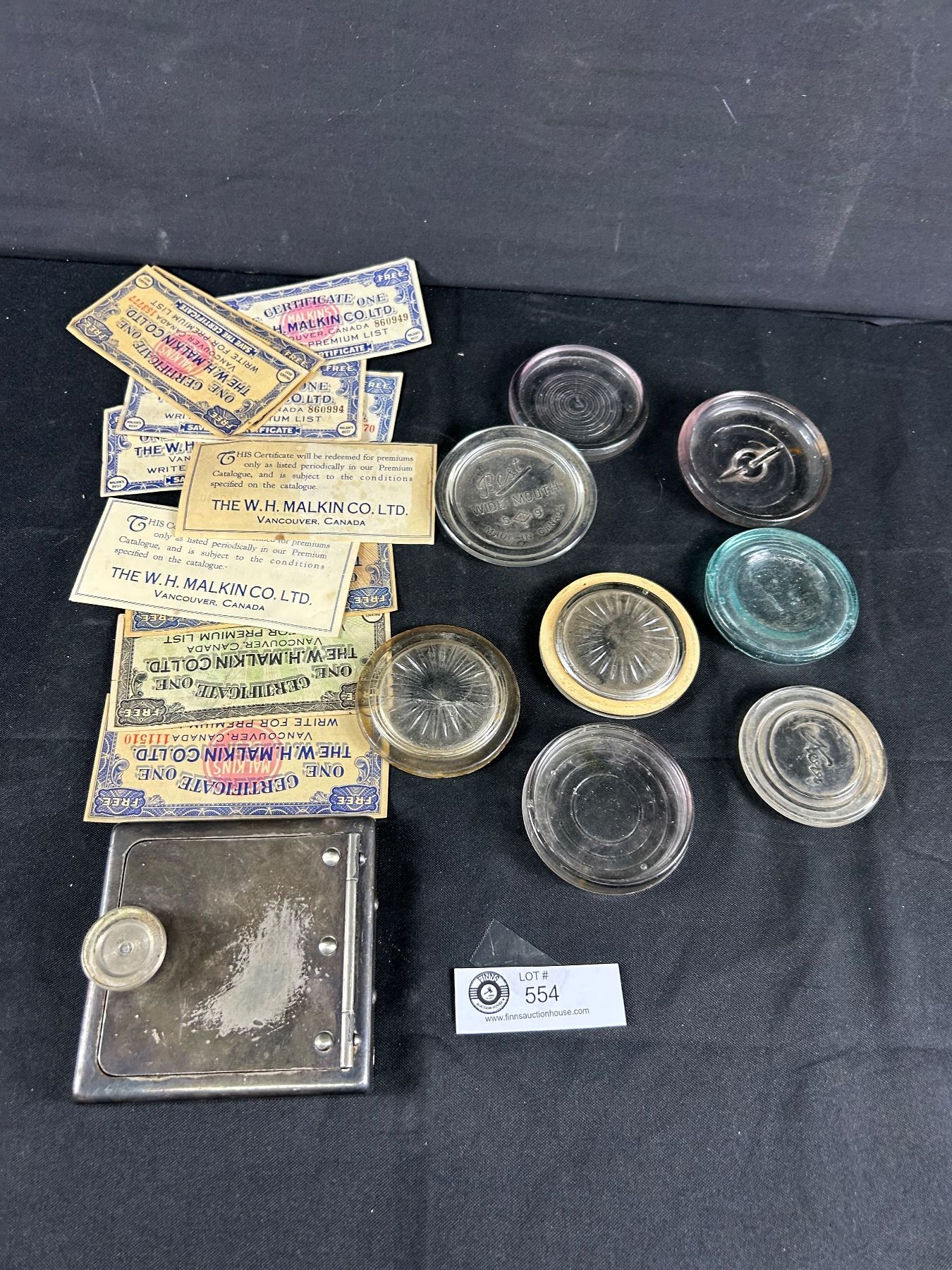 Lot Of Vintage Watkin Coupons, Glass Canning Lids & Cannistor Cover