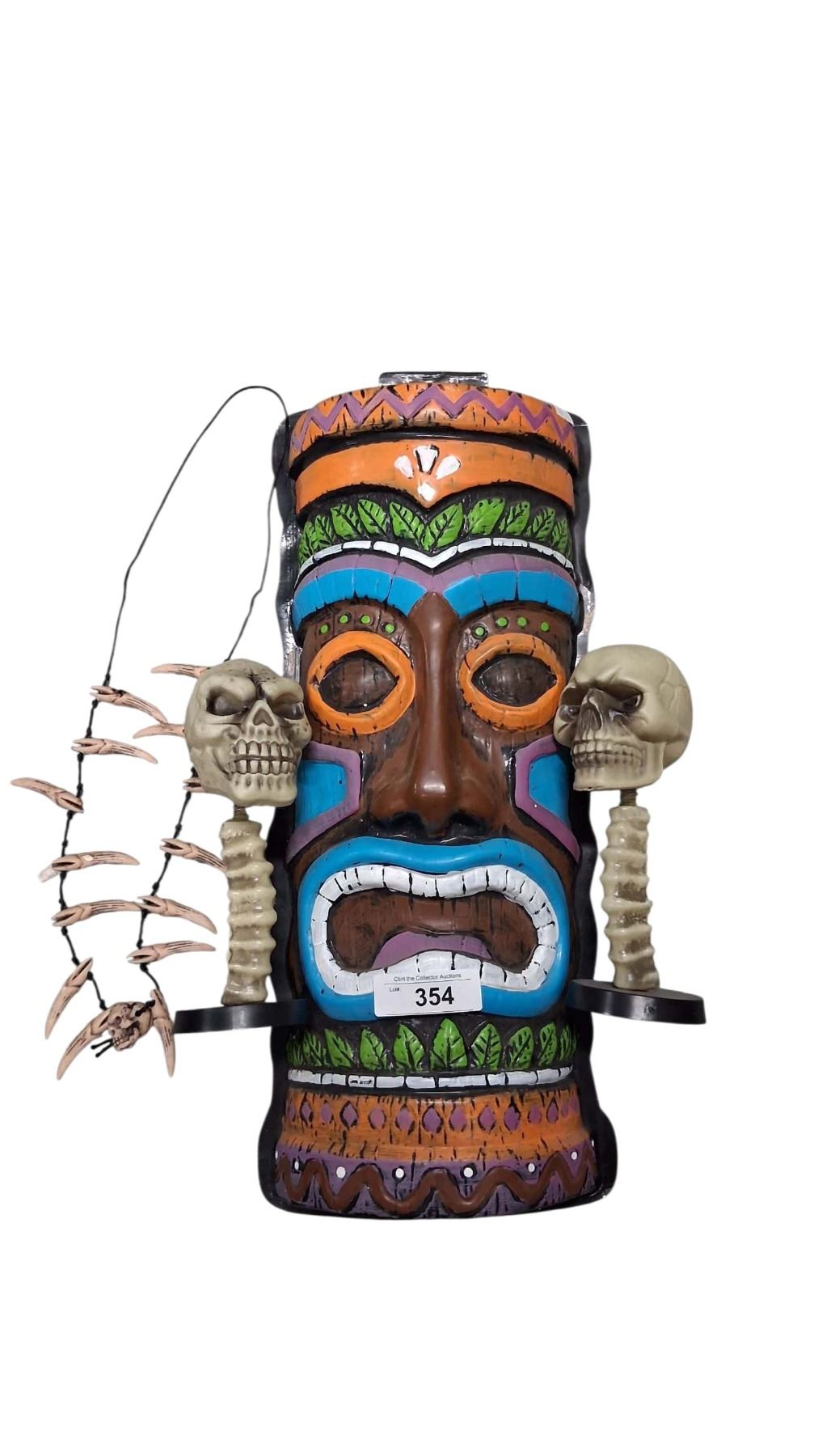 Lot inc novelty Tiki mask, Voodoo necklace, & 2 skulls