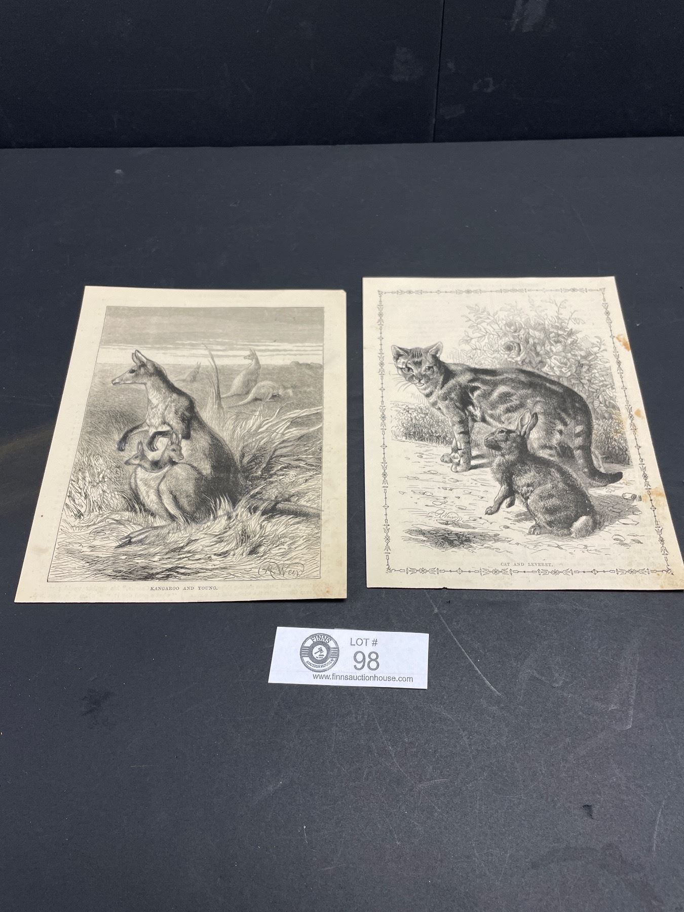 Lot of 2 1880s Steel Engravings, Cats/Kangaroos