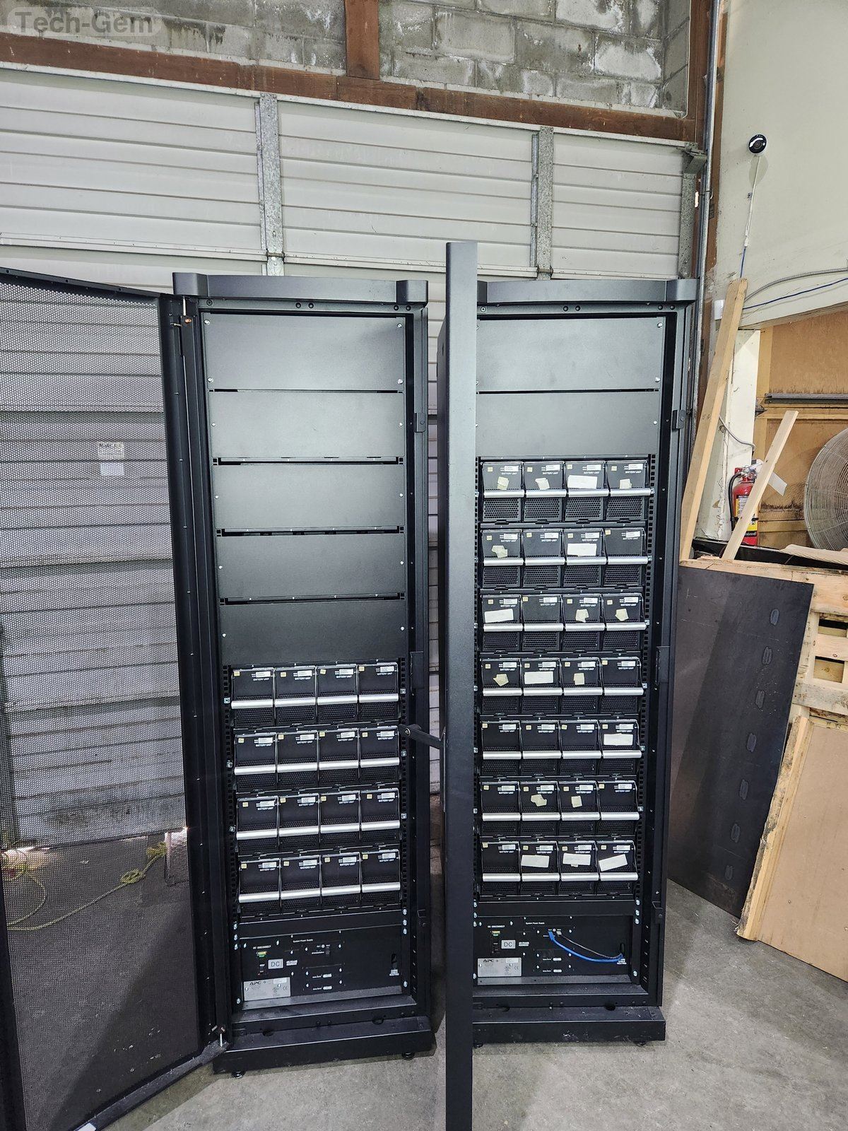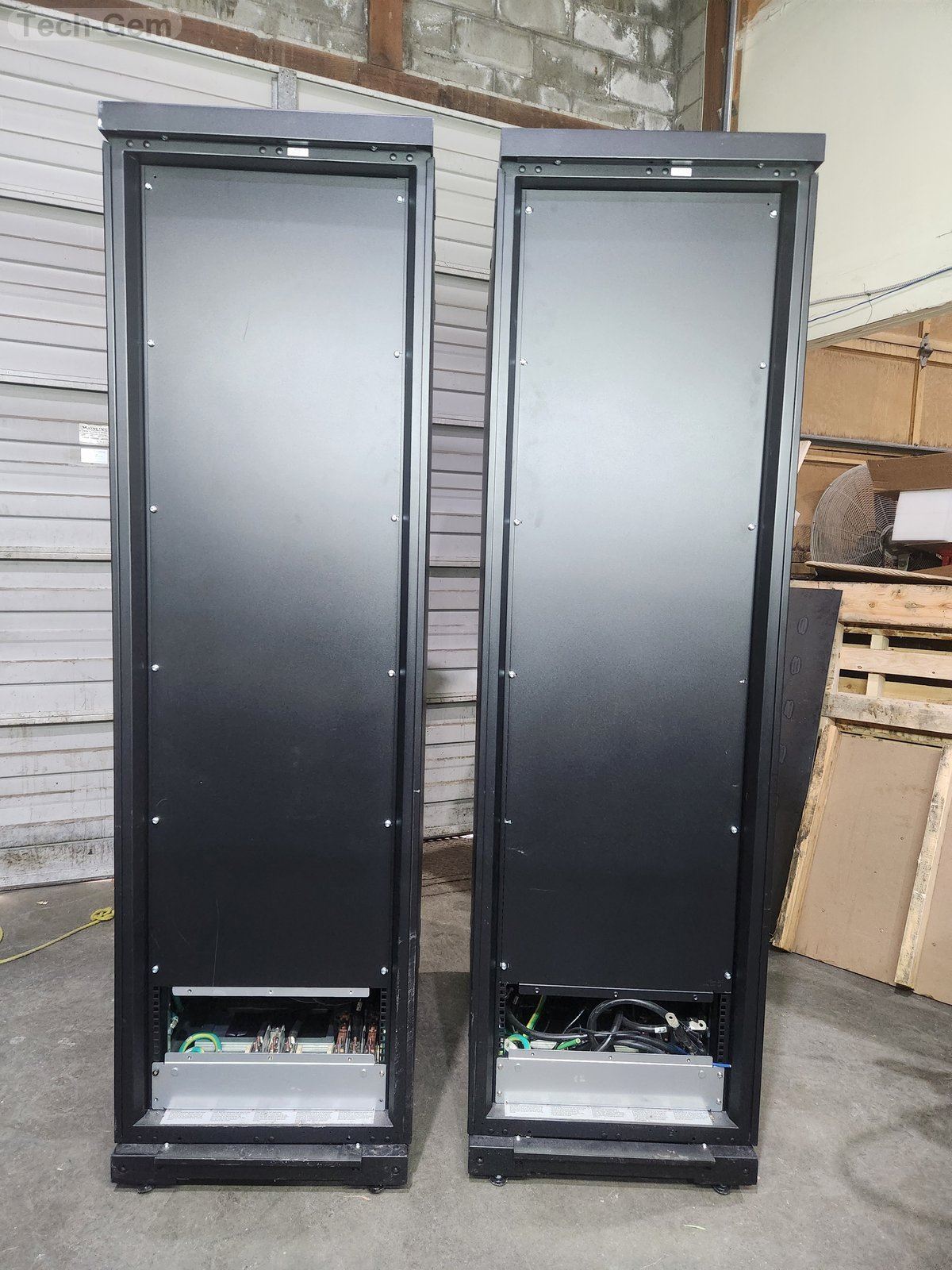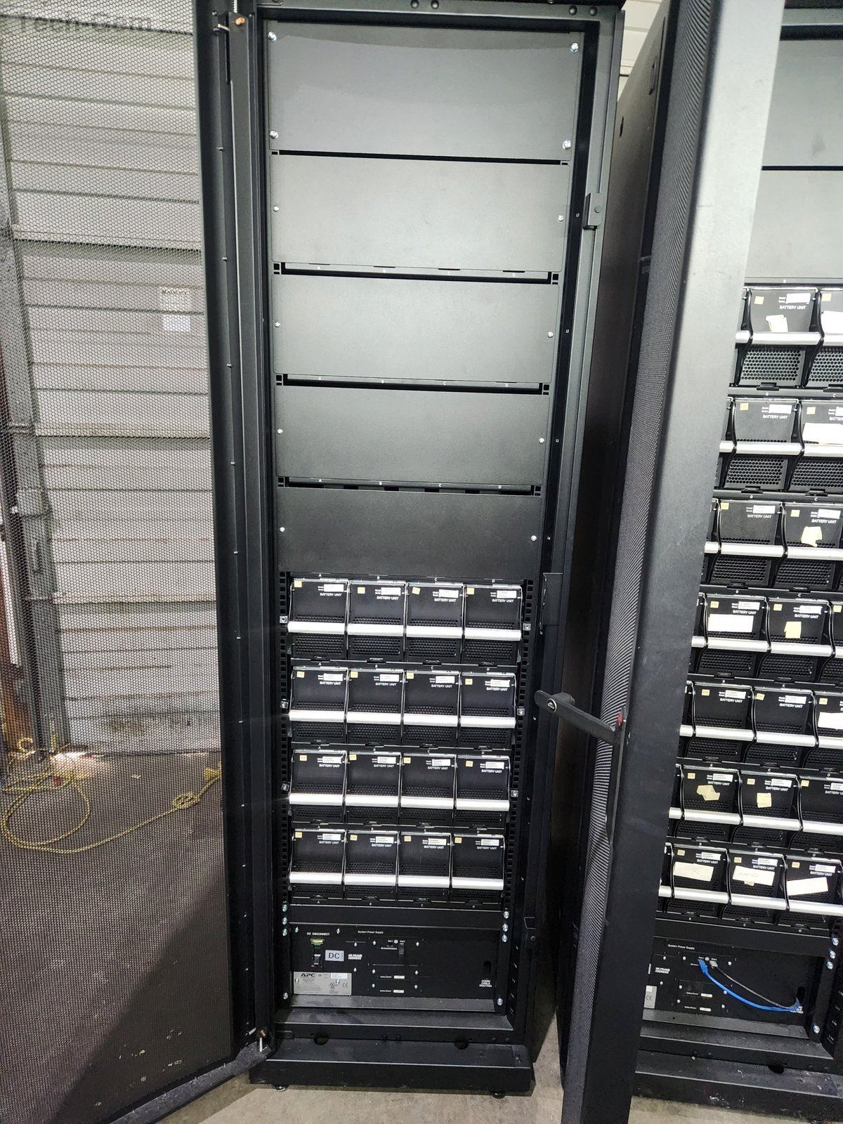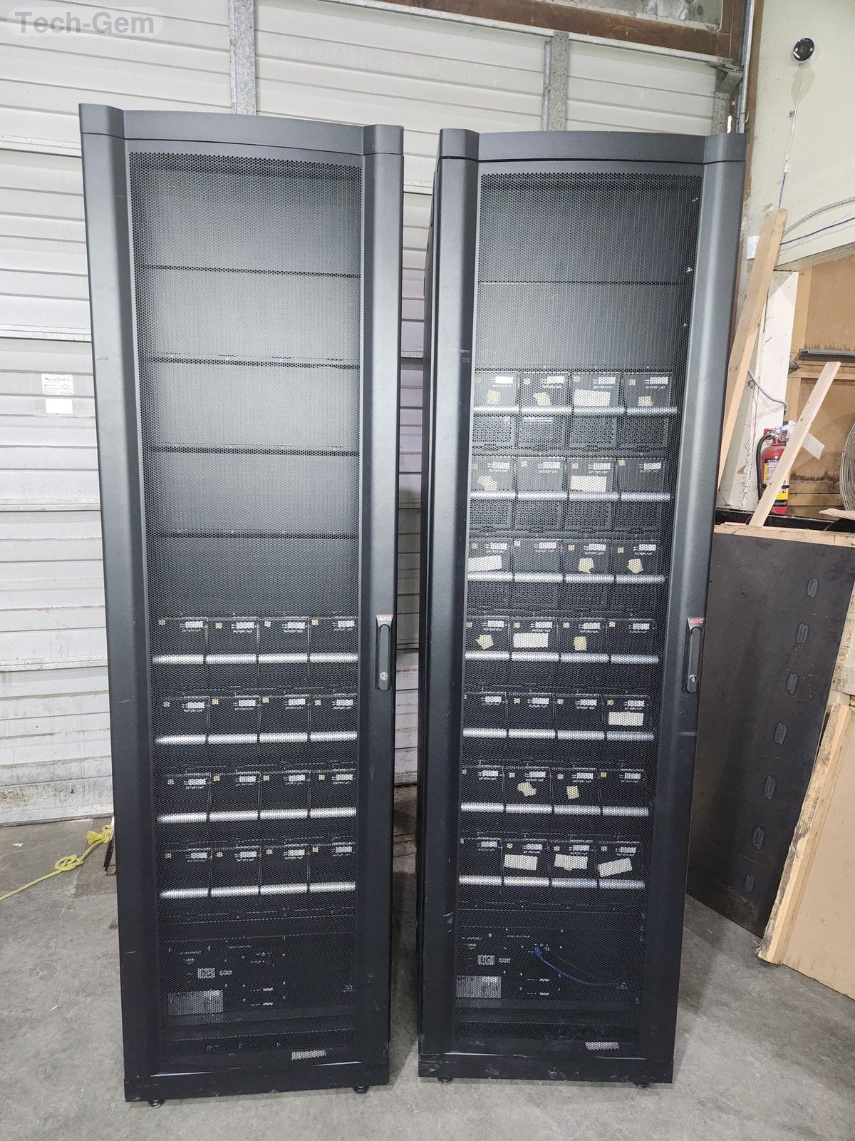 Lot of 2 APC Symmetra PX Battery Enclosures (Model: SYCXR8) installed in APC NetShelter AR2800X102 server cabinets. One enclosure has 4 battery modules with a total of 16 SYBTU1-PLP batteries, while the other has 7 modules with a total of 28 SYBTU1-PLP batteries. Each enclosure is rated at 192VDC, 112A for extended runtime. Units were pulled from a working environment, but battery life is not guaranteed.