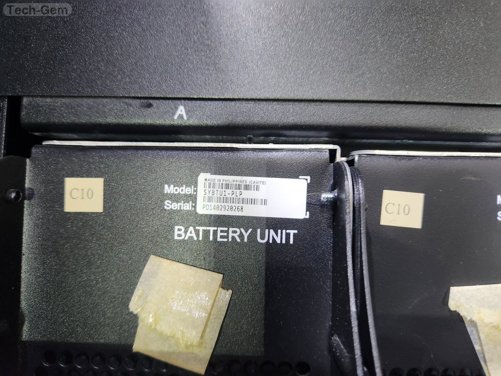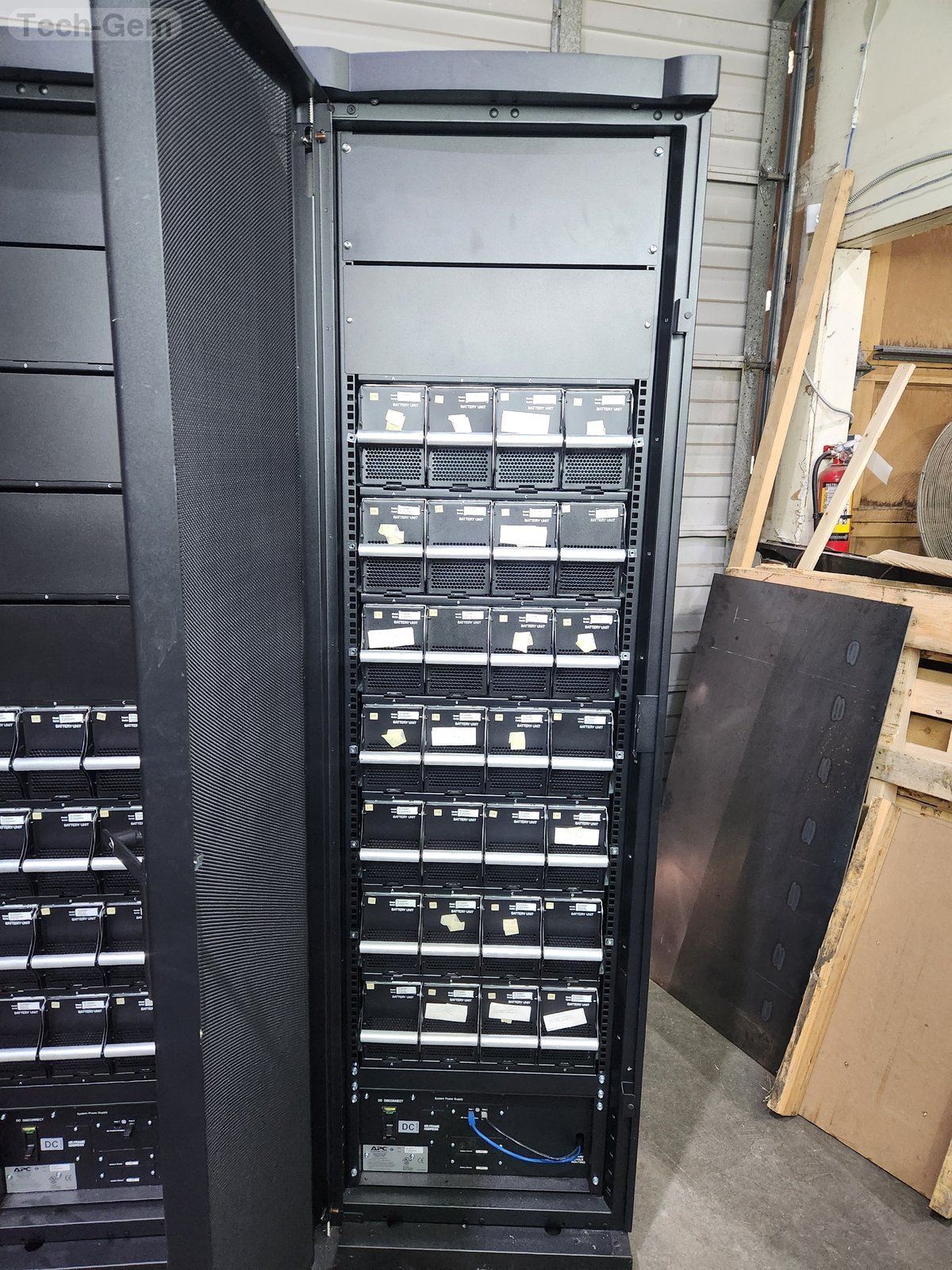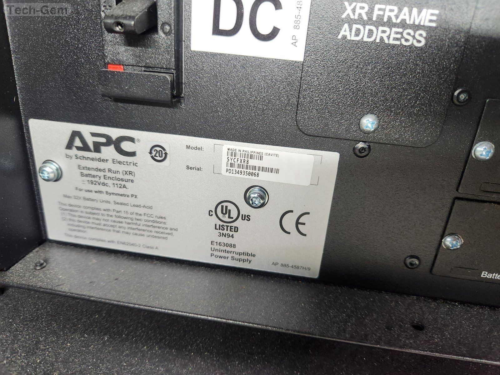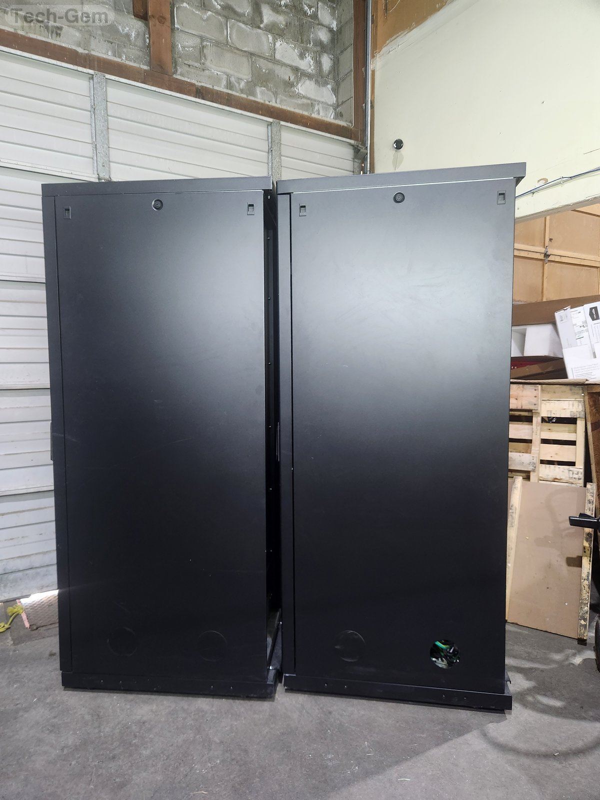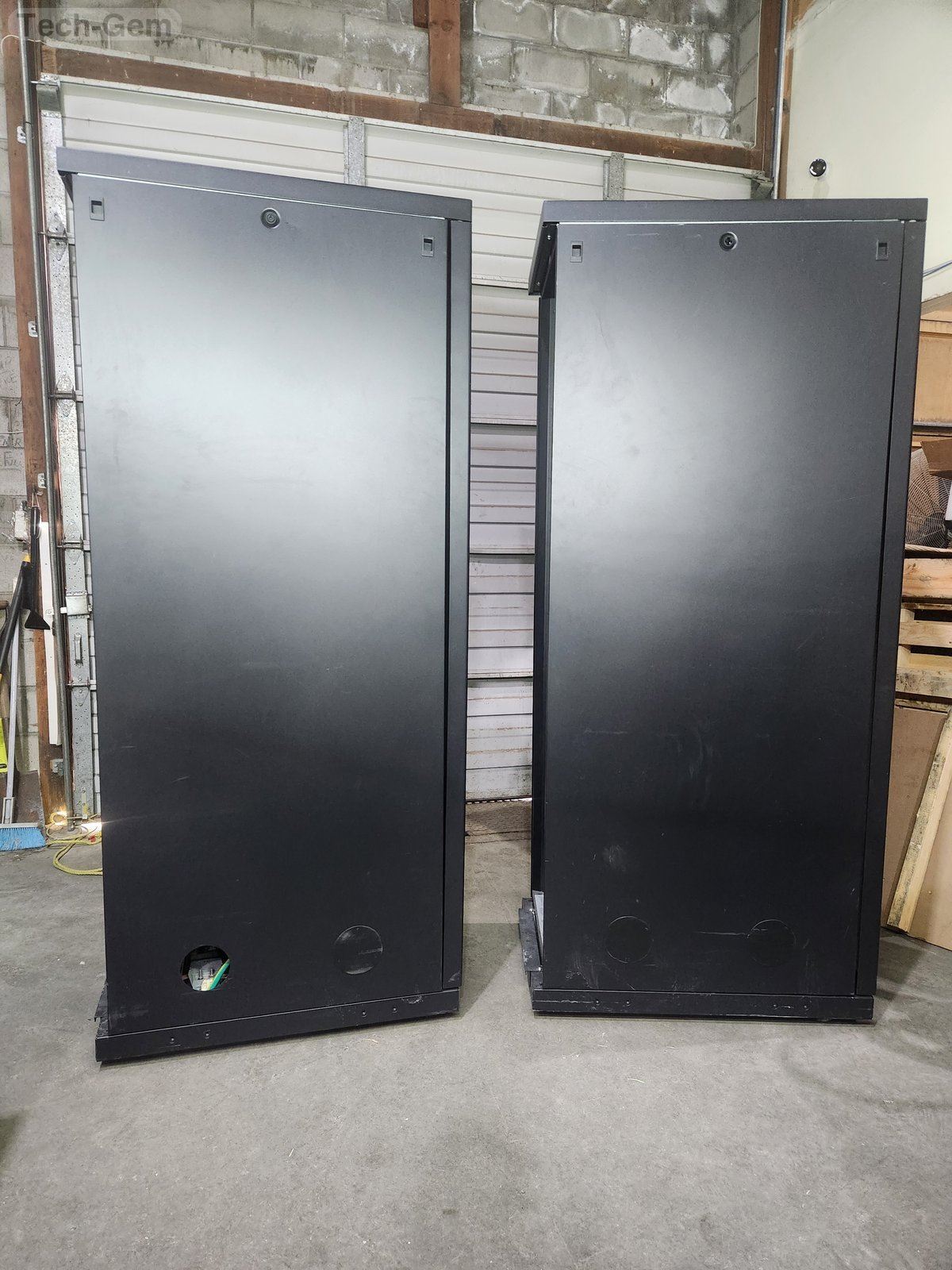 Lot of 2 APC Symmetra PX Battery Enclosures (Model: SYCXR8) installed in APC NetShelter AR2800X102 server cabinets. One enclosure has 4 battery modules with a total of 16 SYBTU1-PLP batteries, while the other has 7 modules with a total of 28 SYBTU1-PLP batteries. Each enclosure is rated at 192VDC, 112A for extended runtime. Units were pulled from a working environment, but battery life is not guaranteed.