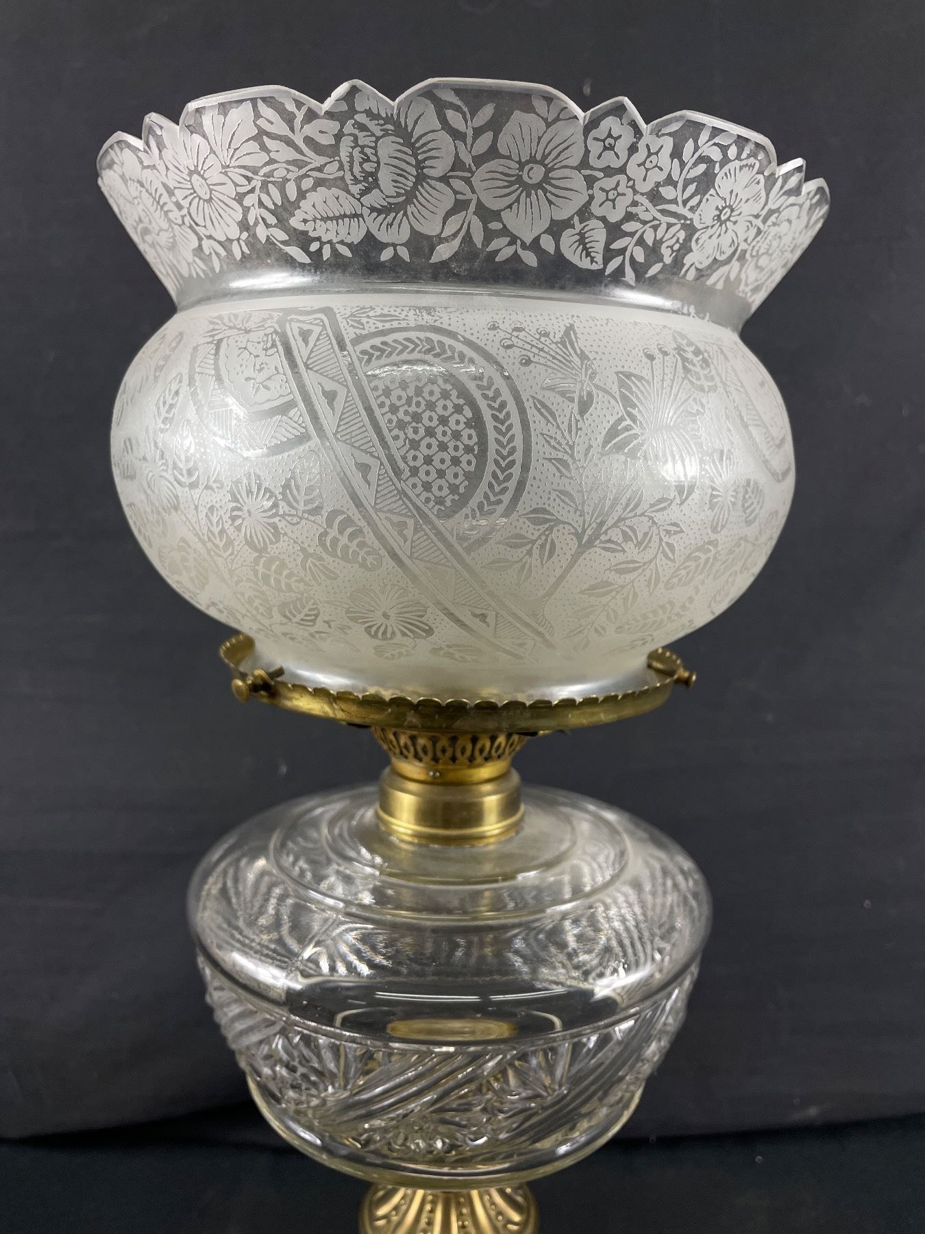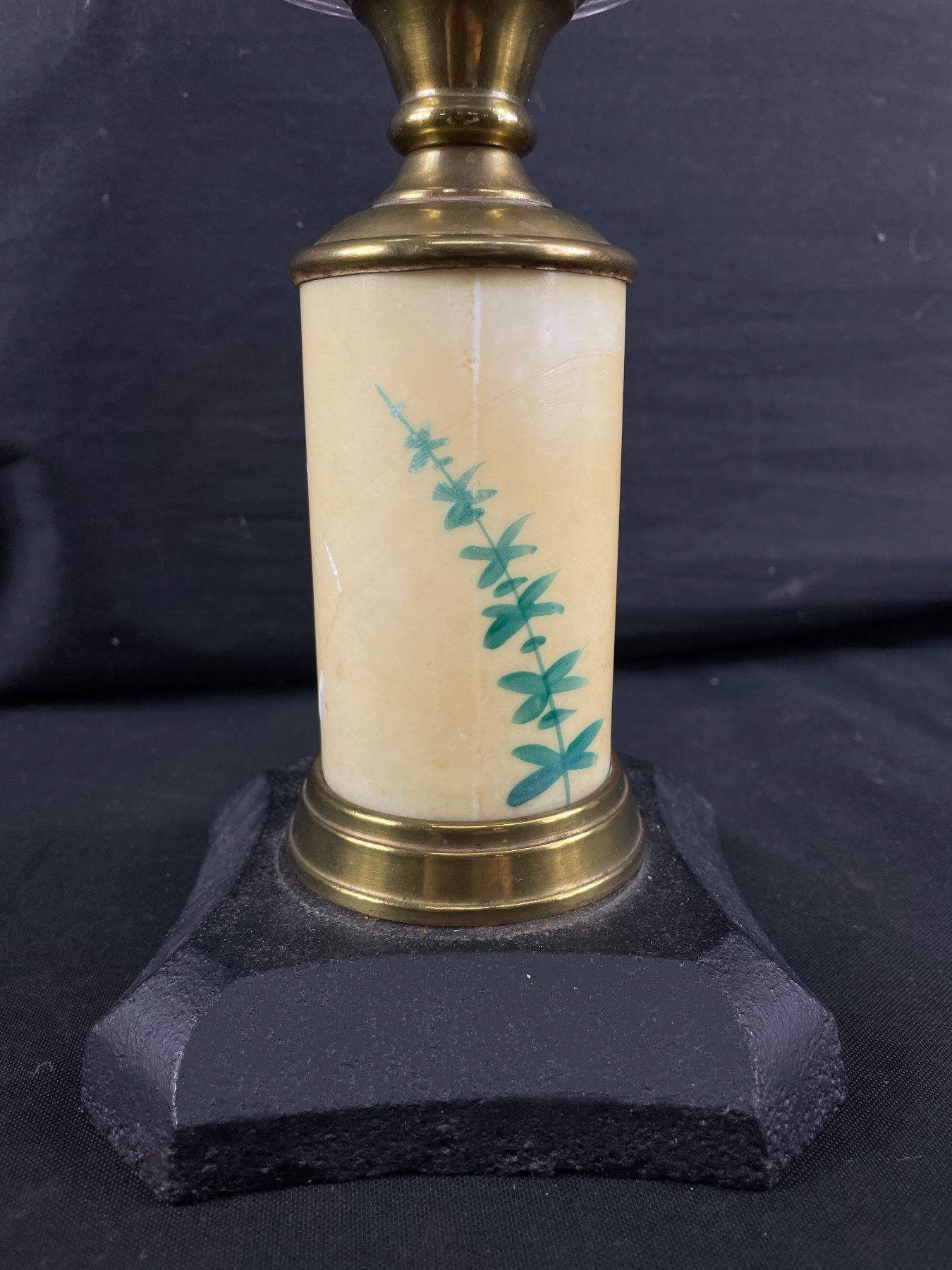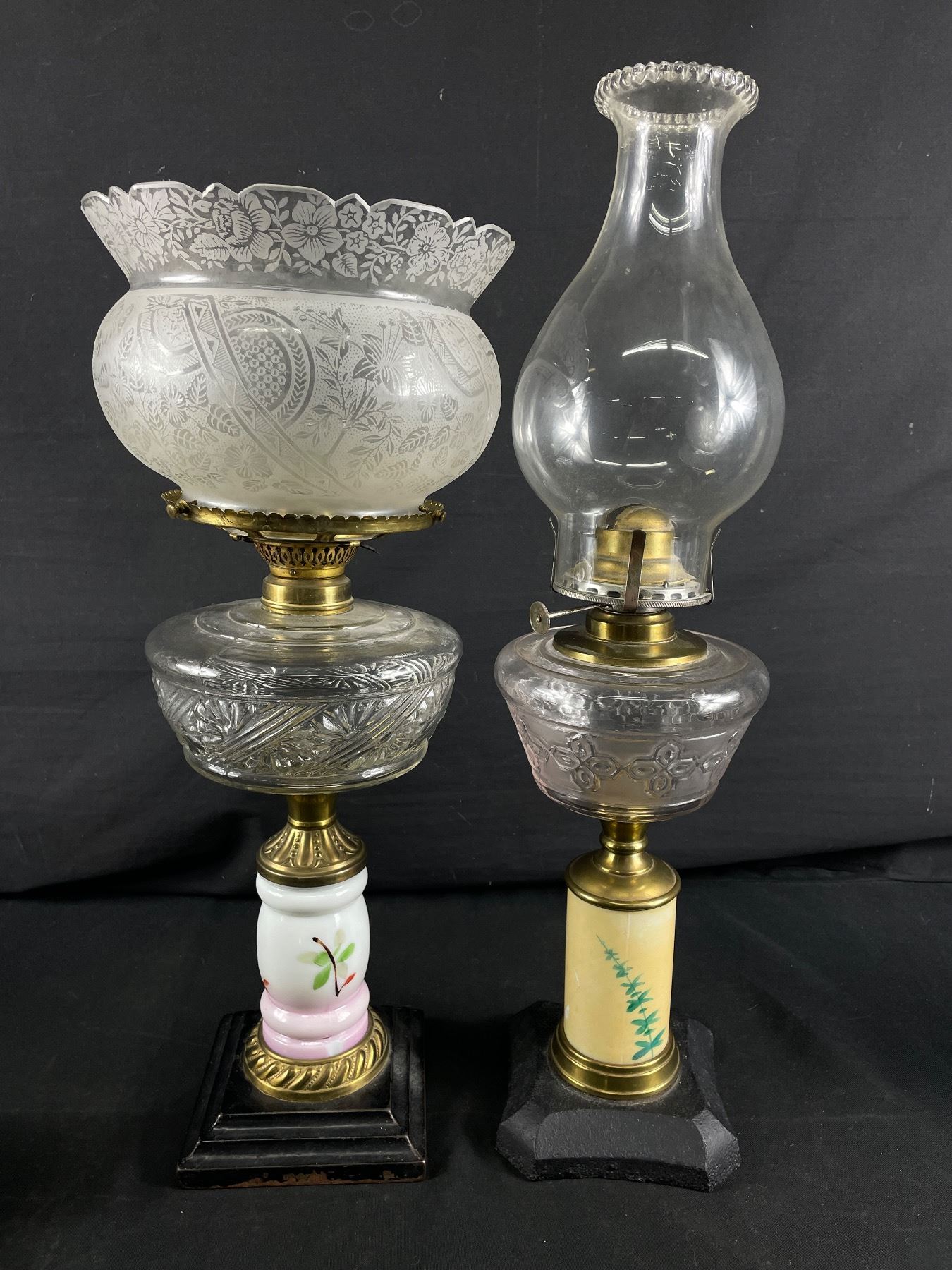 Lot of 2 Antique Hurricane Lamps with Etched Glass Designs & Porcelain Bases. 1 Base Broken, Please see Photos.