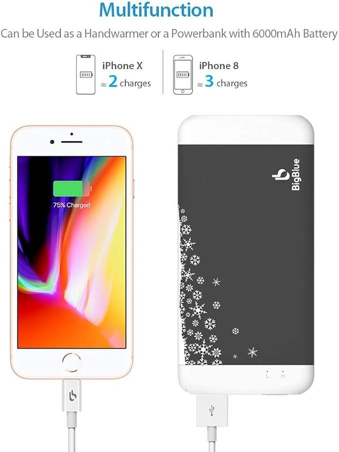 - BigBlue Rechargeable 3-in-1 6000mAh Hand Warmer, Electric Reusable Hand Warmer Charger with Emergency Light for Winter Sports, Ski, Hiking, Camping, Gift-Giving and More,Black