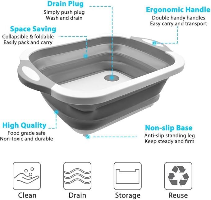 - Collapsible Cutting Board with Colander, Folding Dish Washing Tub, Food Grade Sink Storage Basket for Washing and Draining Foods, Vegetables, Fruits, Salad etc.