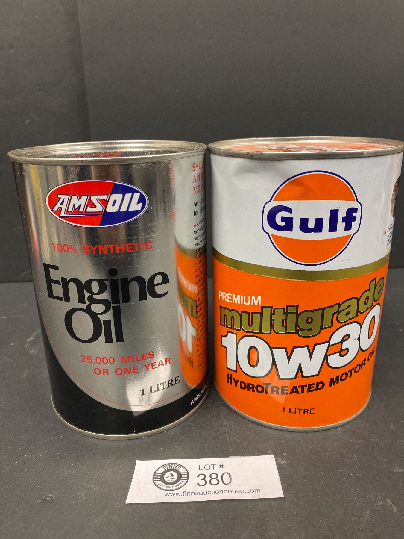 Lot of 2 Collectible Tins - Gulf Multigrade 10W30 Motor Oil 1 Litre - Full and Amsoil Engine Oil 1 Litre - Full