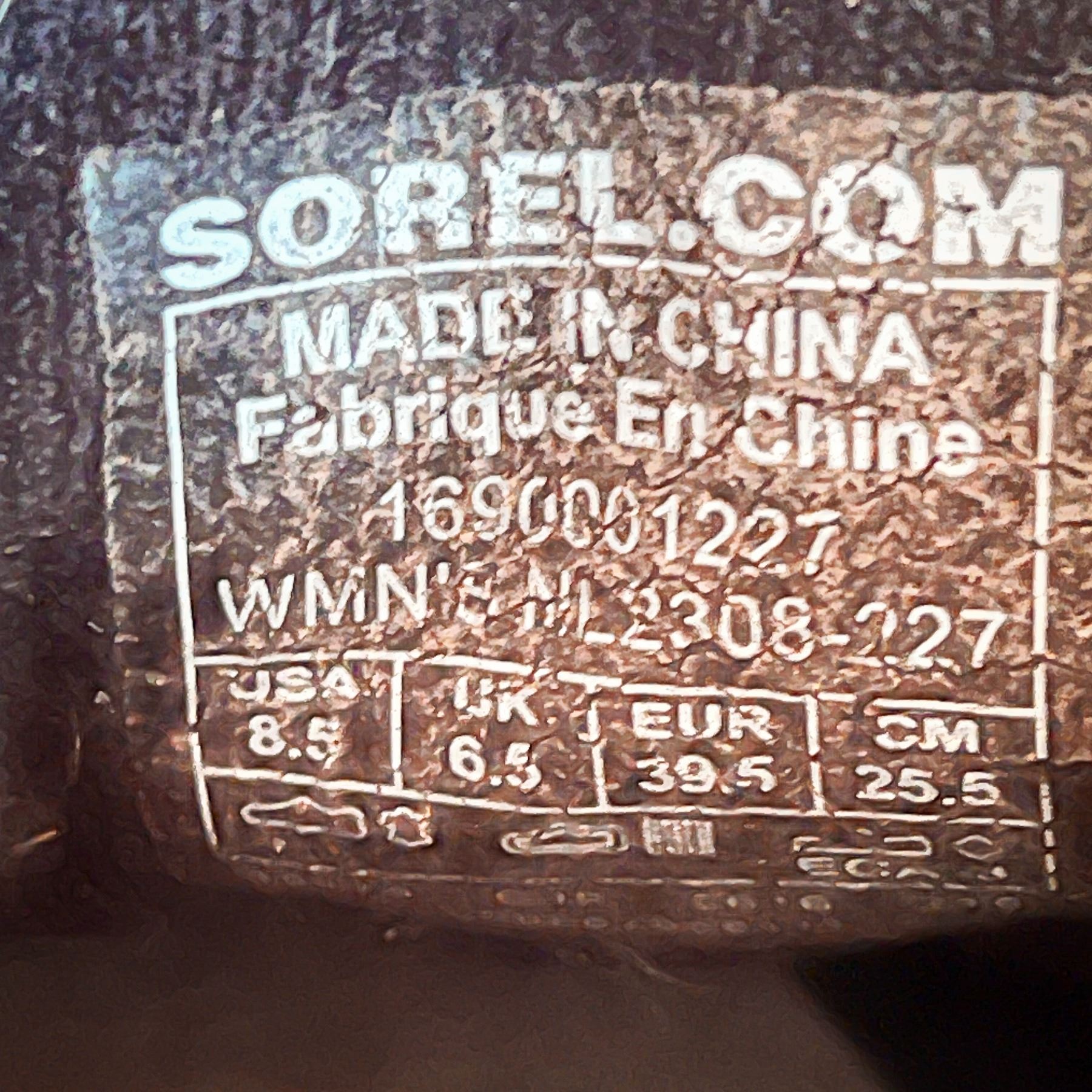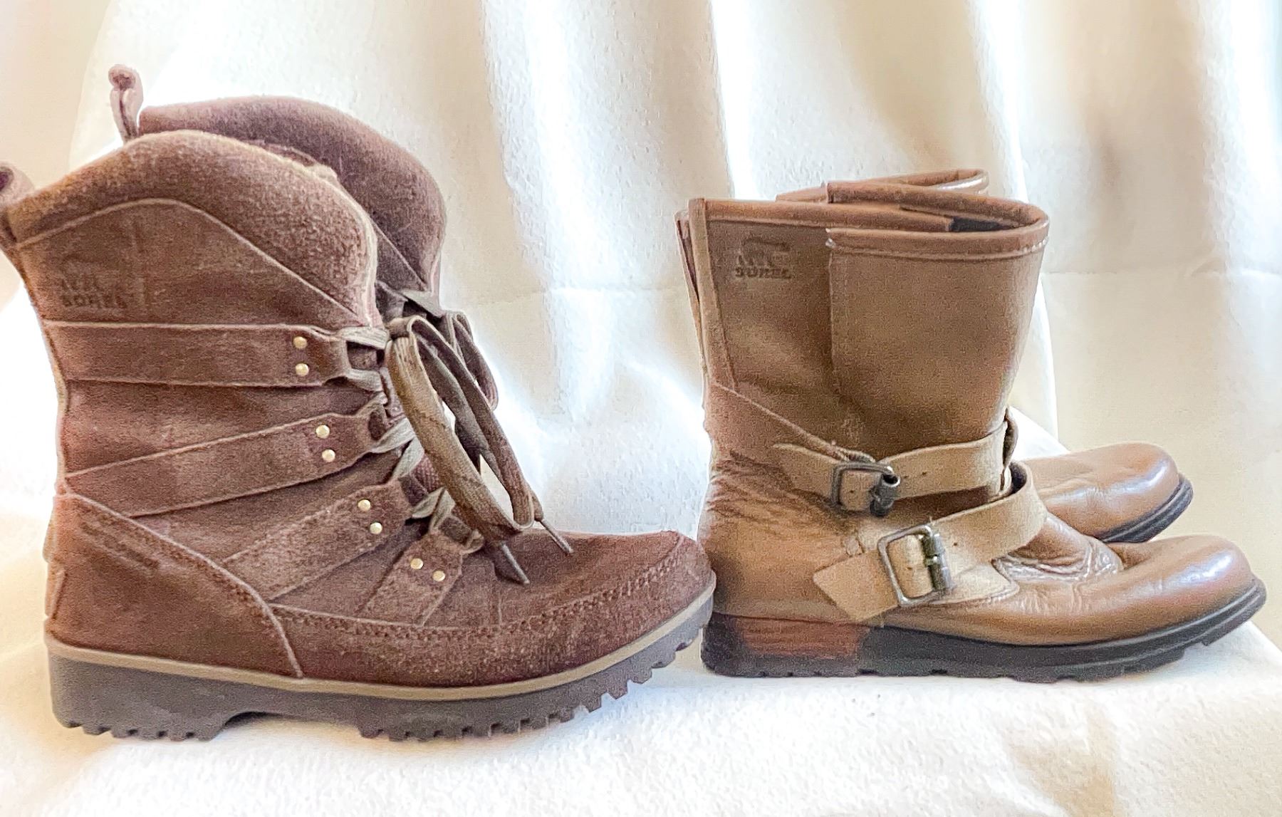 Two pairs of authentic Sorel booties in good used condition. Includes suede lace-up winter boots and leather buckle-strap ankle boots. Both sturdy and stylish, perfect for cold weather wear. Women’s size 8.5–9.