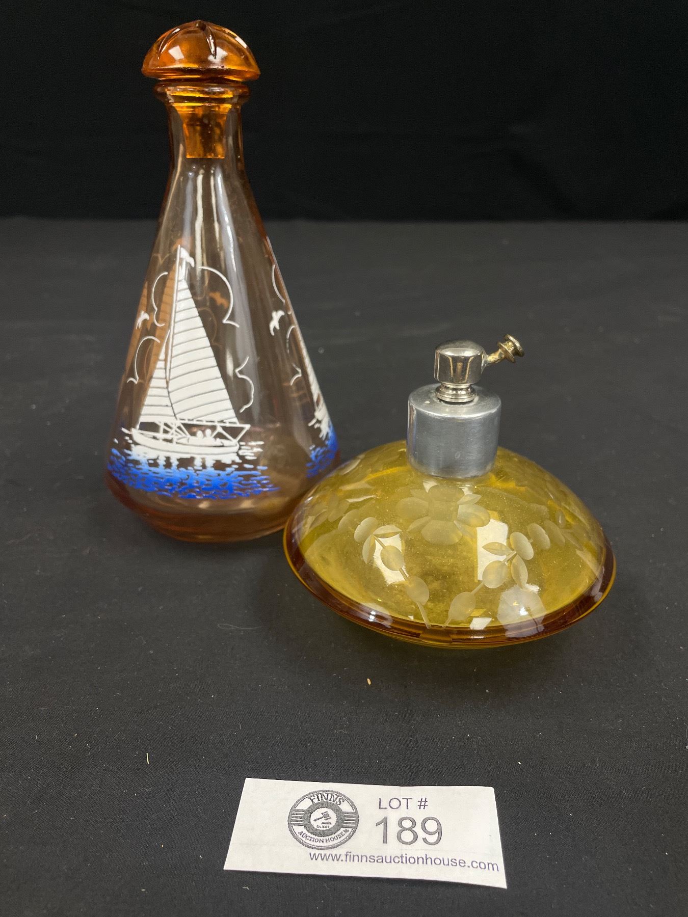 Lot of 2 Pieces of Depression Glass - Pink and Amber - Decanter and Perfume