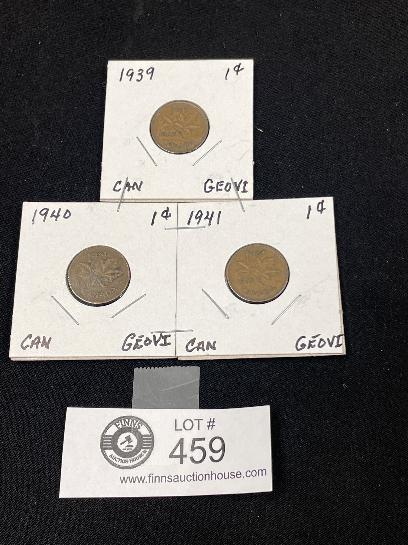 Lot of 3 Canadian Pennies 1939, 1940 and 1941 in Cardboard Holders