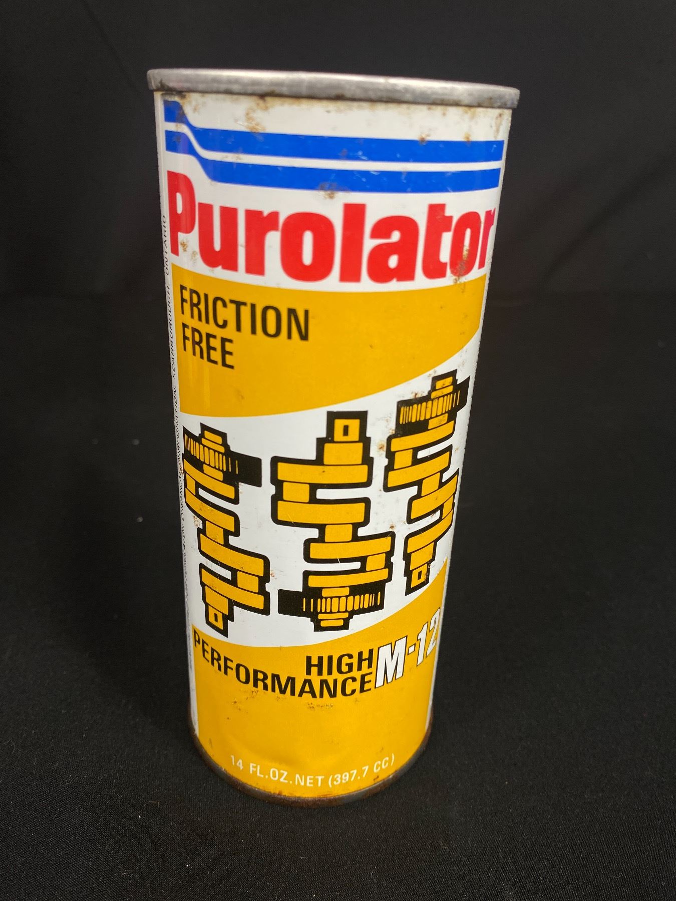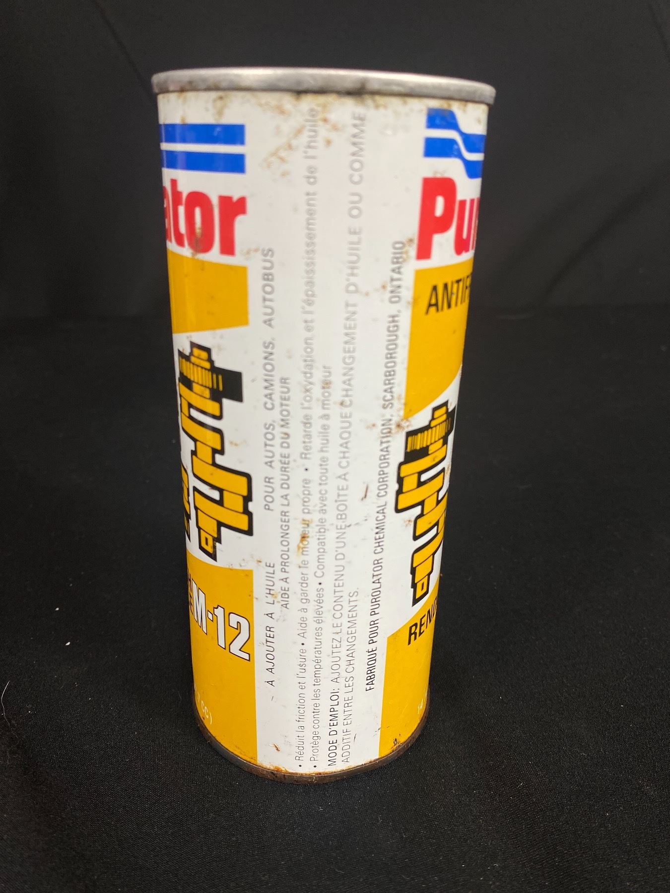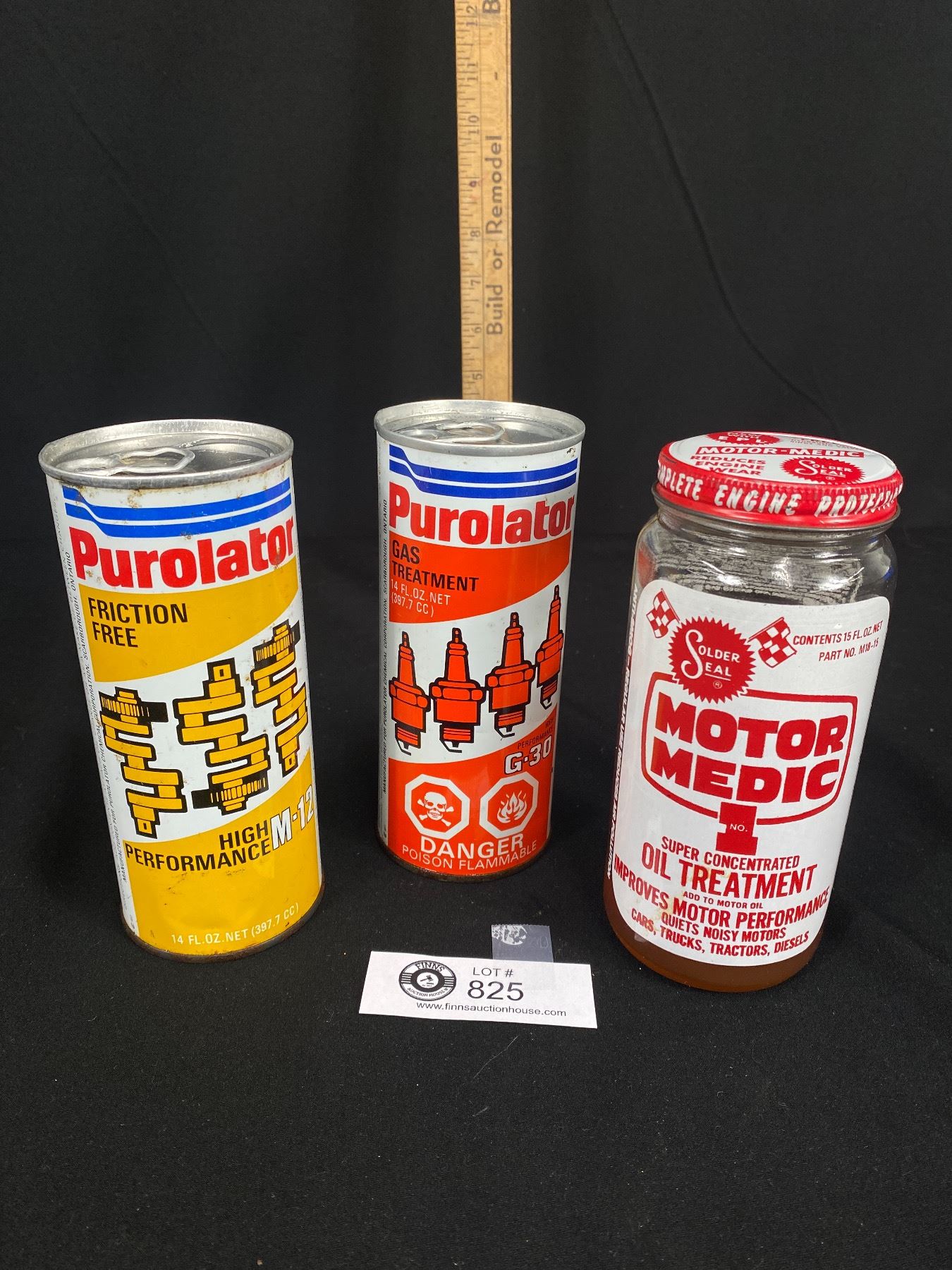 Lot of 3 Oil and Gas Treatment Tins/Bottle - Purolator Gas Treatment 14 Fluid Ounce Tin - Full, Solder Seal Oil Treatment 15 Fluid Ounce Bottle with Contents and Purolator Friction Free High Performance M-12 - Full