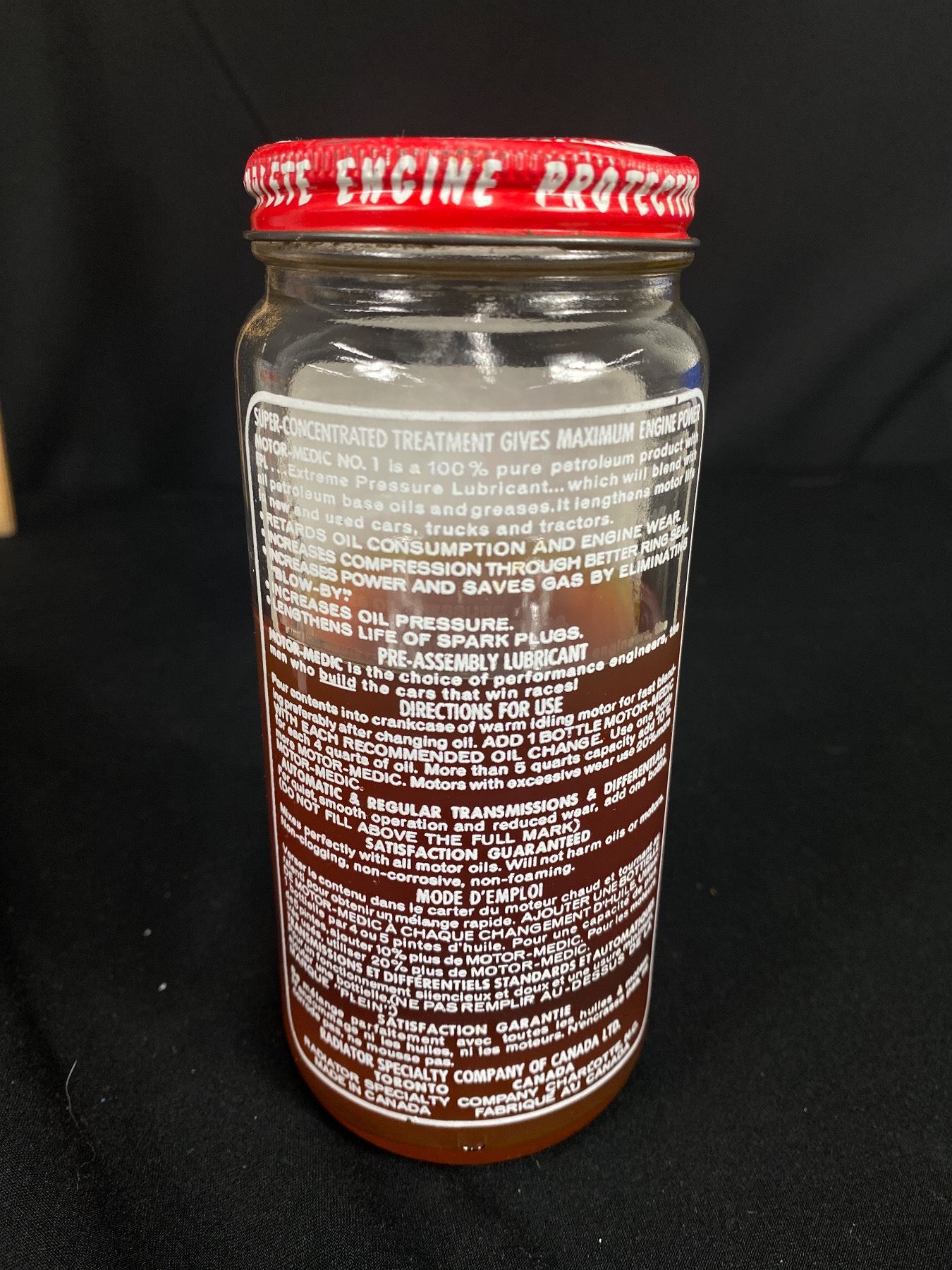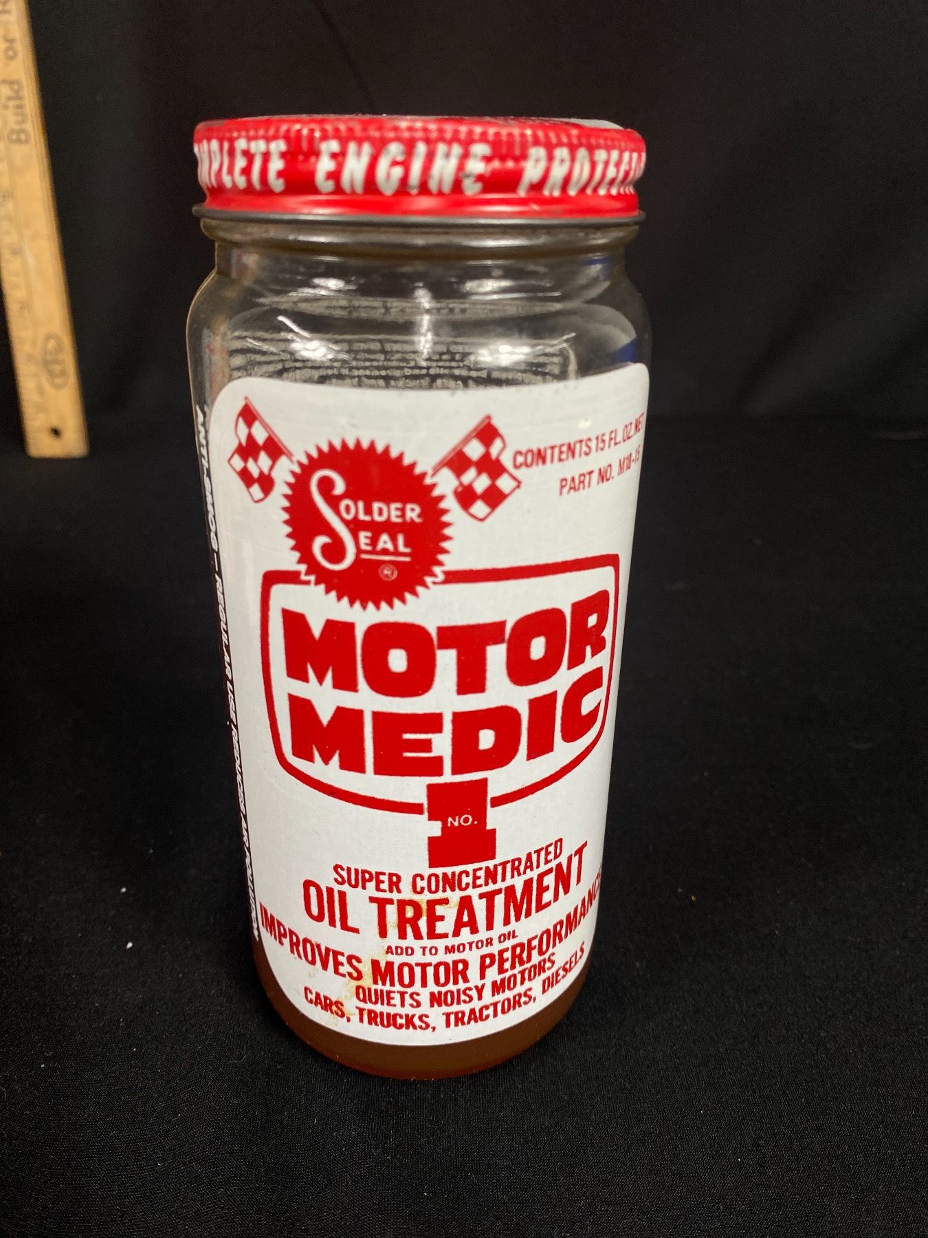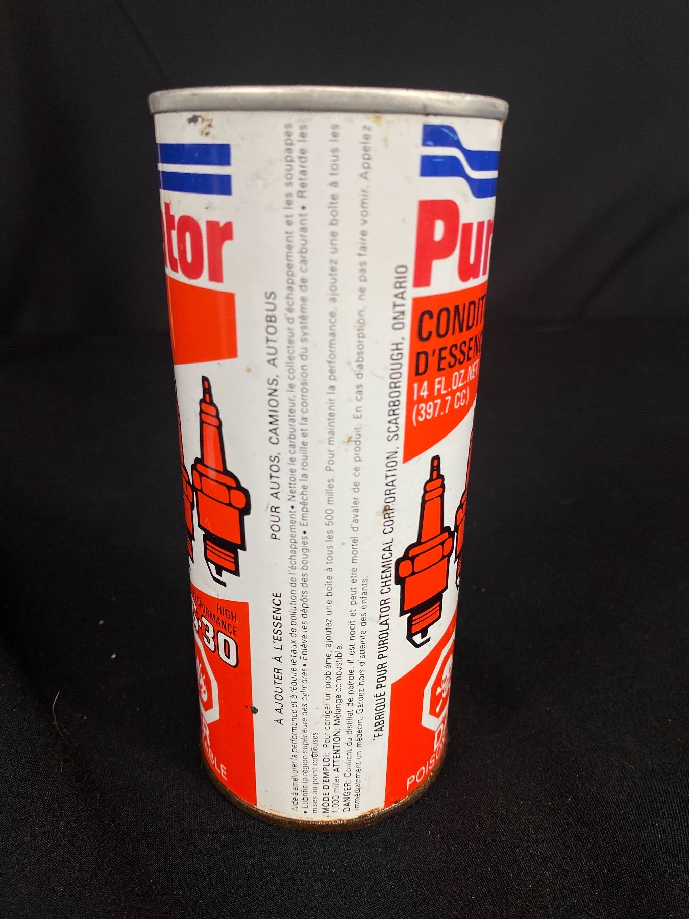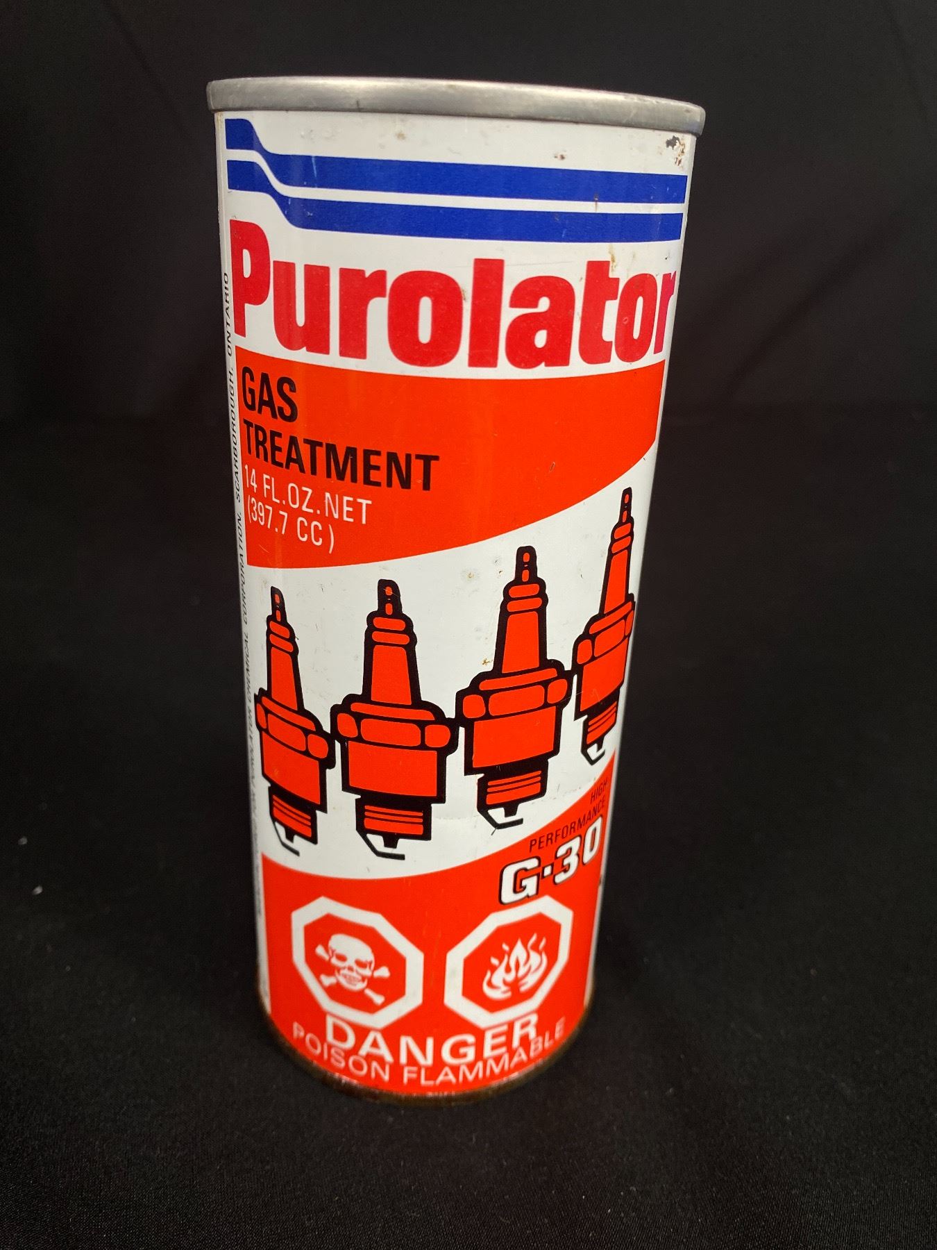 Lot of 3 Oil and Gas Treatment Tins/Bottle - Purolator Gas Treatment 14 Fluid Ounce Tin - Full, Solder Seal Oil Treatment 15 Fluid Ounce Bottle with Contents and Purolator Friction Free High Performance M-12 - Full