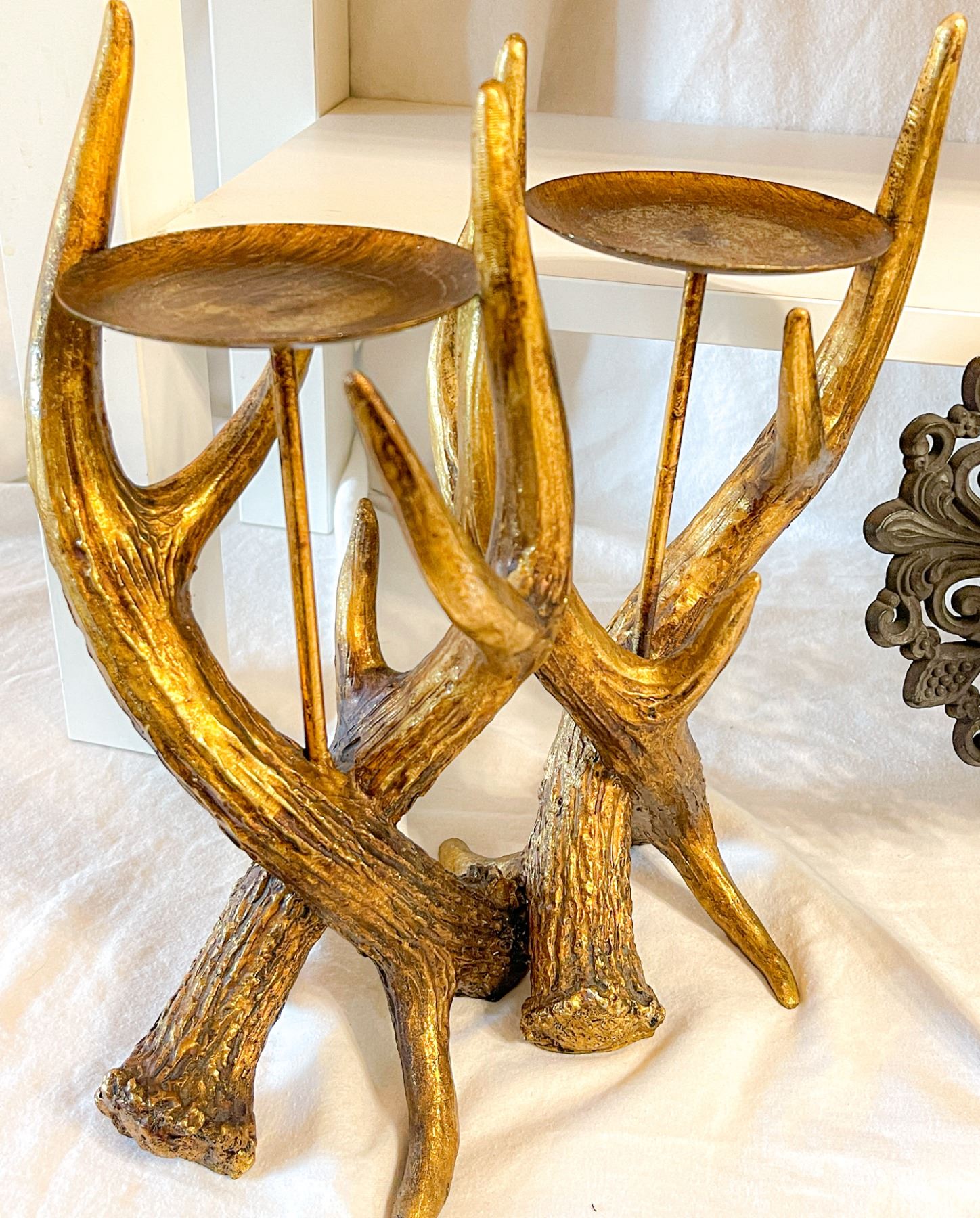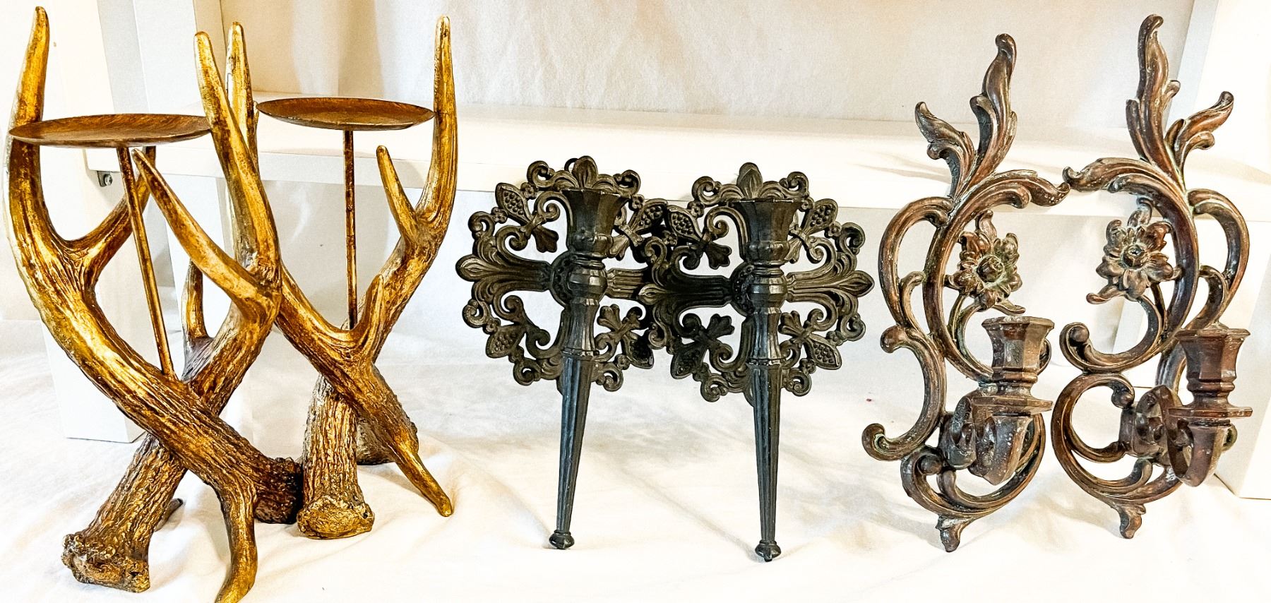 Set of three vintage candleholder pairs including one pair of gold-painted antler-style candlestick stands, one pair of ornate black plastic wall sconces by Dart Industries USA (copyright MCMLXIV – 1964), and one pair of rococo-style bronze-tone wall sconces by Syroco Inc. USA.