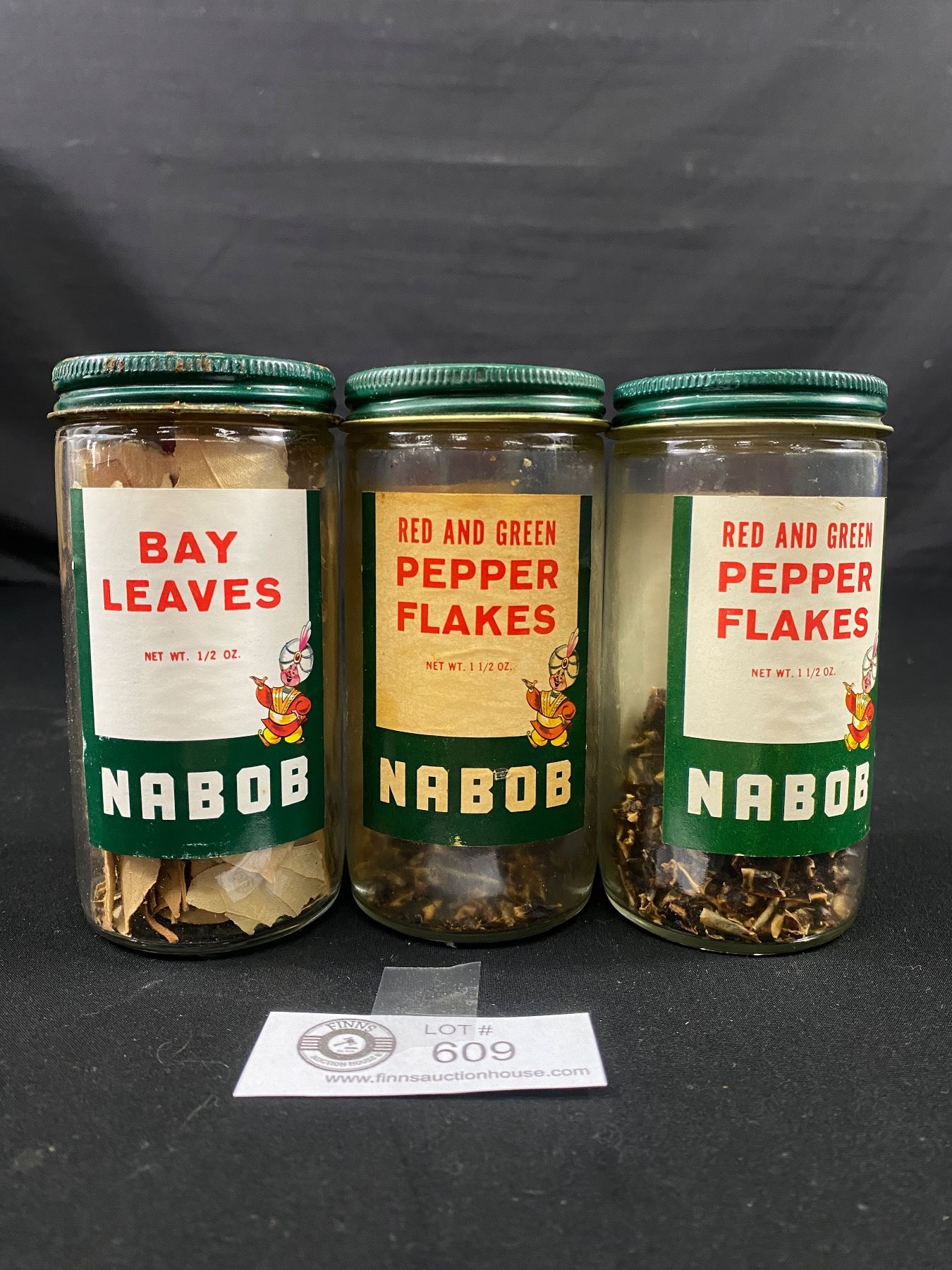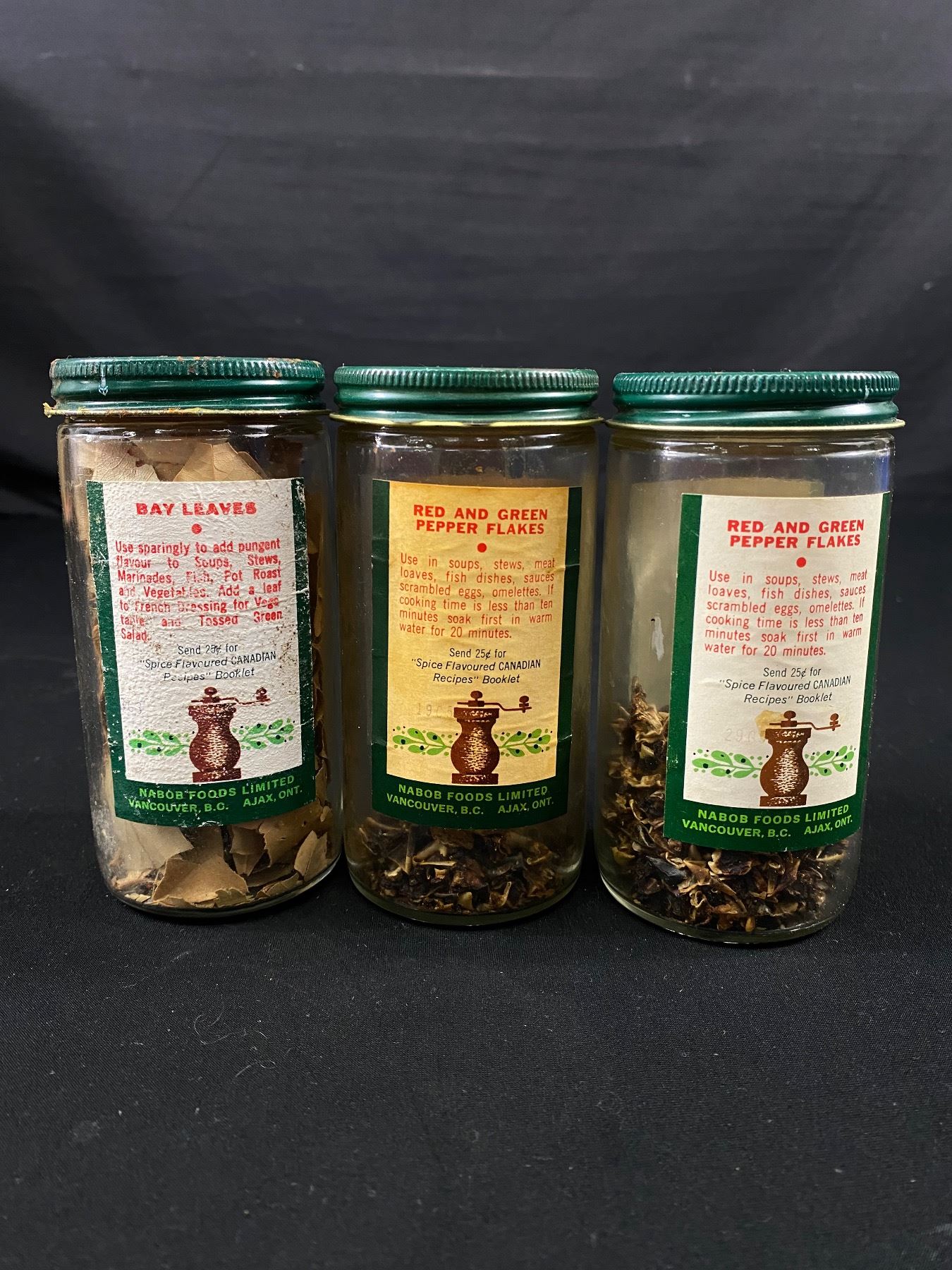 Lot of 3 Vintage Nabob Spice Jars. Bay Leaves and Red and Green Pepper Flakes