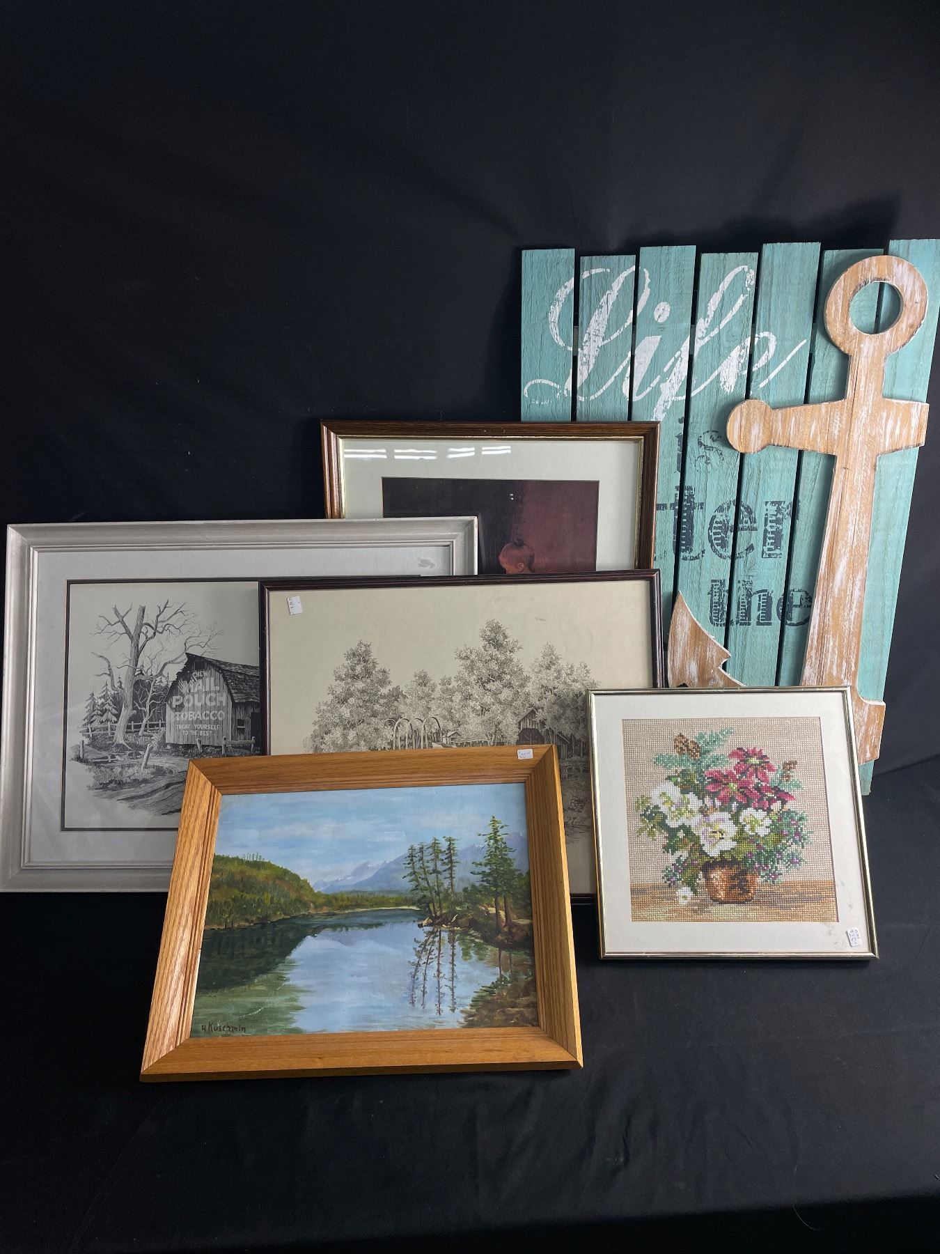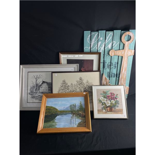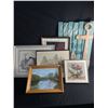 Lot of 5 Vintage Pictures in Frames and 1 Shabby Chic Painted Wooden Sign. No Shipping