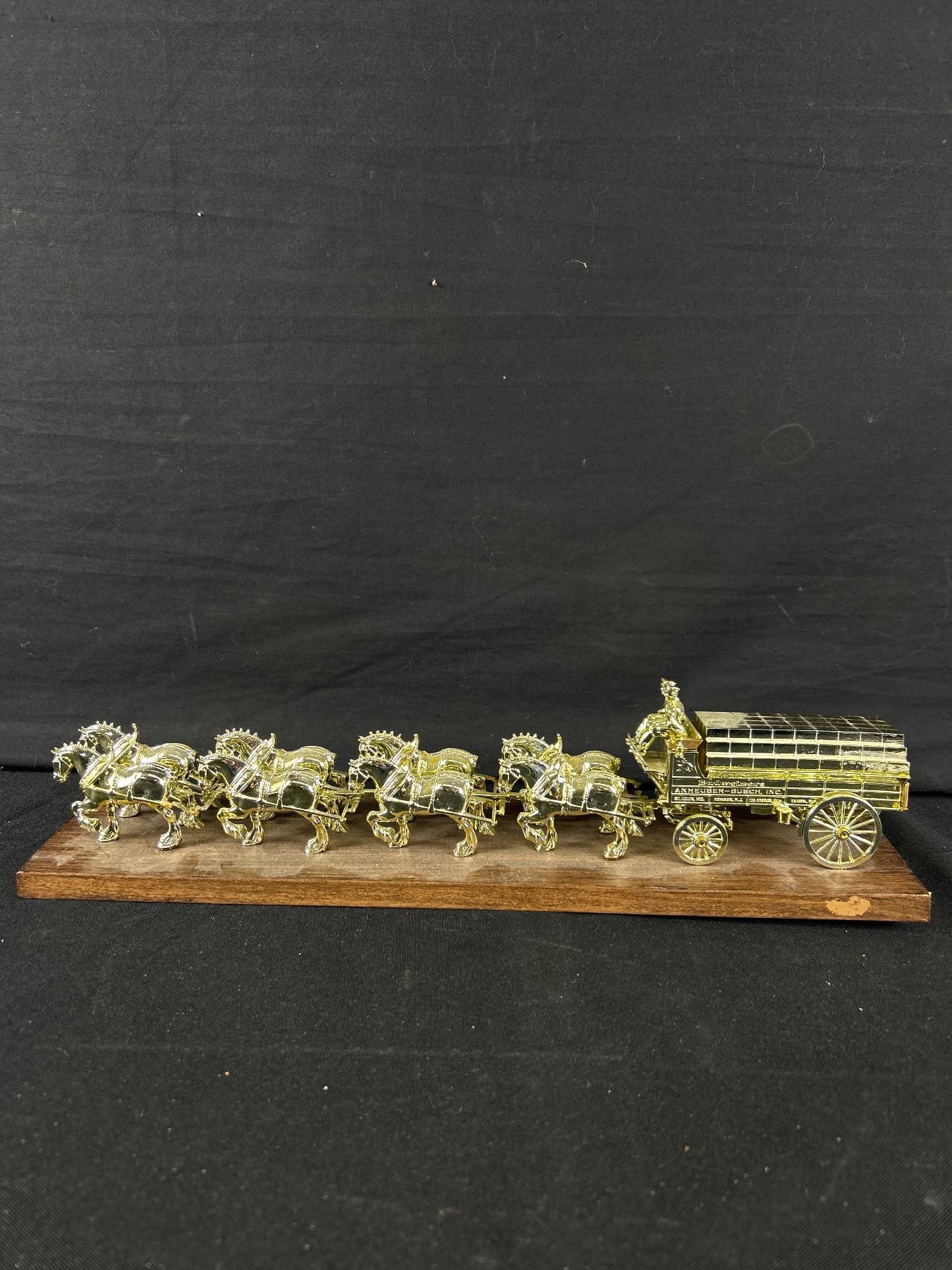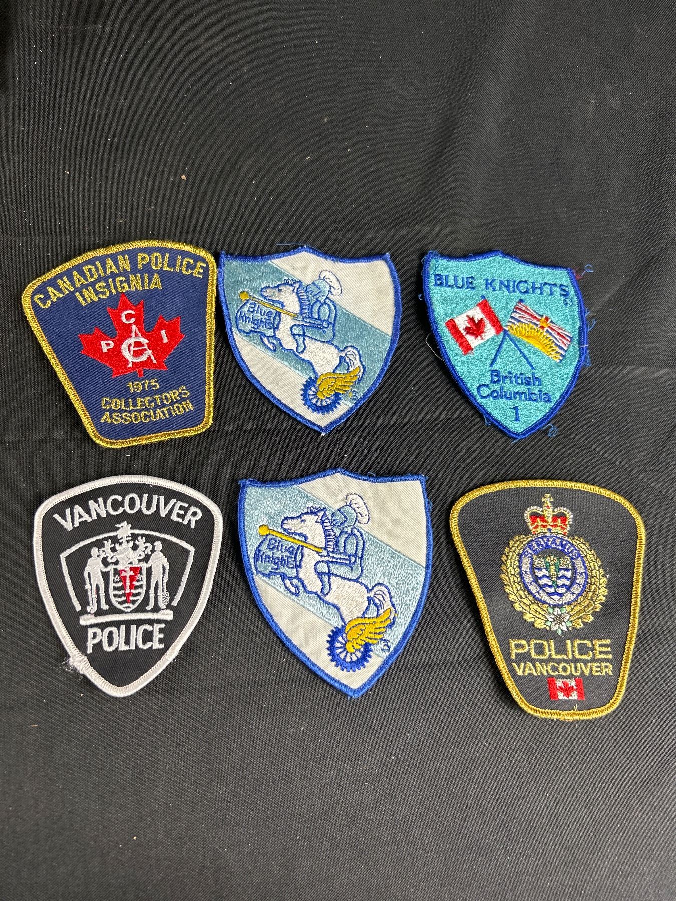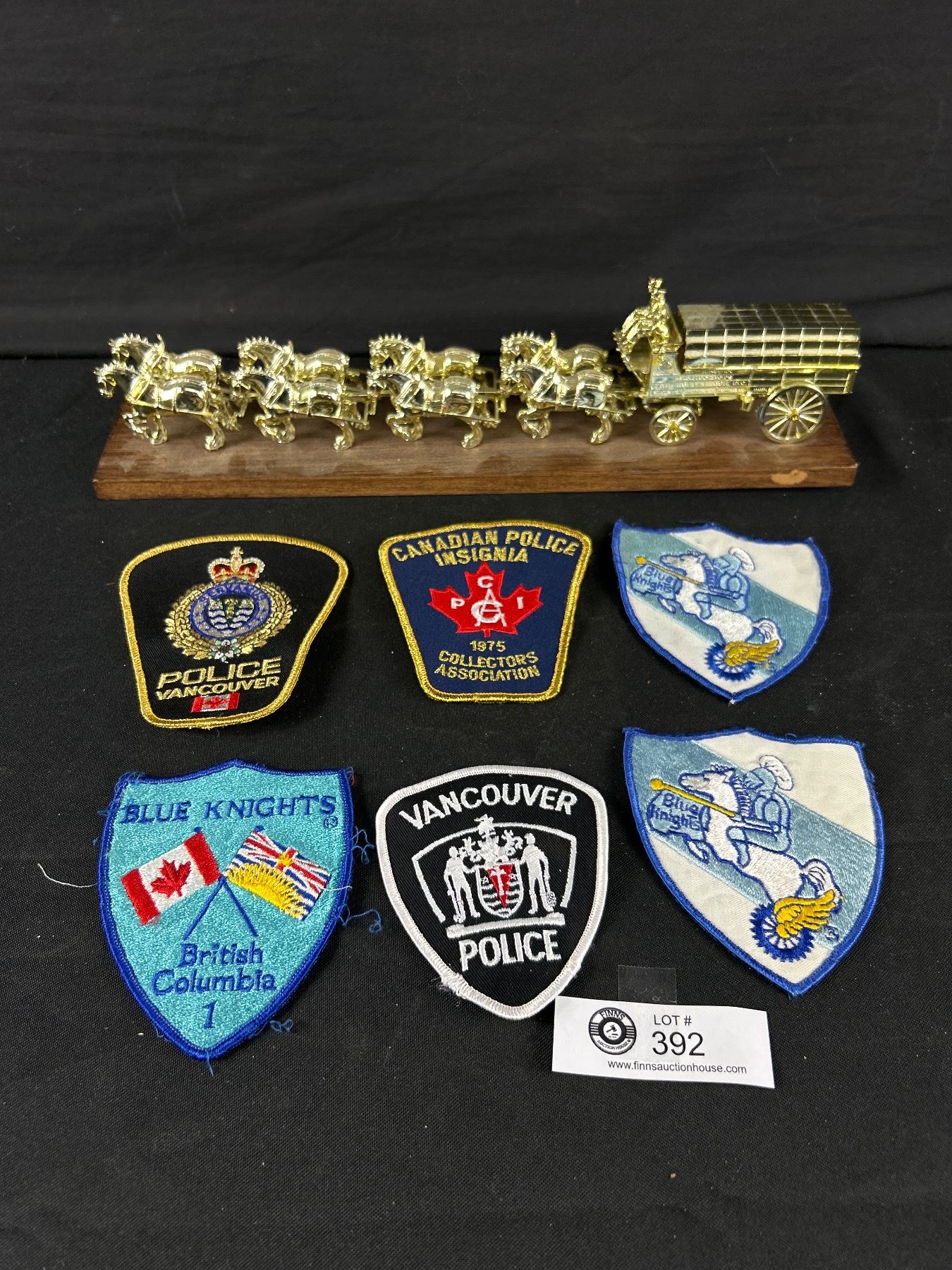 Lot of 6 Police & Blue Knights Arm Patches and a Plastic Budwiser Beer Advertising Clydesdale Horse Team ( From a Clock)