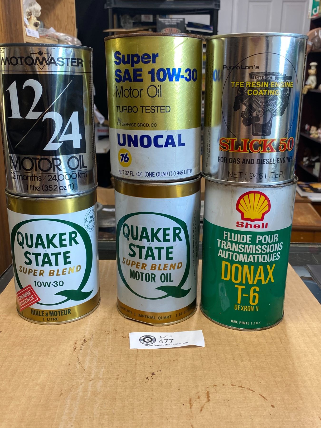 Lot of 6 Vintage Oil Cans. Some with Contents