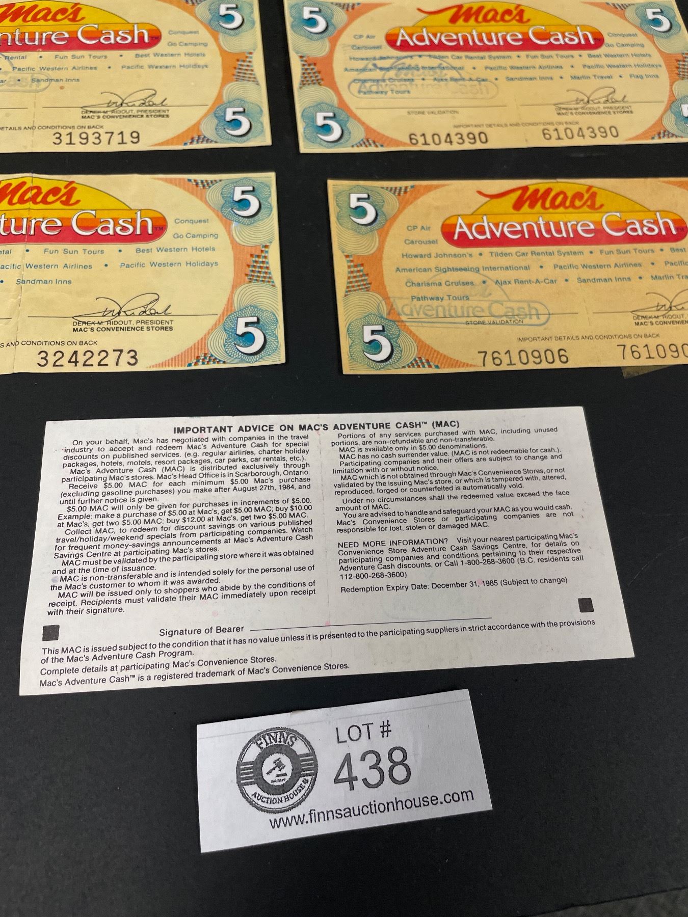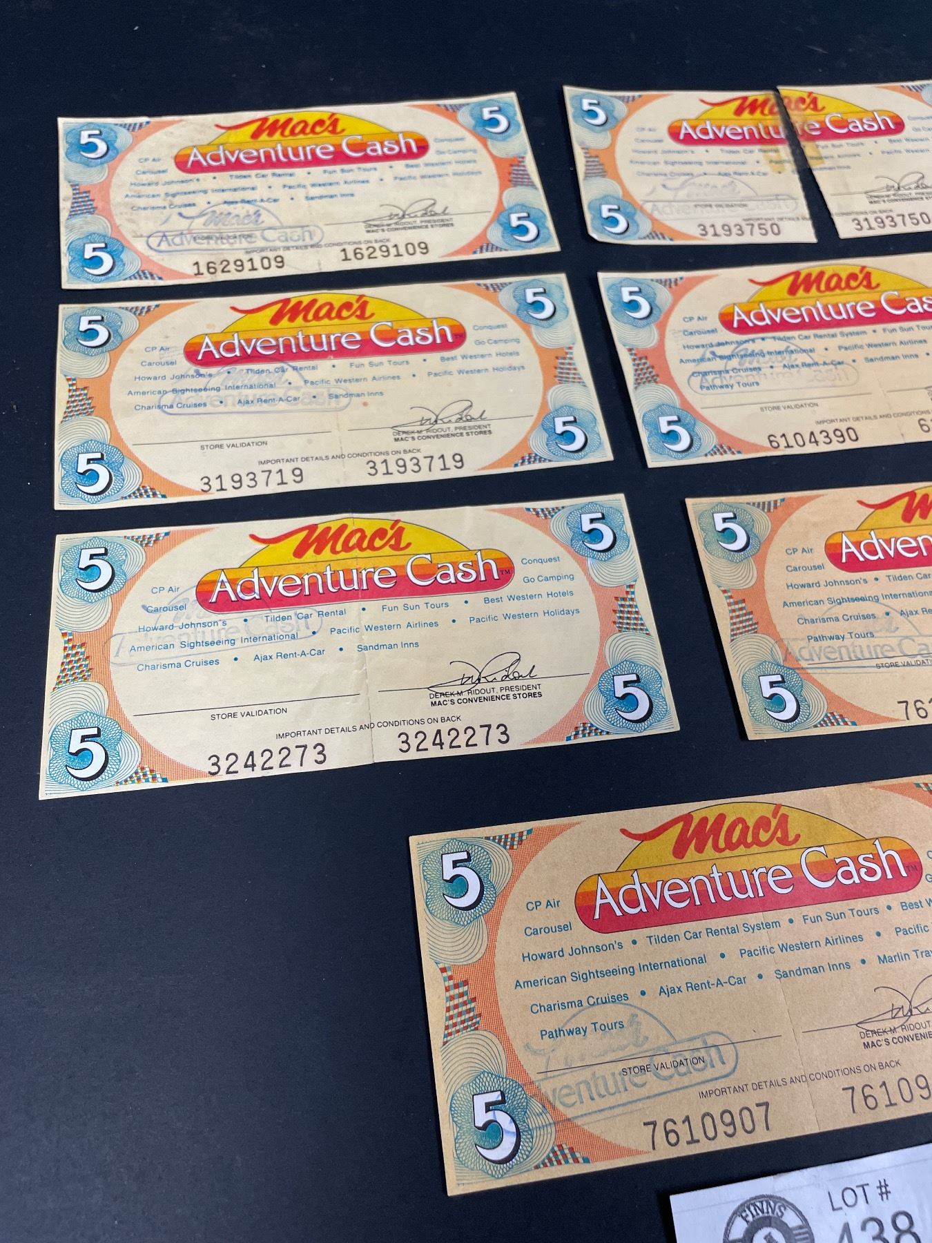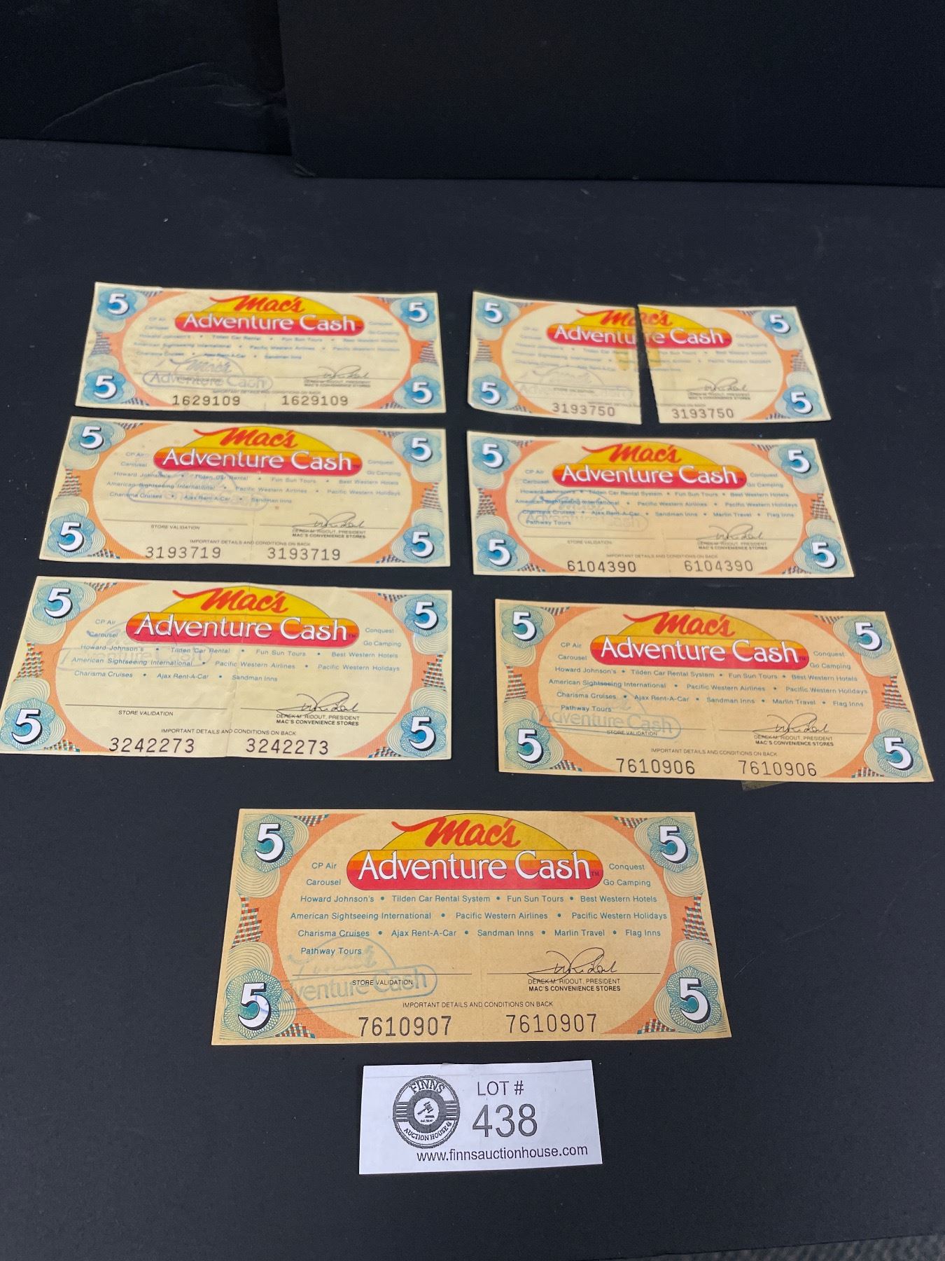 Lot of 7 Vintage Mac's Convenience Sore $5 Adventure Cash Notes 1985