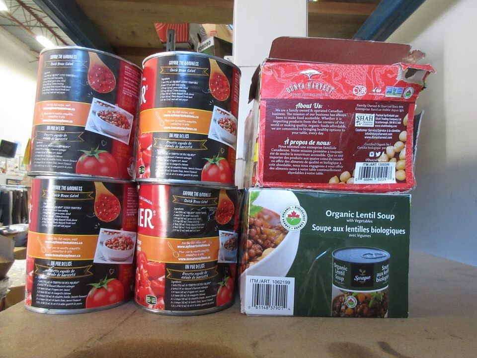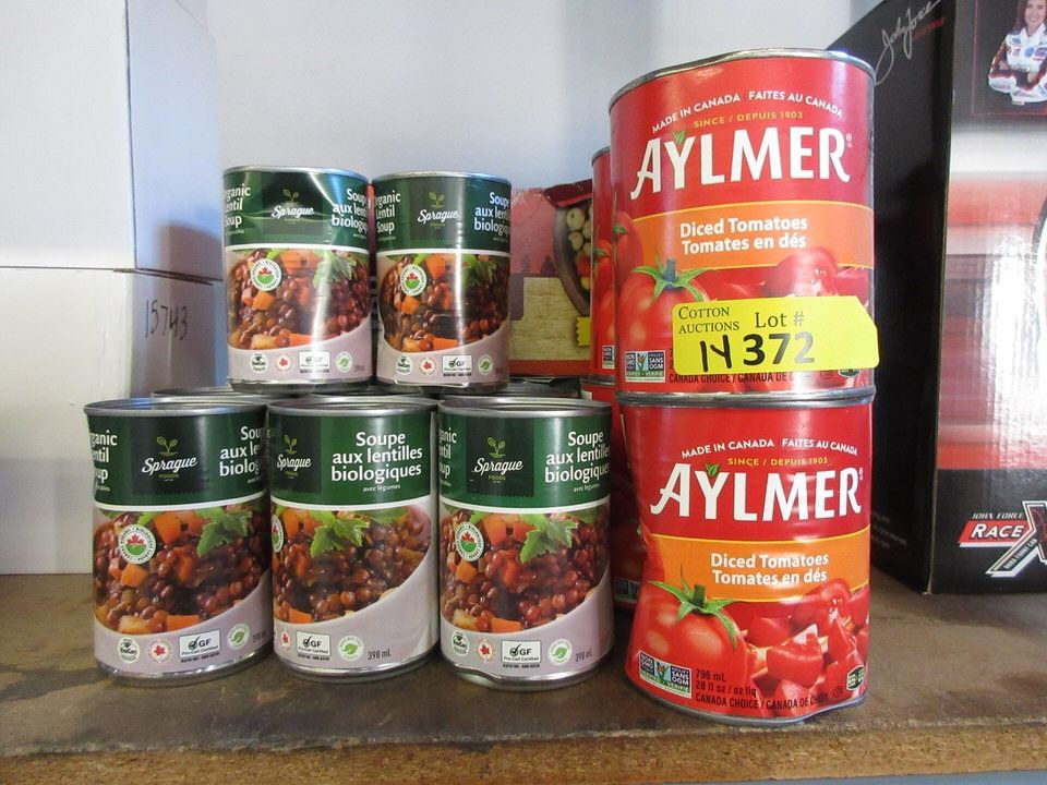 Four 796 ml cans of Aylmer diced tomatoes, eight 398 ml cans of Sprague organic lentil soup plus one case, case of chick peas. BB all May 2020 - Feb 2024