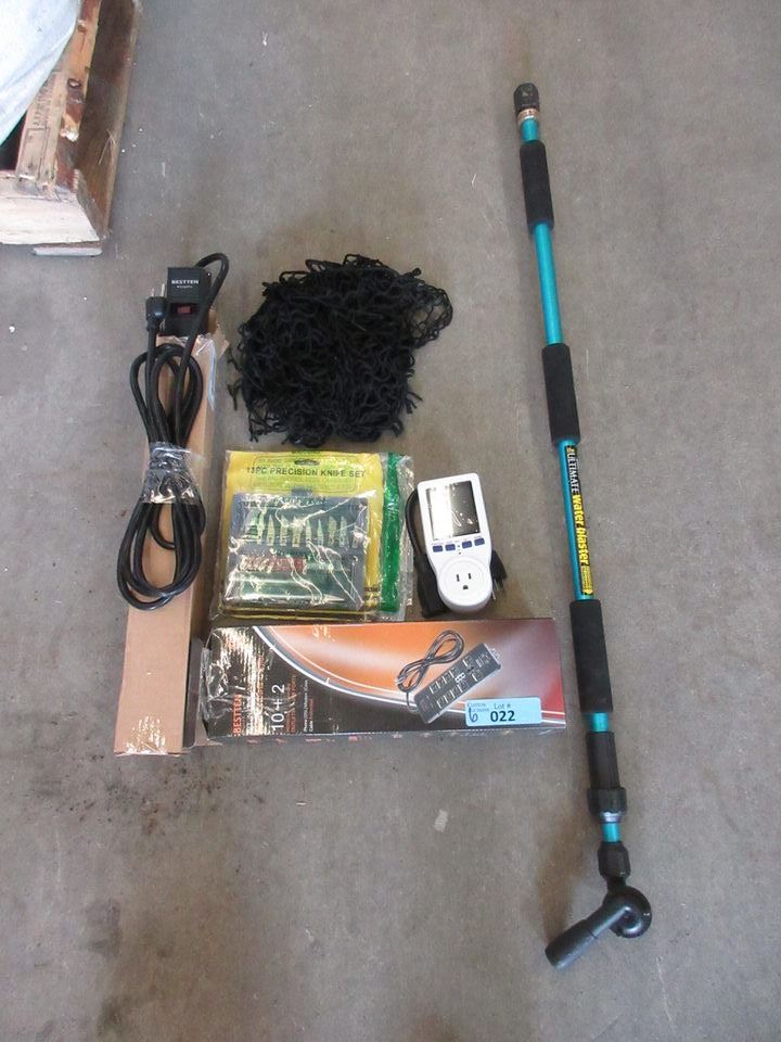 2 Power bars, water blaster, cargo net, 13 piece precision knife set & electric timer