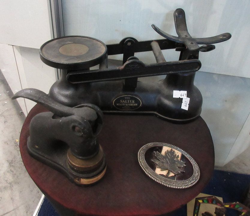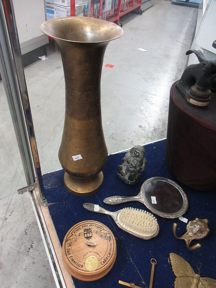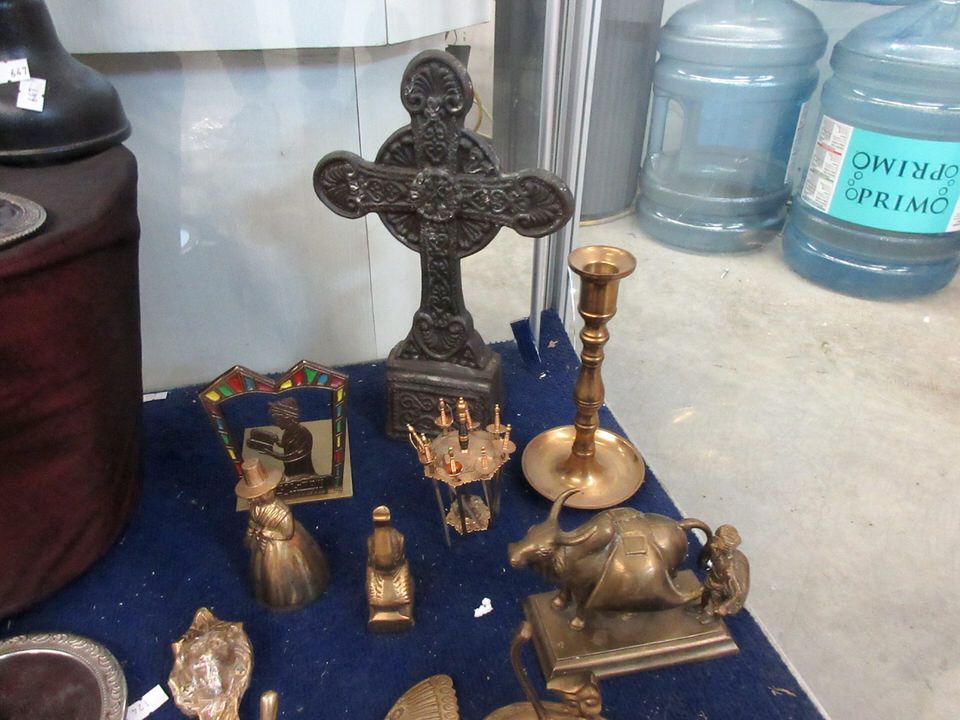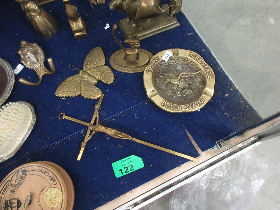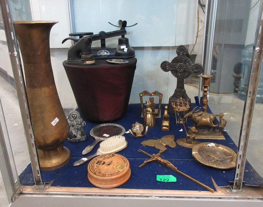 Vintage silver plated brush and mirror, Italian State Forestry ashtray, cast metal Salter scale, bookend, crucifix, candlestick, vase (16" tall x 6" diameter), Celtic cross and more.
