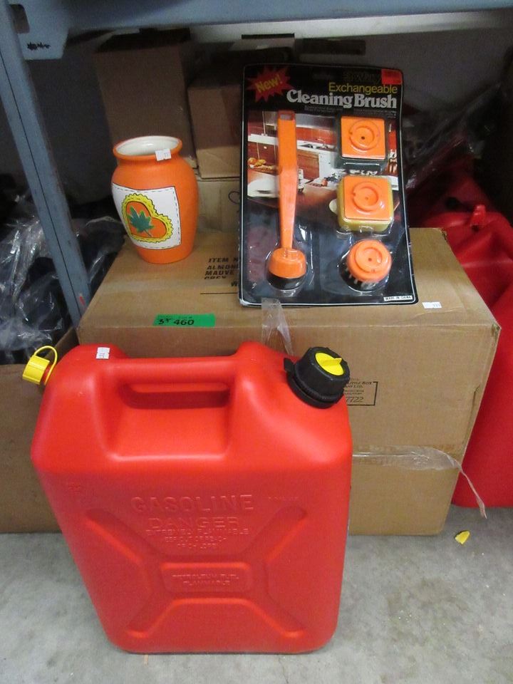 Gas can, cleaning brushes & orange vases.