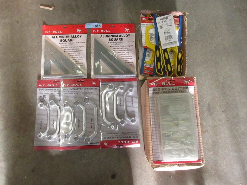 12 Mini hack saws, case of cotter pins, 2 squares & 3 wrench sets.