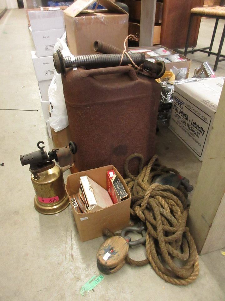 Jerry can, brass blow torch, tape measures, & wood block & tackle