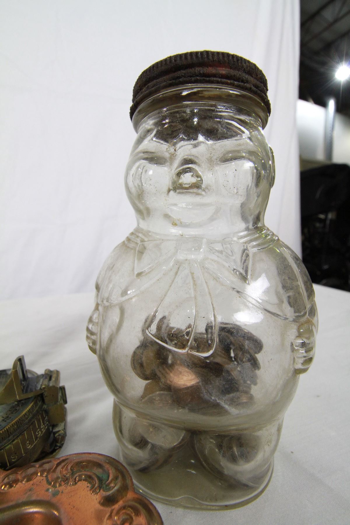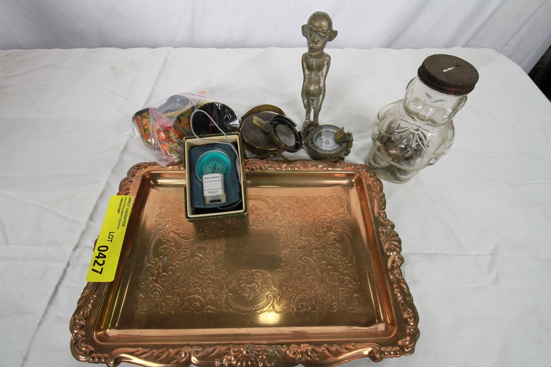 Lot of Collectables Copper Tray, Wooden Bells, Brass Measuring Tape, Brass Compass, Etc...