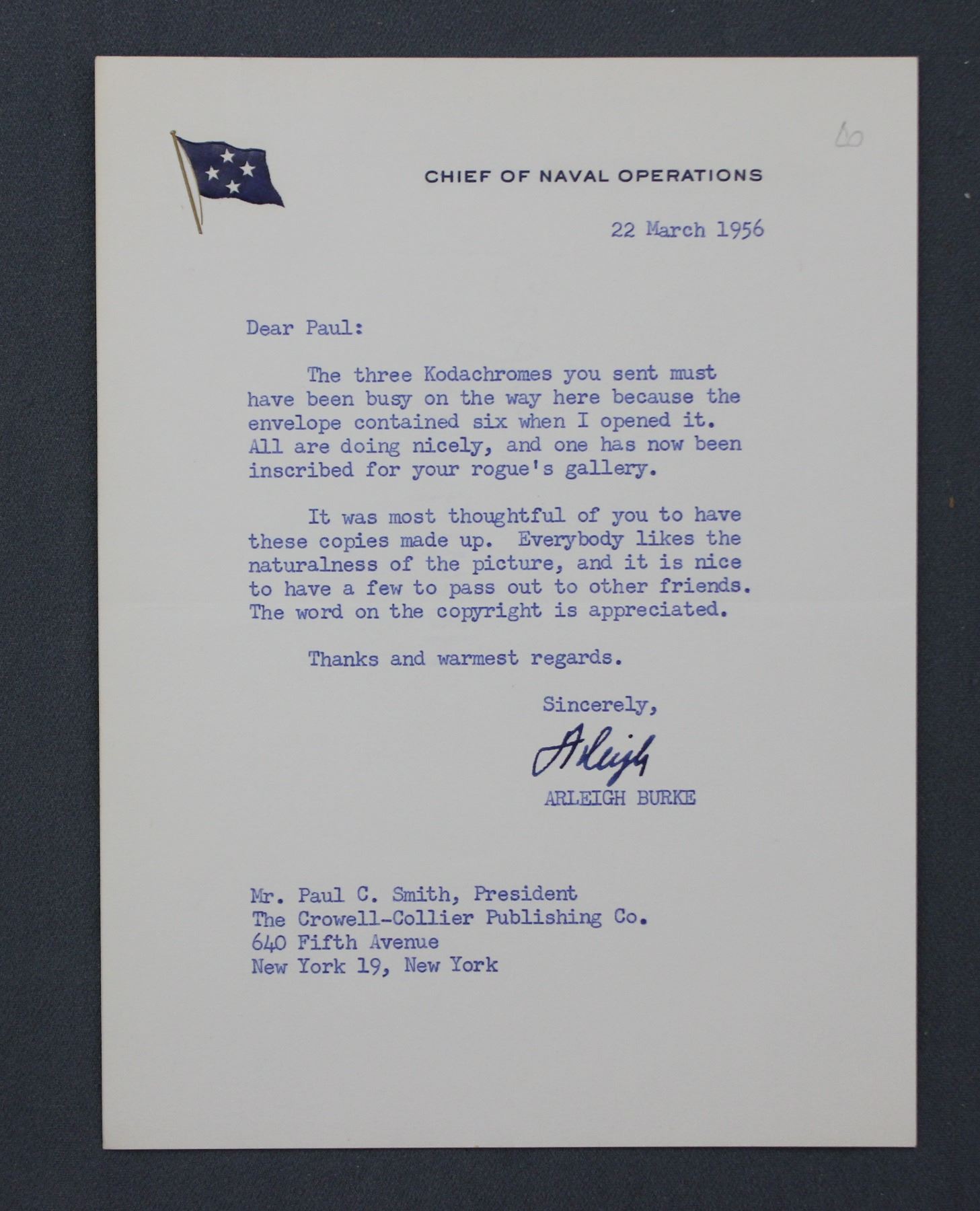 4.) Arleigh Burke "Arleigh" as Chief of Naval Operations; 7 3/4" x 5 3/4", March 22, 1956.