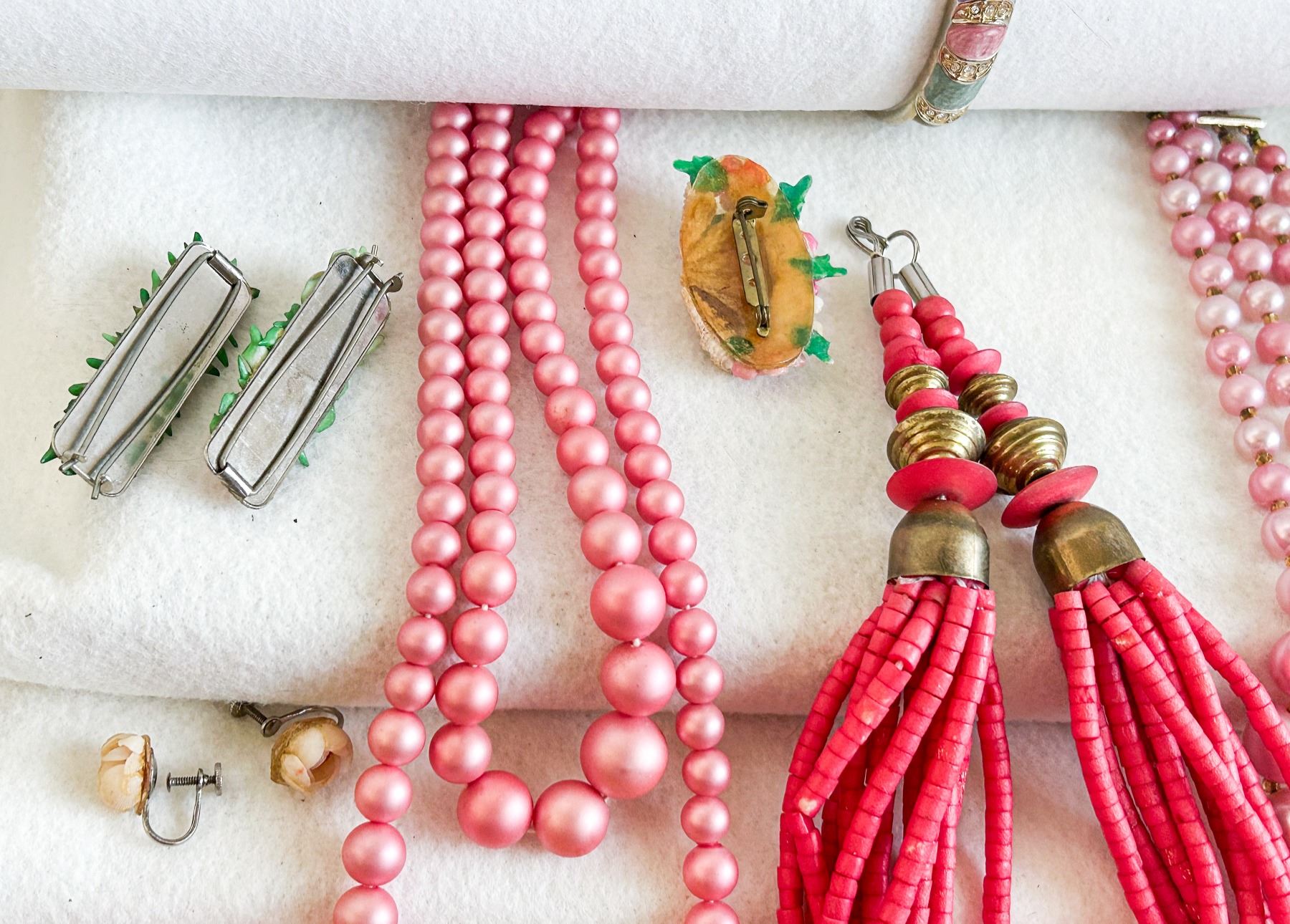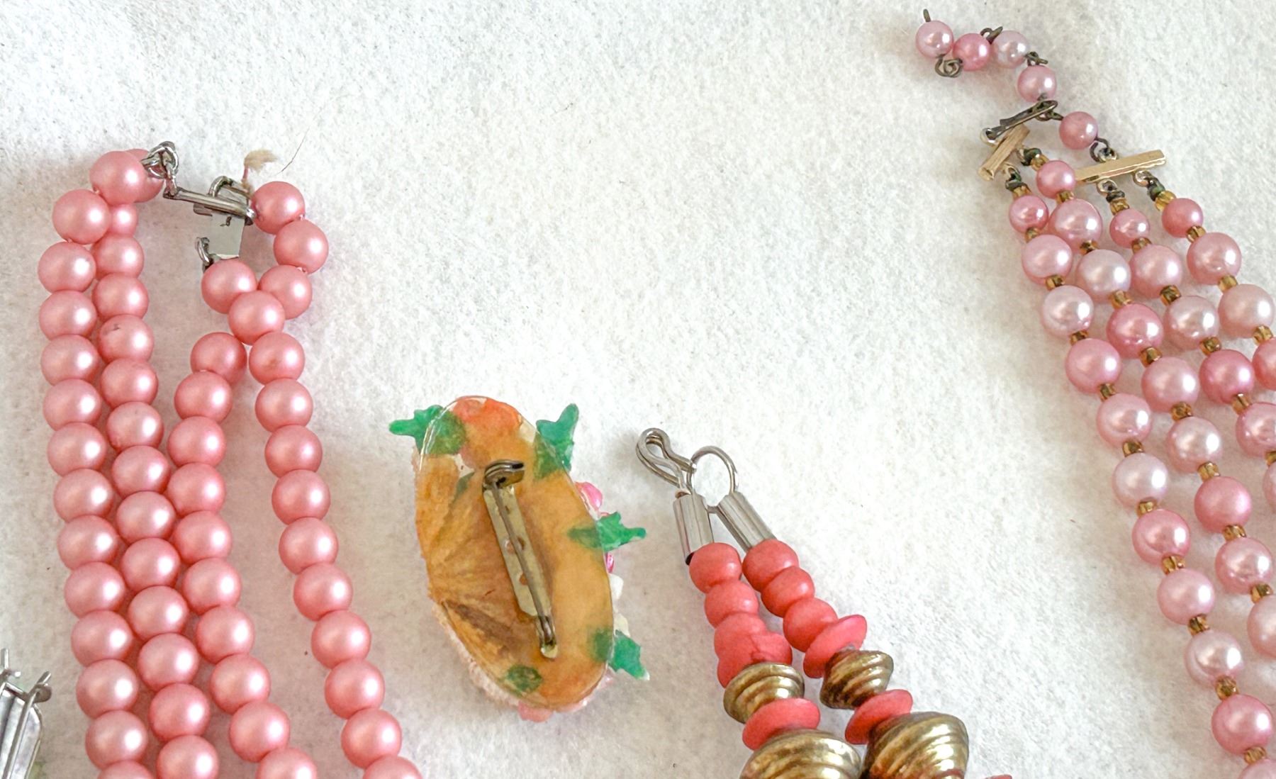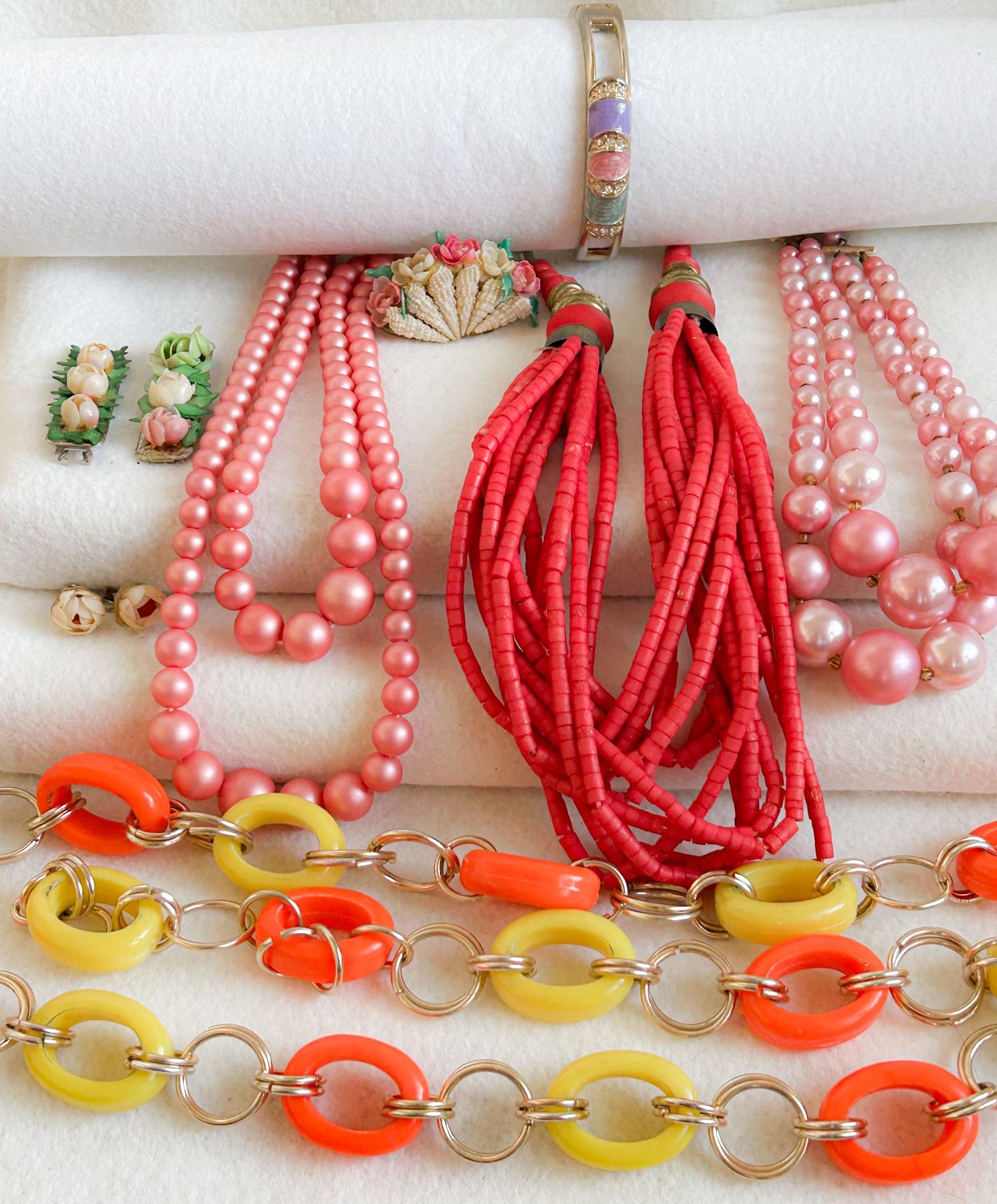 Charming assortment of vintage costume jewelry featuring shell-crafted floral brooches, pink faux pearl necklaces, coral red beaded tassel earrings with brass details, and a playful yellow-and-orange lucite chain necklace. Lovely mix of natural shell and mid-century resin materials in bold, cheerful tones.