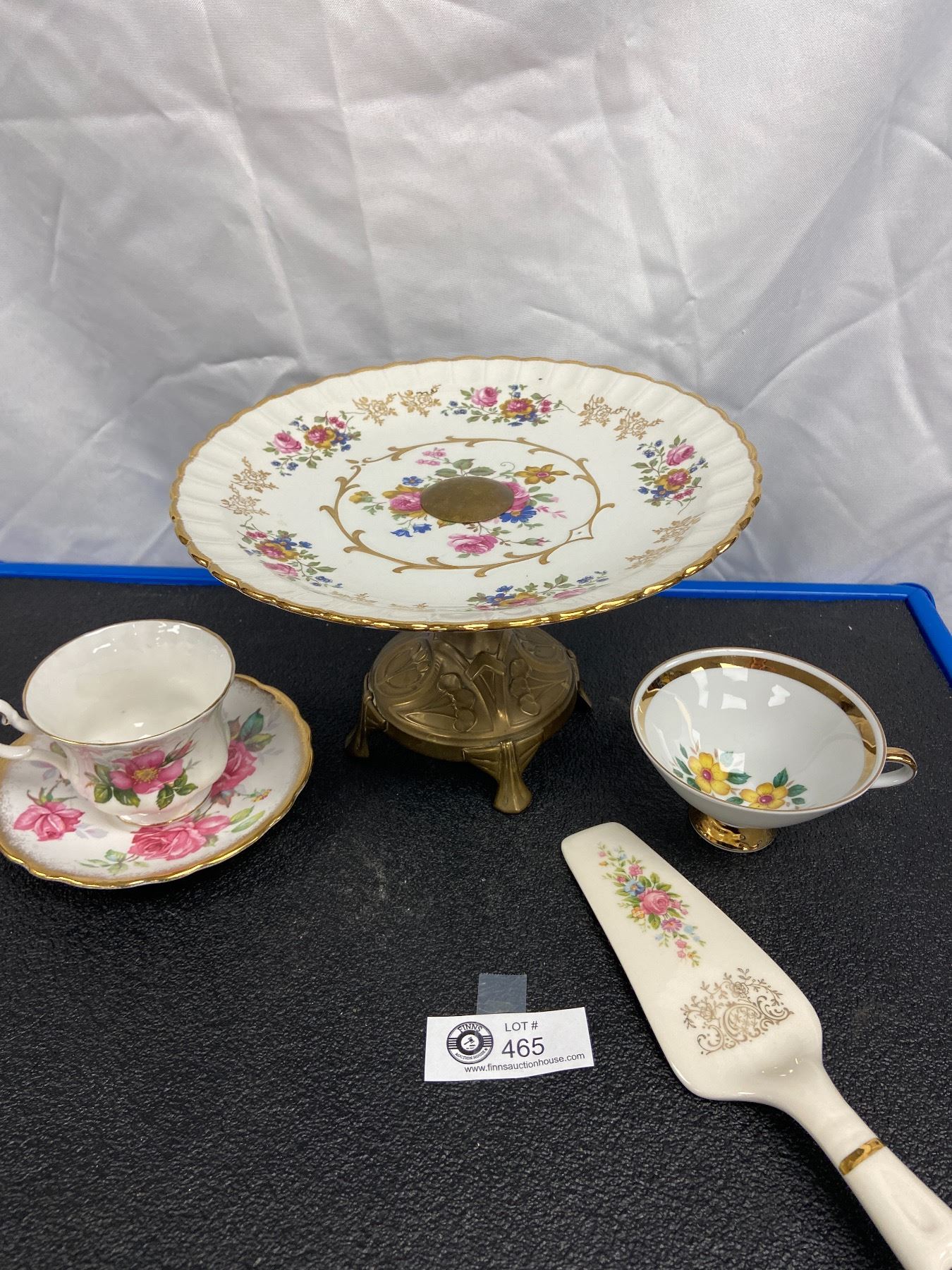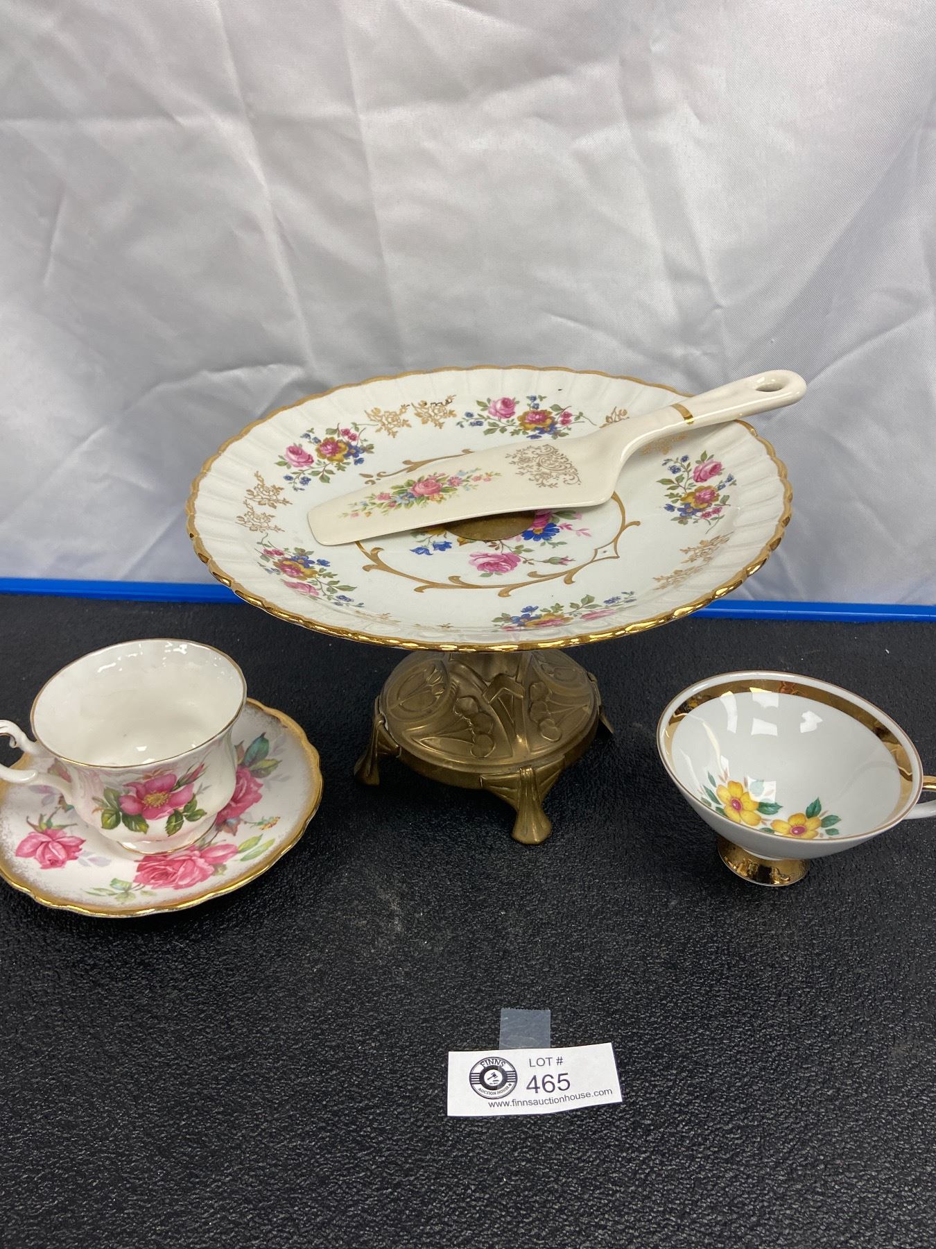 Lot of Vintage Dishes. Brass Pedestal Cake Plate,Bone China Knife and mismatched Tea Cup Set