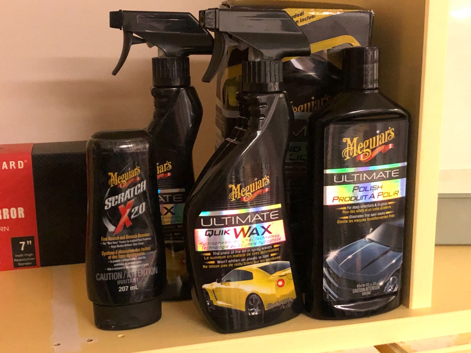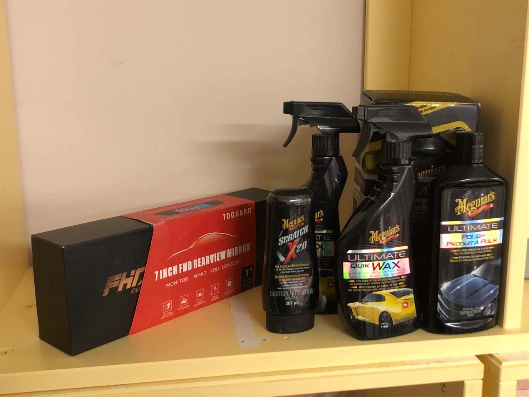 Lot of misc car items including - Ultimate wax, Ultimate polish, 7 in. rear view mirror monitor, scratch remover, wax, etc...