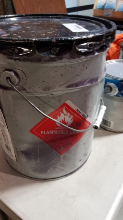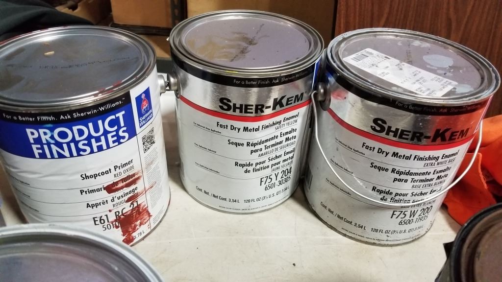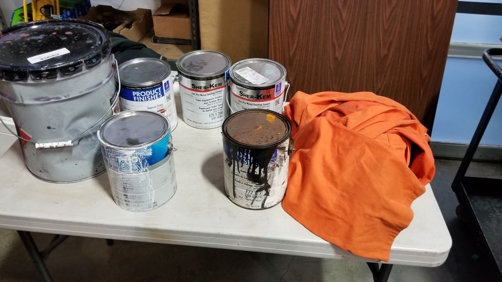 Lot of shop coat primer and other paint with 2 pairs of coveralls
