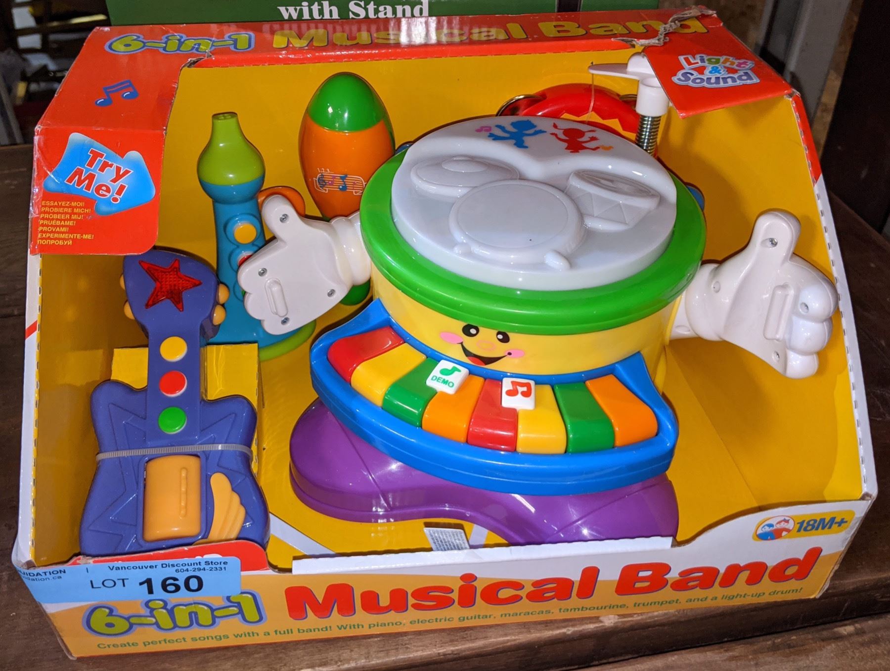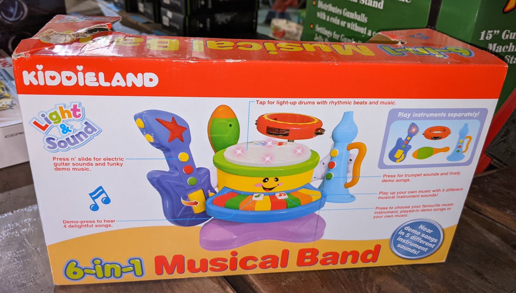 Lord of two toys including six in one musical band and old fashioned gumball machine and Bank with stand