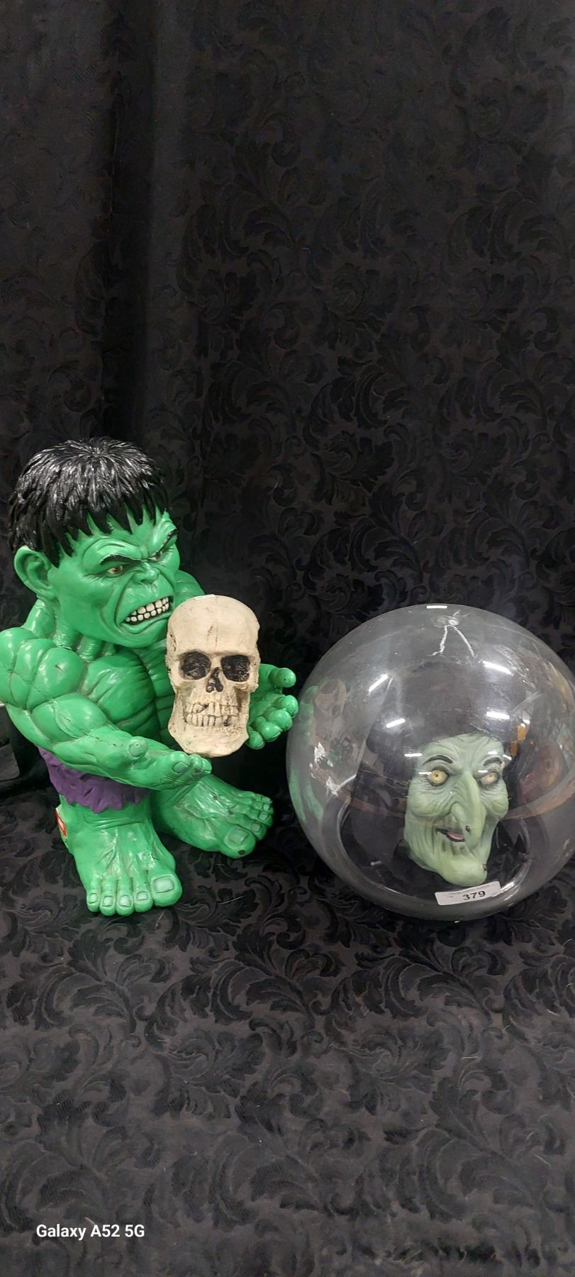 Lot of vintage collectable Halloween items, Hulk, witch's head & skull