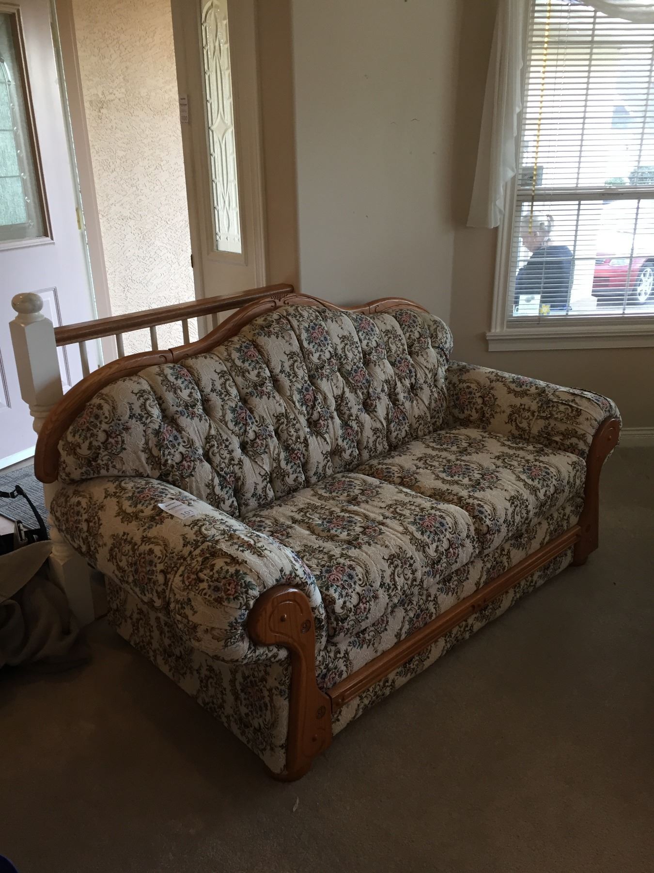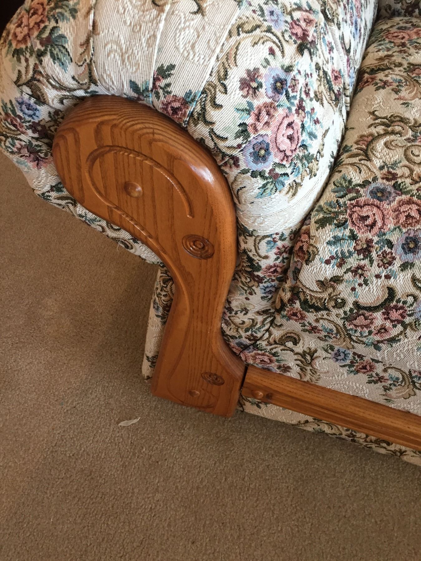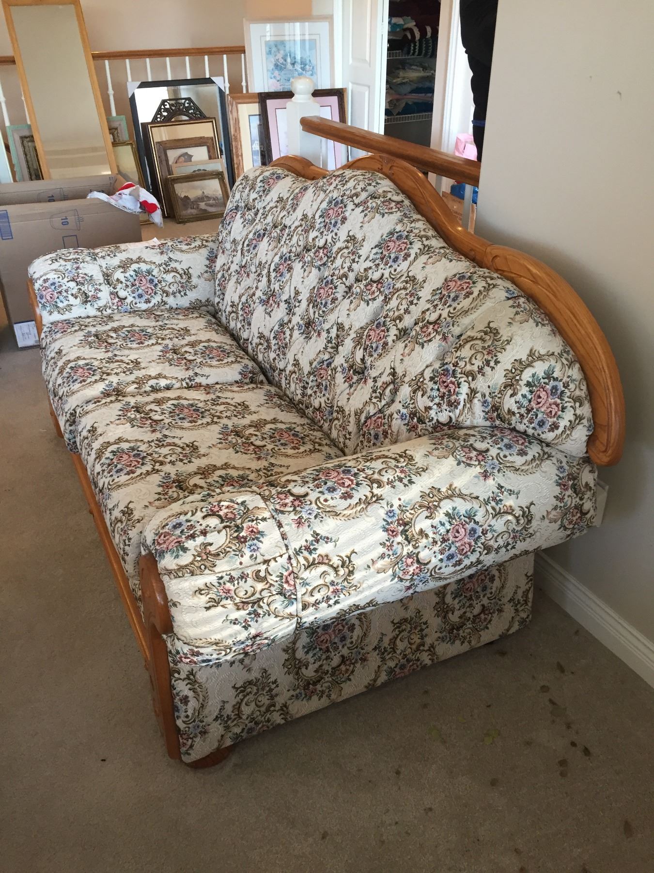 Love seat with oak wood detail, please note that the wood detail on top of love seat is loose. 68x33x37 Matches lot 102 & 107 Come to pick up at Category C time slot (11:00 am - Noon)