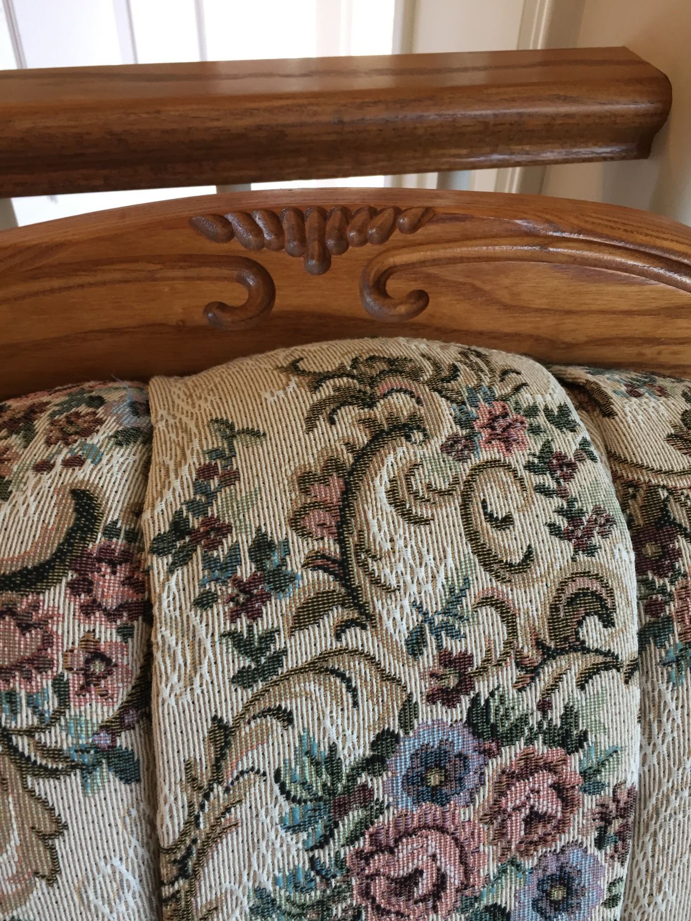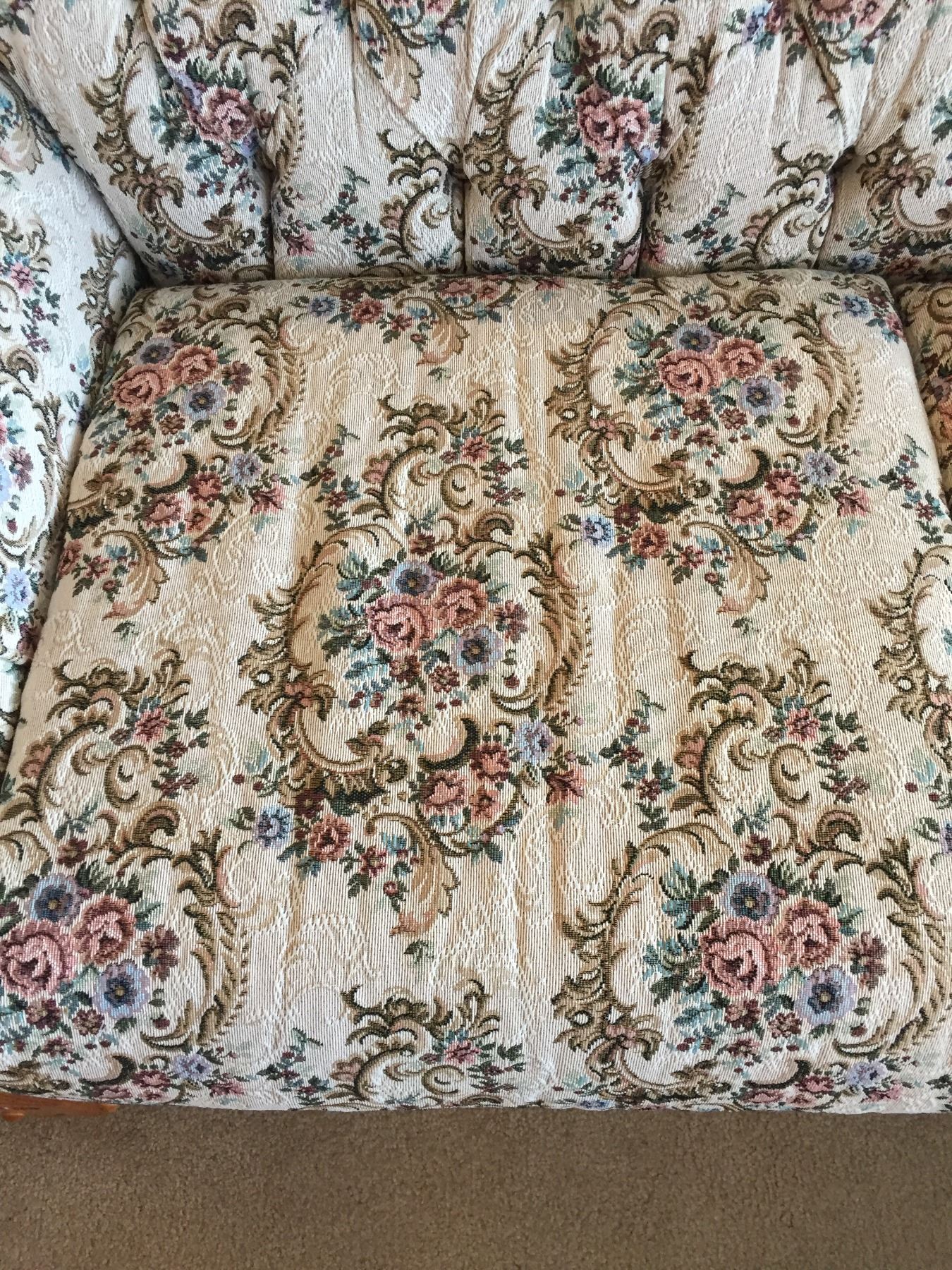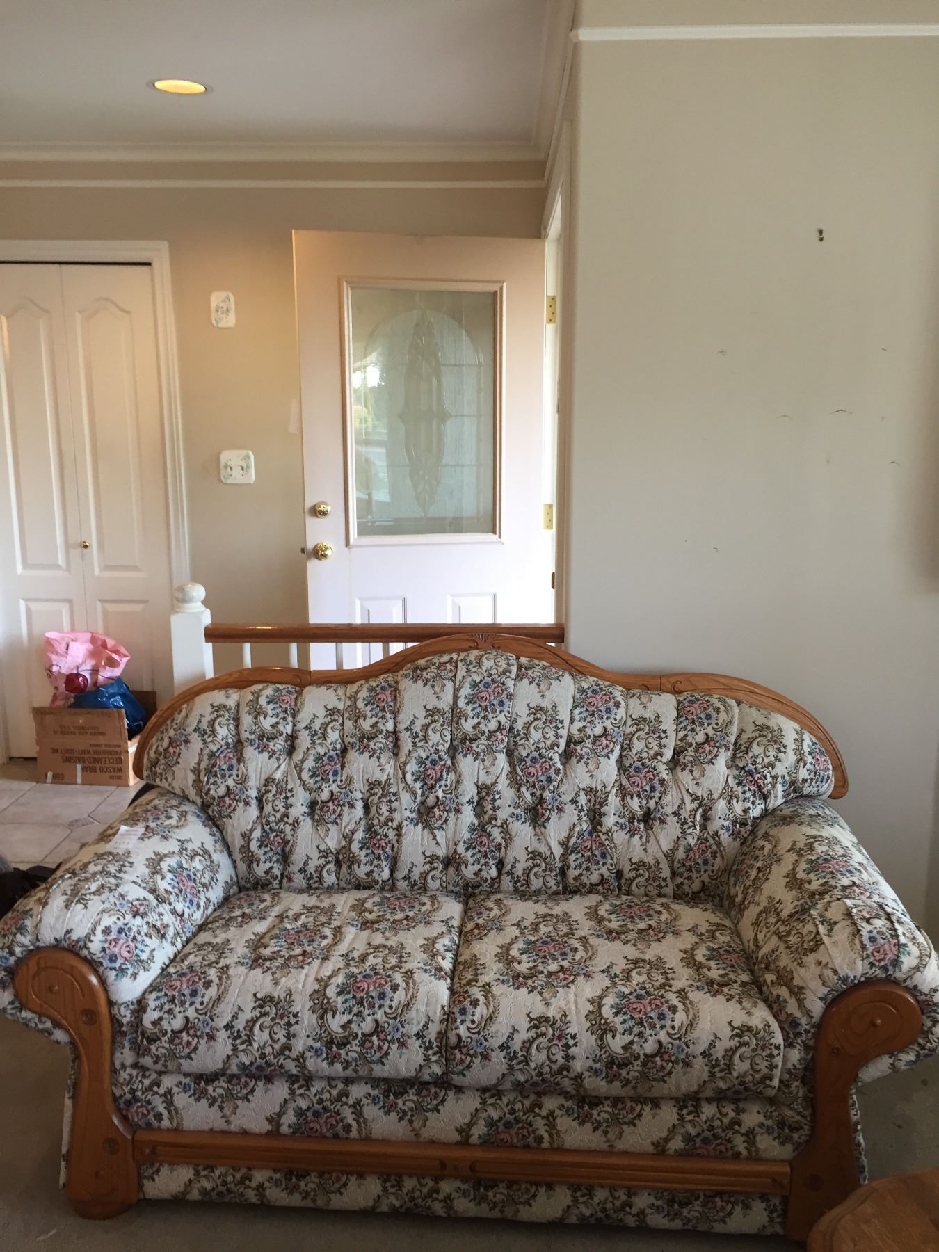 Love seat with oak wood detail, please note that the wood detail on top of love seat is loose. 68x33x37 Matches lot 102 & 107 Come to pick up at Category C time slot (11:00 am - Noon)