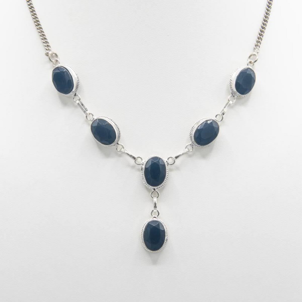 Lovely 4 Piece Blue Sapphire Jewelry Set. These lab made sapphires includes an 18" 53 ct necklace, 8"bracelet, earrings and finger ring size 61/2. Mounted in .925 sterling silver overlay.Gram total weight is approximately 47.1 grams or for all 4 pieces.