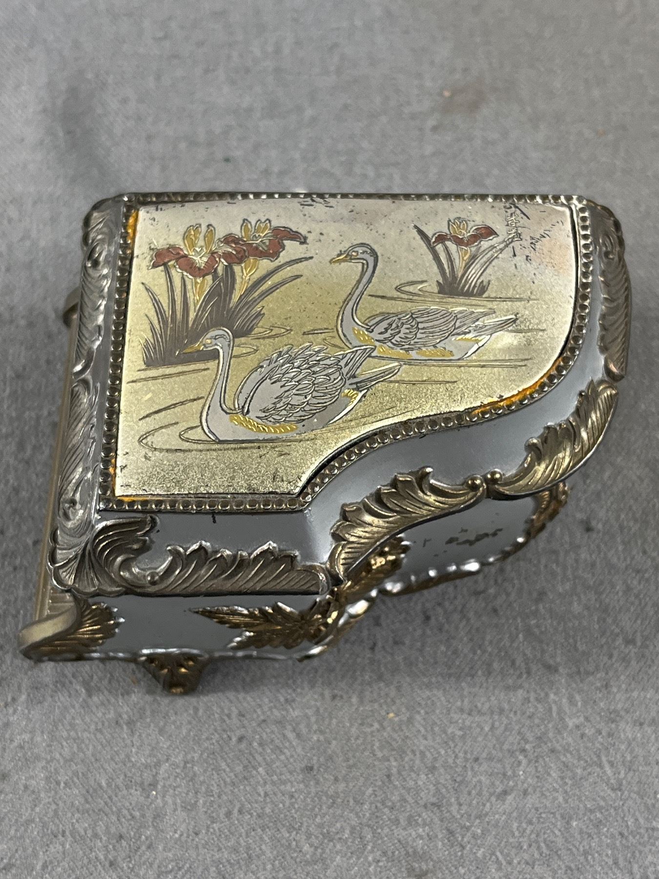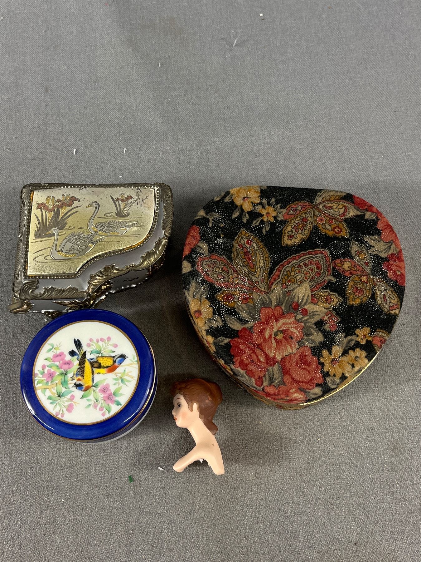 Lovely Vintage Jewel Box, Metal Music Box, Porcelain Trinket Box & Lady Head From Pin Cushion